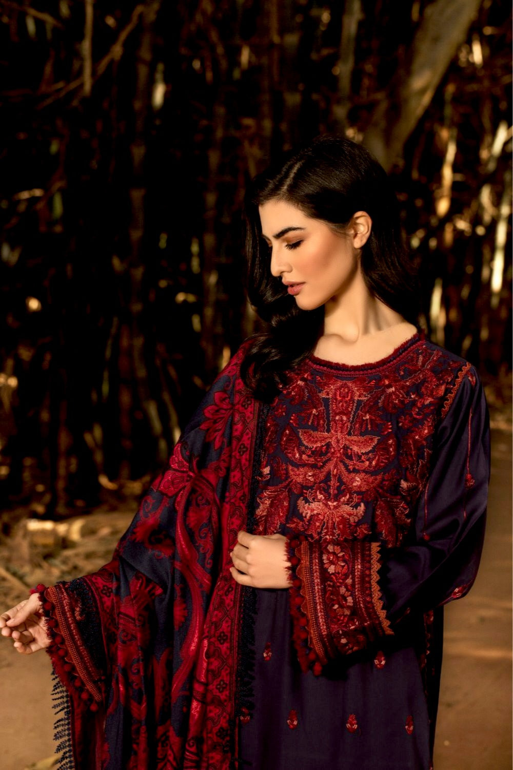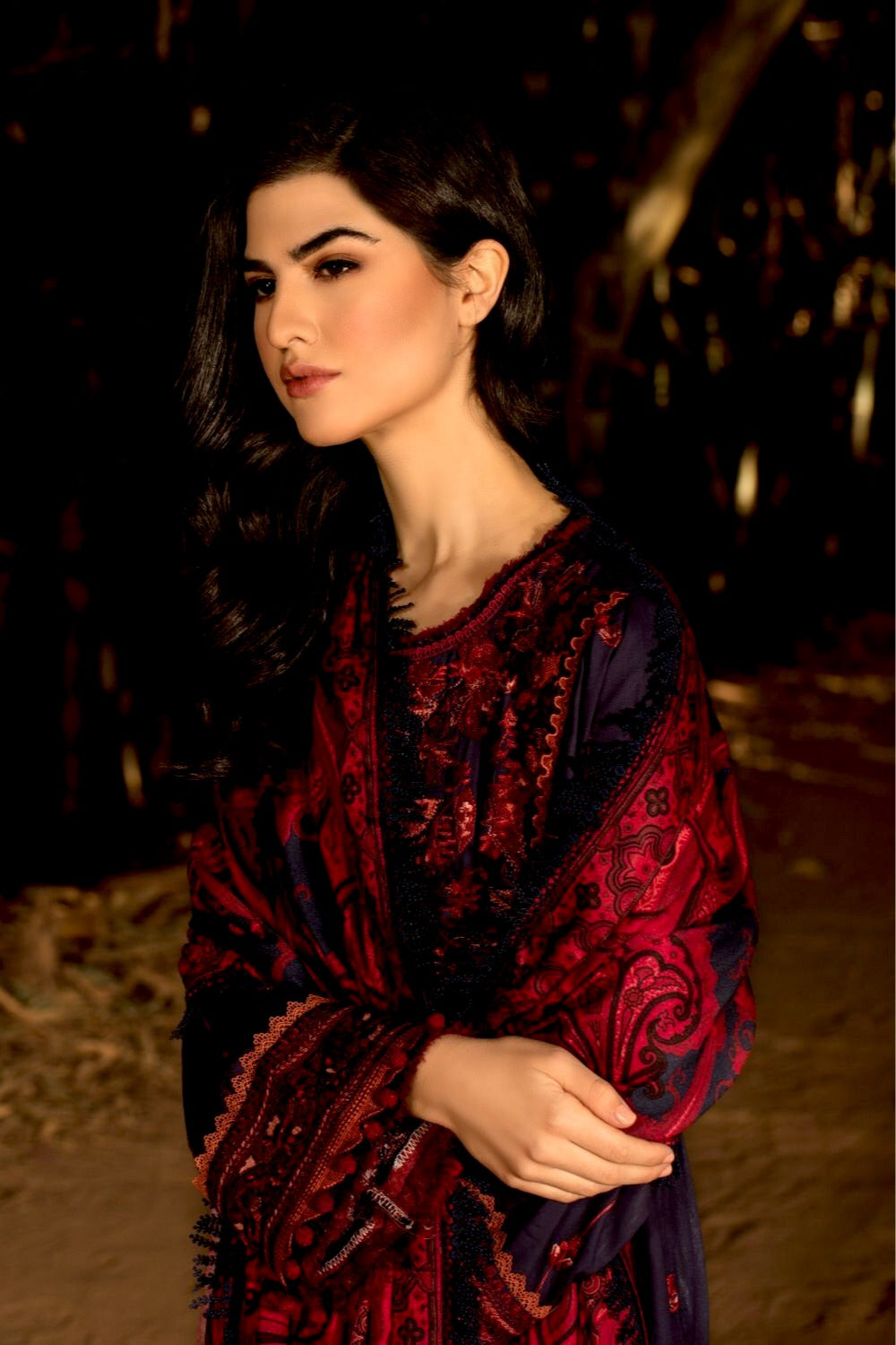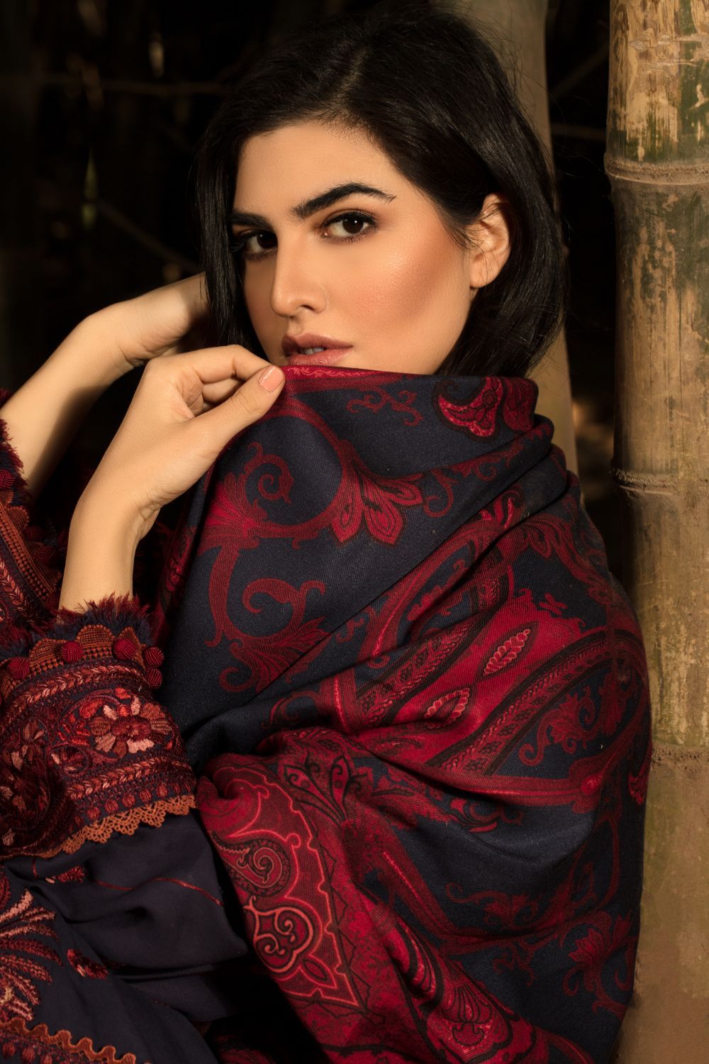 Fabric: Embroidered Front Center Panel (Rib Cotel) Embroidered Left Right-Side Panels (Rib Cotel) Embroidered Daman Border (Rib Cotel) Embroidered Sleeves Border (Rib Cotel) Embroidered Sleeves (Rib Cotel) Plain Dyed Trouser (Rib Cotel) Plain Dyed Back (Rib Cotel) Printed Shawl (Dobby Shawl) (Extra Laces And Hangings Are Not Included) |