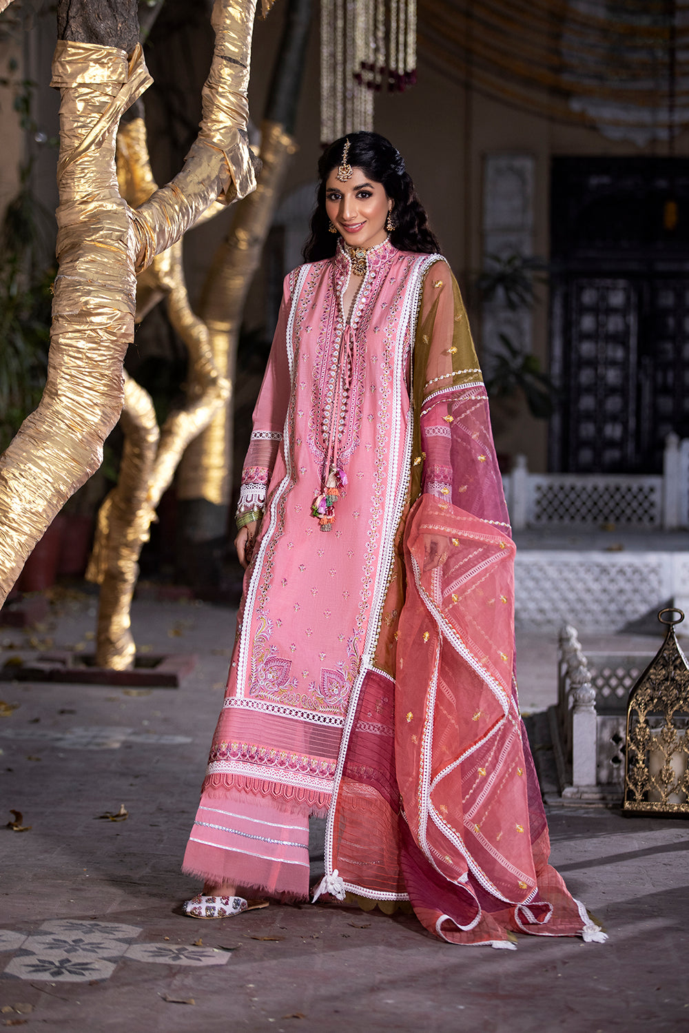 Fabric: Embroidered Front Centre Panel Embroidered Side Panels Embroidered Borders Plain Dyed Back Plain Dyed Sleeves Plain Dyed Trouser Embroidered Organza Dupatta |