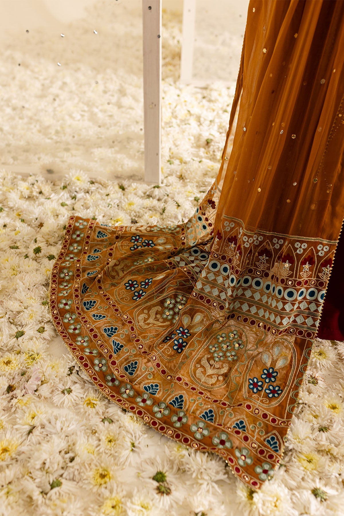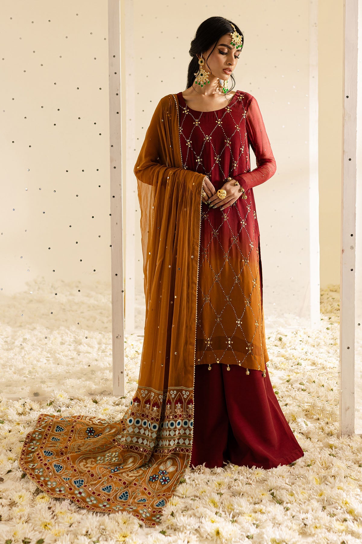 Summary: The Nureh Mukeshkari Luxury Chiffon Formals – MK-09 is a stunning ensemble perfect for making a statement at any formal occasion. This unstitched three-piece suit features a beautifully crafted maroon chiffon shirt with an elegant ombre effect transitioning to a lighter shade. The delicate Mukesh work adds a touch of shimmer and sophistication to the overall design, creating a captivating look. This luxurious chiffon fabric drapes gracefully and offers both comfort and style. The matching Mukesh chiffon dupatta complements the shirt beautifully and adds a touch of traditional charm. The outfit is completed with plain dyed raw silk trousers, providing a rich contrast to the sheer chiffon. This Pakistani suit is perfect for weddings, parties, or any special event where you want to look your best. As it's an unstitched piece, you have the freedom to tailor it to your exact measurements and desired style. The MK-09 is a truly exquisite piece that will make you feel confident and glamorous. The outfit embodies both traditional elegance and modern flair, making it a must-have for any fashion-conscious woman.