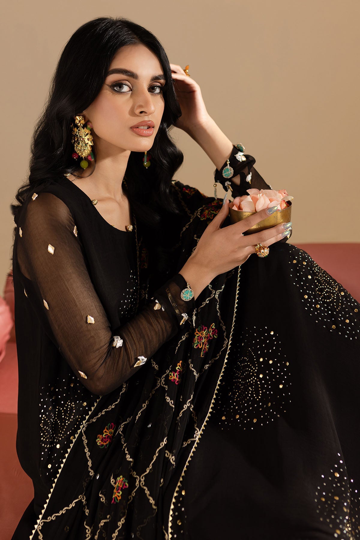 Summary: The Nureh Mukeshkari Luxury Chiffon Formals – MK-12 is a stunning ensemble perfect for making a statement at any formal event. This unstitched three-piece suit features a luxurious black chiffon shirt adorned with delicate Mukesh embroidery. The sheer chiffon sleeves add a touch of elegance and allow for a peek at the inner lining, while the solid black color offers a versatile base for styling. Crafted from high-quality chiffon, the shirt drapes beautifully and provides comfort and breathability, making it ideal for spring or summer occasions. The accompanying dupatta is also made of Mukesh chiffon, boasting intricate embroidery that complements the shirt's design. The plain dyed raw silk trousers provide a rich contrast in texture and complete the look with a touch of sophistication. This unstitched suit allows you to tailor the fit and style to your individual preferences. Whether it's a wedding reception, an engagement party, or any other special occasion, this Nureh creation is sure to make you the center of attention. The suit includes an unstitched inner lining for added comfort and modesty. Note: This description focuses solely on the shirt as per instructions, excluding any detailed description of the dupatta, trousers, or embellishments.