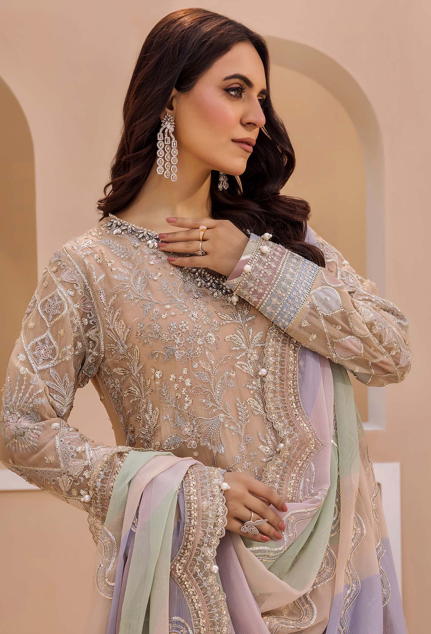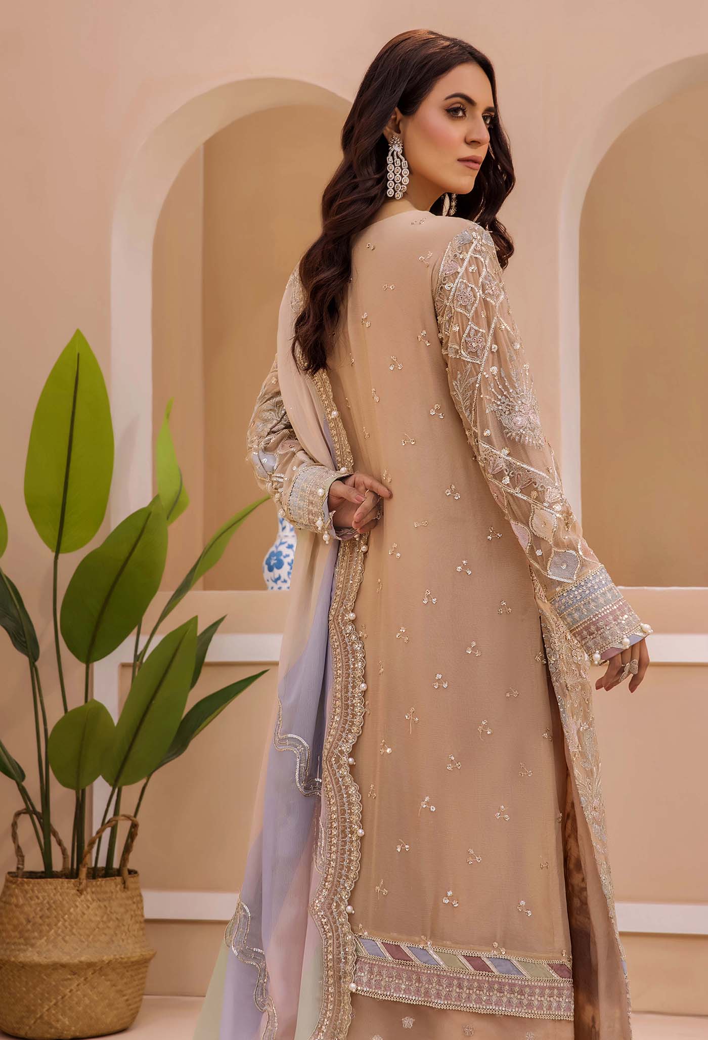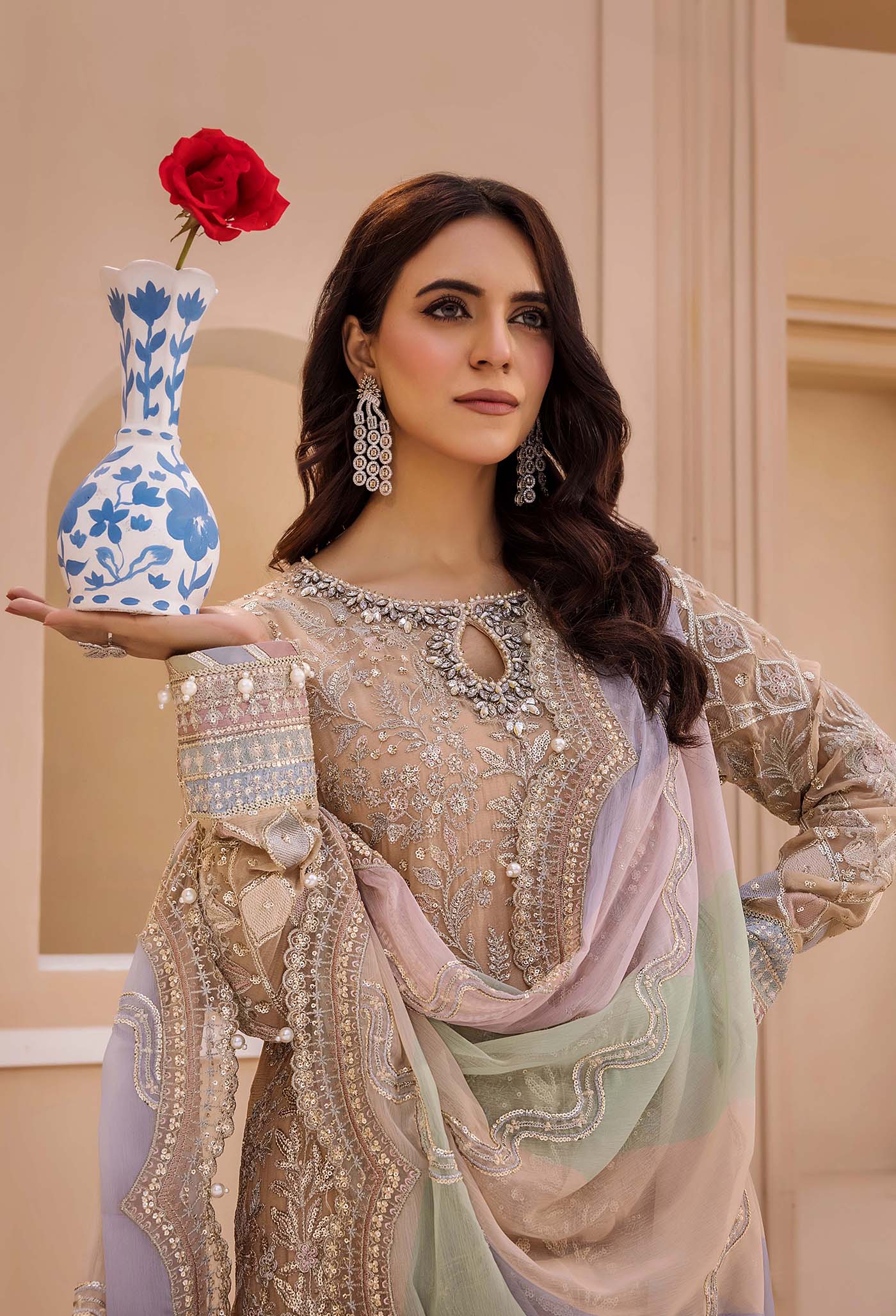 Summary: The ZA Chantelle Semi-Stitched Festive Formals – 102 is a sophisticated and elegant Pakistani suit perfect for formal events. Crafted from delicate chiffon, the semi-stitched shirt boasts intricate embroidery and hand embellishments in a beautiful beige tone. This allows for a customized fit to flatter your silhouette. The embroidered chiffon dupatta complements the shirt perfectly, adding a touch of grace and charm. The ensemble is completed with dyed raw silk trousers, adding a rich texture and luxurious feel to the outfit. This outfit is perfect for making a statement at festive gatherings or special celebrations. The semi-stitched nature of the shirt allows you to personalize the fit and style, while the ready-to-wear dupatta provides effortless elegance. The luxurious fabric and exquisite embroidery make it an exceptional choice for those seeking a refined and glamorous look. Embrace timeless elegance with this stunning ensemble and exude confidence and style at your next formal event. Ideal for weddings, parties, or any special occasion, this Pakistani suit offers a unique blend of traditional craftsmanship and contemporary design.