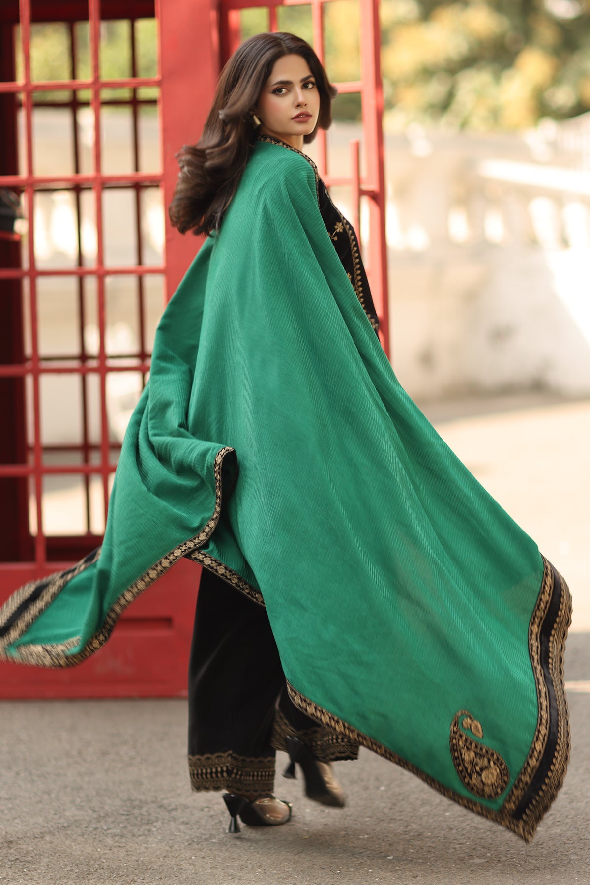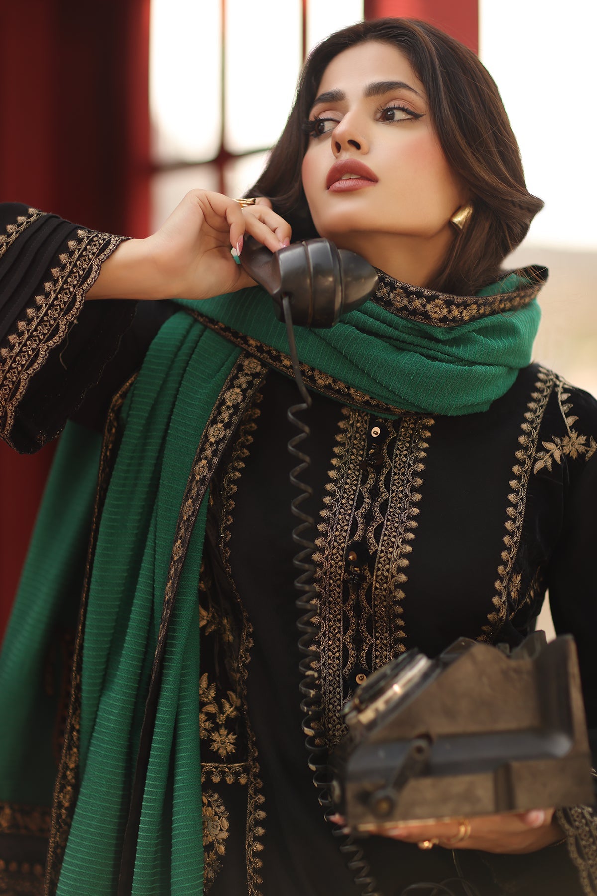 Summary: Embrace timeless elegance with this stunning black Pakistani suit from Charizma's Signature Winter collection. The kameez, crafted from a luxurious winter fabric, features exquisite golden-toned embroidery on the neckline, front panels, and hem, creating a look of sophisticated grace. The rich black canvas provides a perfect backdrop for the detailed motifs, making this ethnic wear a standout piece. As a quintessential piece of Fall/Winter formal wear, this dress is perfect for evening parties and festive celebrations. This formal Pakistani dress offers a blend of tradition and modern style, making it an ideal choice for your next special occasion.
