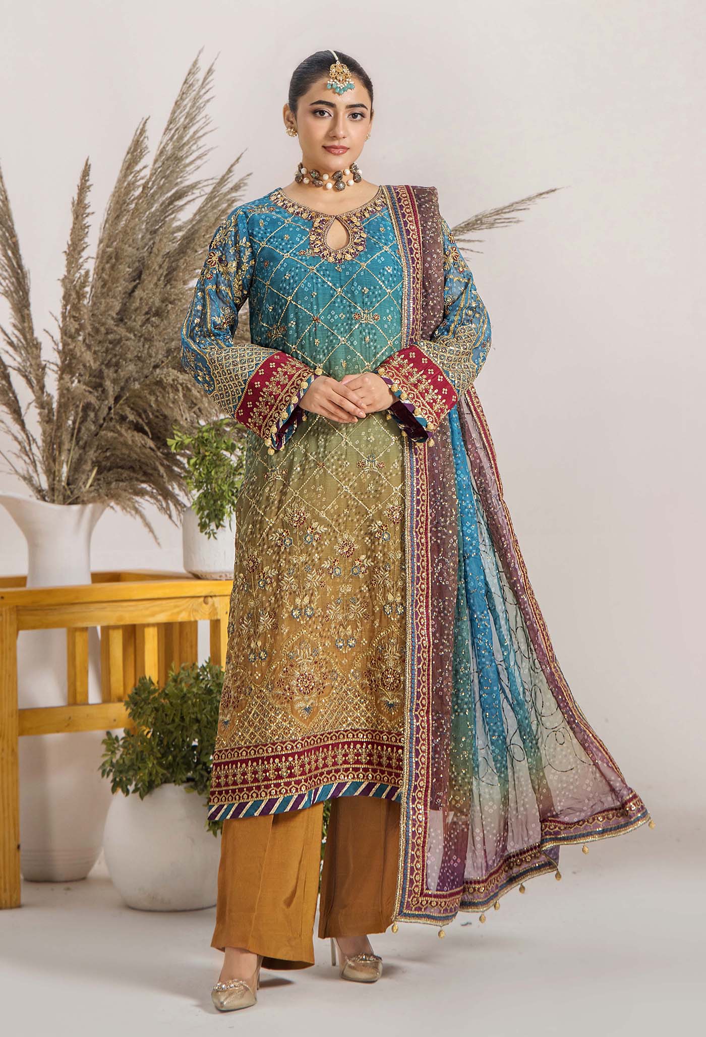Summary: Radiate sophisticated charm in this ZA Inova Chiffon Pakistani Suit, featuring a stunning ombre blend of Turquoise Blue and Mustard. The semi-stitched kameez is adorned with intricate embroidery and hand embellishments, making it a luxurious choice for festive occasions like Mehndi or Sangeet ceremonies. Crafted from airy Chiffon, this outfit offers comfort and style for Spring/Summer weddings. The design perfectly balances traditional artistry with modern flair, ensuring you stand out at any formal event. Complete with a matching embroidered dupatta, this ensemble defines elegance. Shop this must-have ethnic party wear dress today for a graceful look.