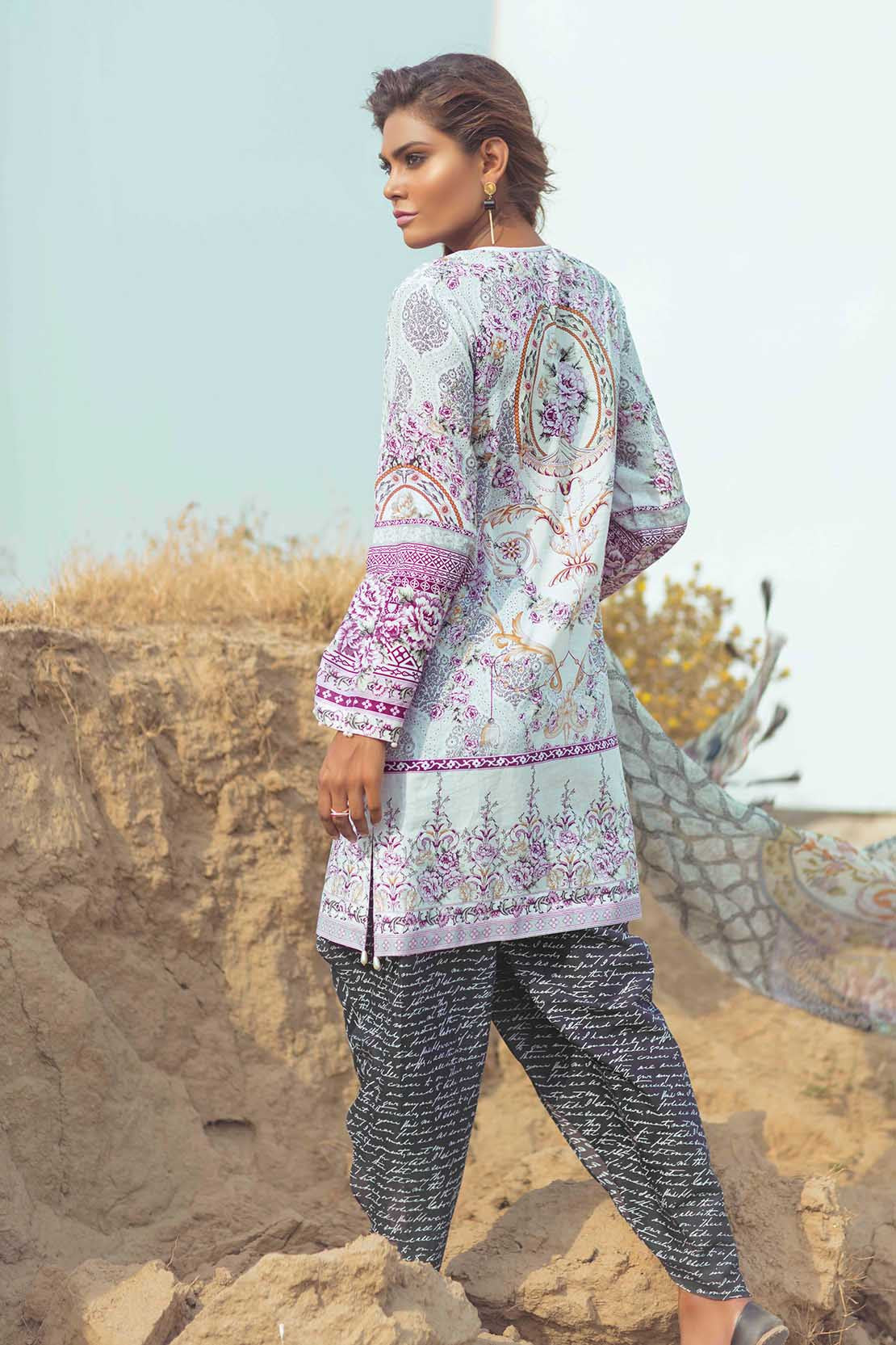 Fabric Rotary printed Lawn shirt and pants, with Chiffon dupatta and embroidered neckline patch