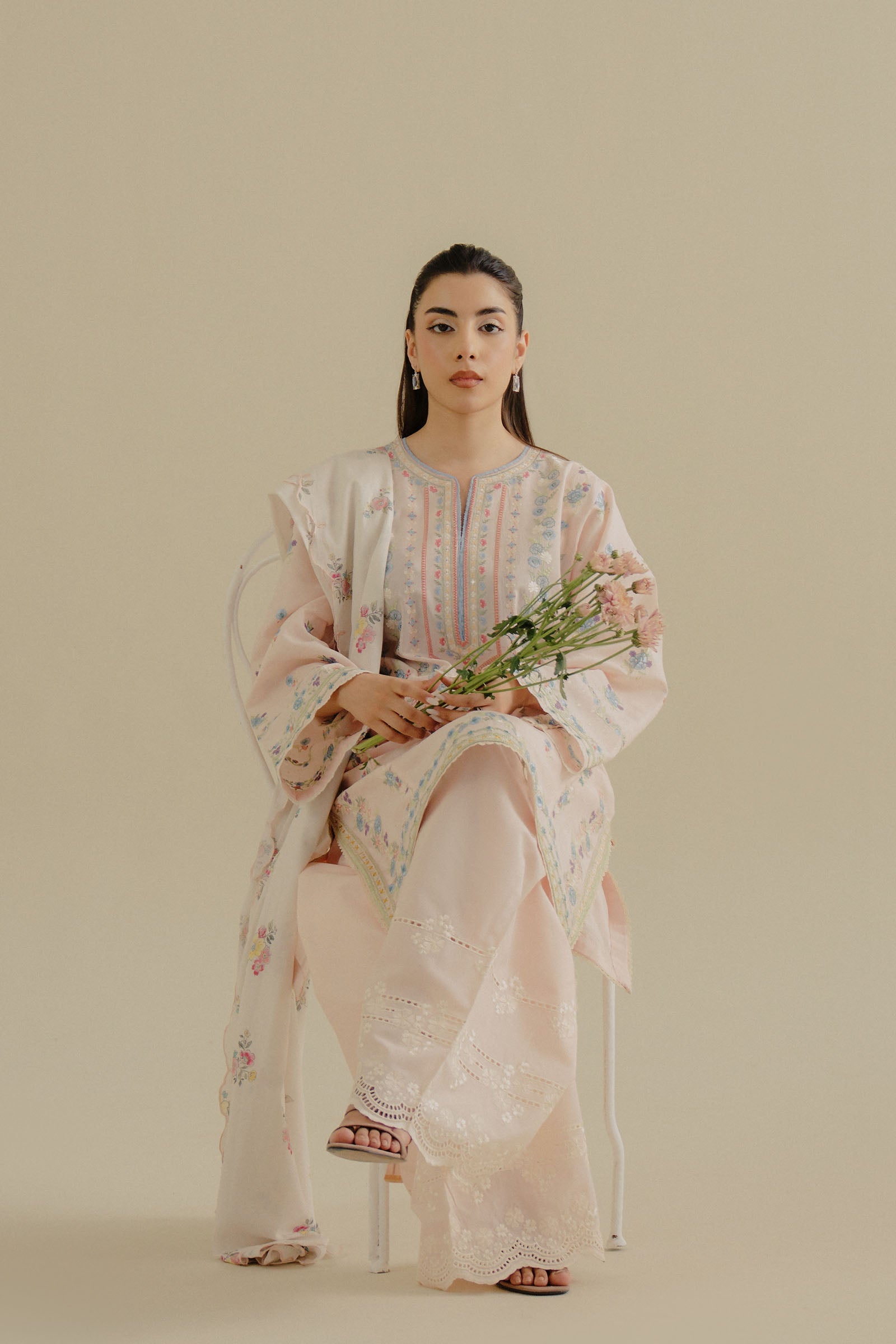 Fabric: The peachy pink jacquard, paired with a jacquard dupatta and composed embroidery, creates a soft yet sophisticated look with intricate detailing. Embroidered Jacquard Front Center Panel 1 Pc Embroidered Jacquard Front Right Side Panel 1 Pc Embroidered Jacquard Front Left Side Panel 1 Pc Embroidered Organza Left Right Chaak 2 Pcs Embroidered Jacquard Sleeves 0.66 Mtr Dyed Jacquard Back 1 Mtr Embroidered Organza Shirt Border-1 1 Mtr Embroidered Organza Shirt Border-2 2.33 Mtrs Embroidered Cambric Trouser 2 Mtrs Digital Printed Self-Jacquard Dupatta 2.5 Mtrs |
