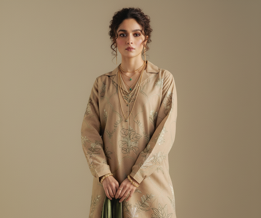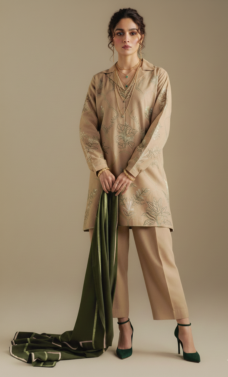 Summary: Discover timeless elegance with this Zara Shahjahan Pakistani suit from the Coco Fall/Winter collection. This ensemble features a sophisticated beige kameez crafted from premium Khaddar, a fabric renowned for its warmth and comfort, making it an ideal winter outfit. The shirt is styled with a contemporary collared neckline and is adorned with delicate, tonal floral embroidery across the front and sleeves. This unstitched ethnic wear piece offers a blend of traditional craftsmanship and modern design, perfect for formal daytime events or chic evening gatherings. A must-have for your winter wardrobe.