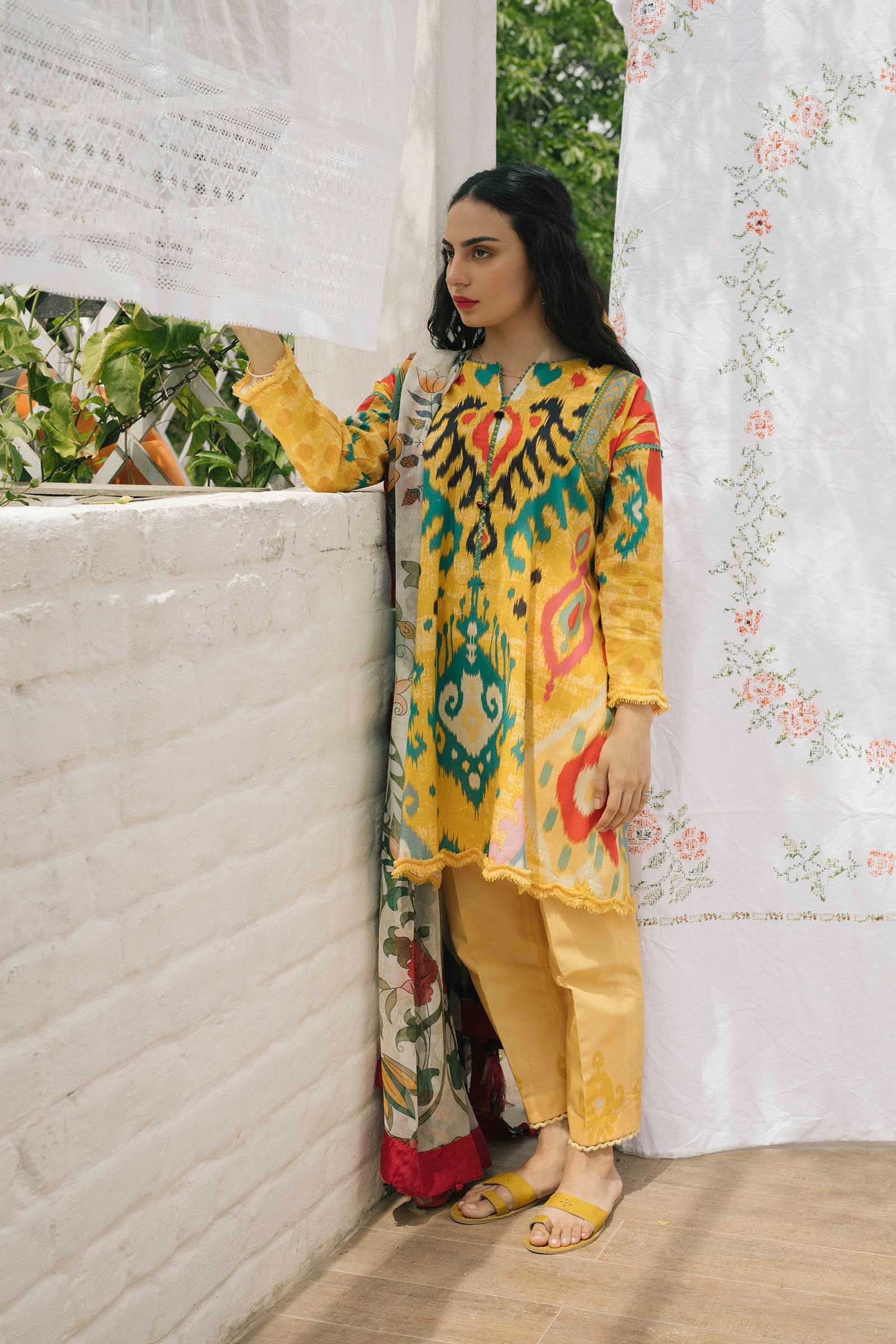 paired with a printed chiffon dupatta and printed cambric trouser.