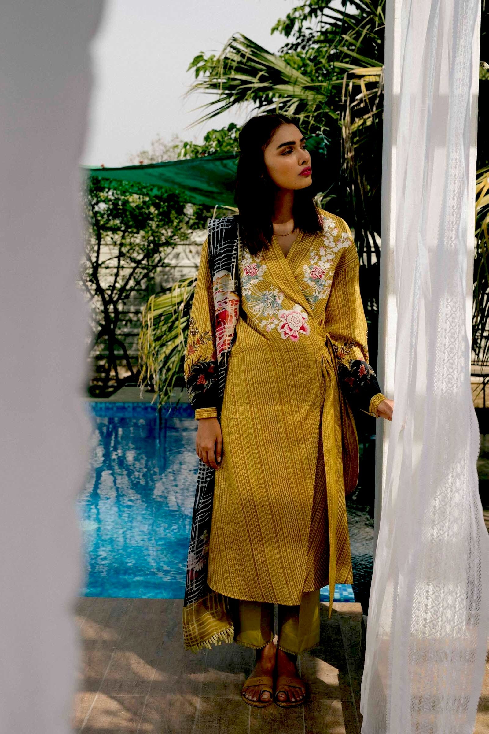 paired with a printed chiffon dupatta, with an additional embroidered neck patch and dyed Lawn trouser.
