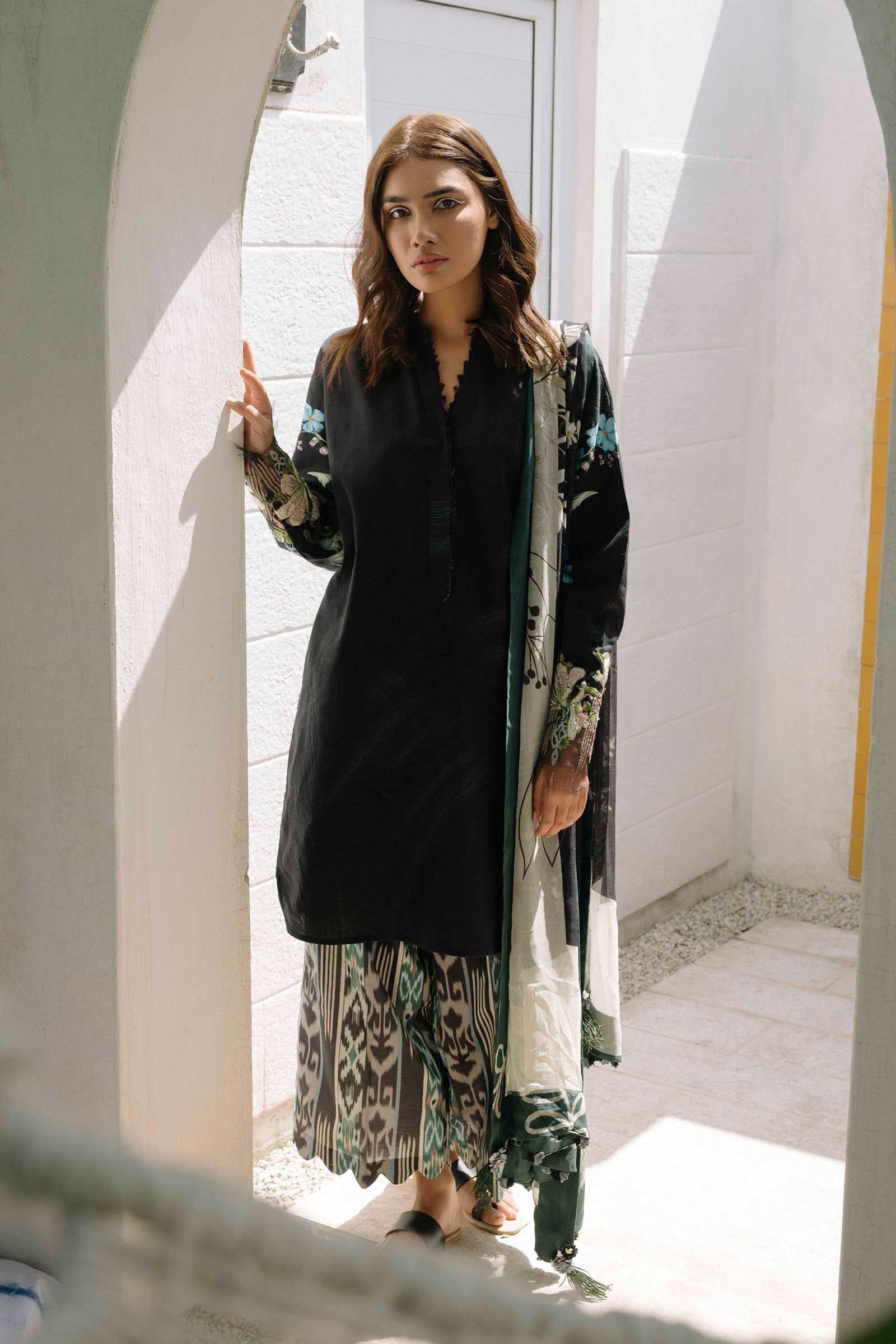 paired with a printed chiffon dupatta and printed cambric trouser.