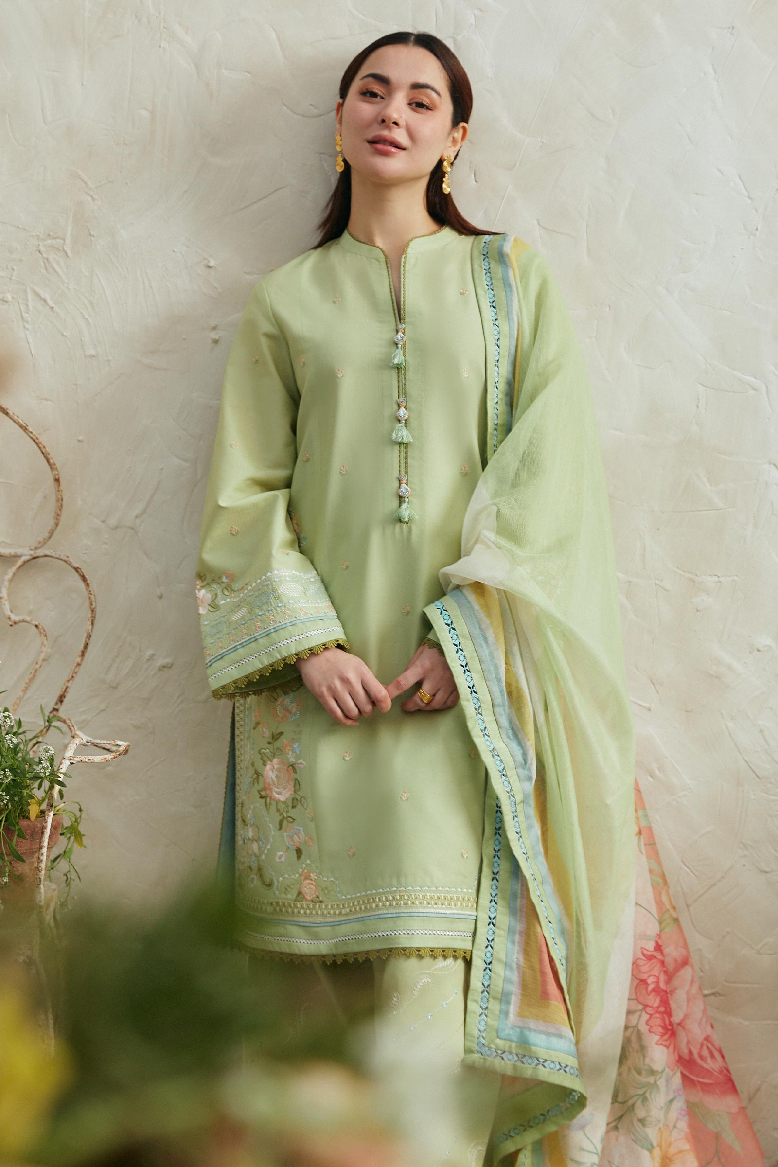 embroidery, paired with a cotton net printed dupatta,