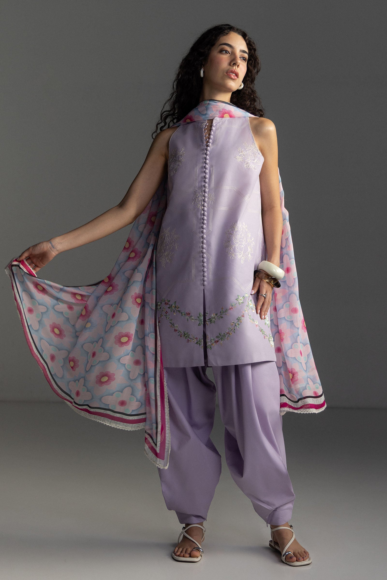 Fabric: A lilac embroidered shirt with geometric and floral details, paired with a dyed lilac trouser and finished with a printed lilac, blue and pink dupatta for a soft coordinated elegance. Embroidered Lawn Front Centre Panel 0.66 Mtrs Embroidered Lawn Front Left & Right Side Panels 13 Inches Embroidered Lawn Back 1.0 Mtr Embroidered Lawn Sleeves 0.66 Mtr Printed Chiffon Dupatta 2.5 Mtrs Dyed Cambric Trouser 2.0 Mtrs |