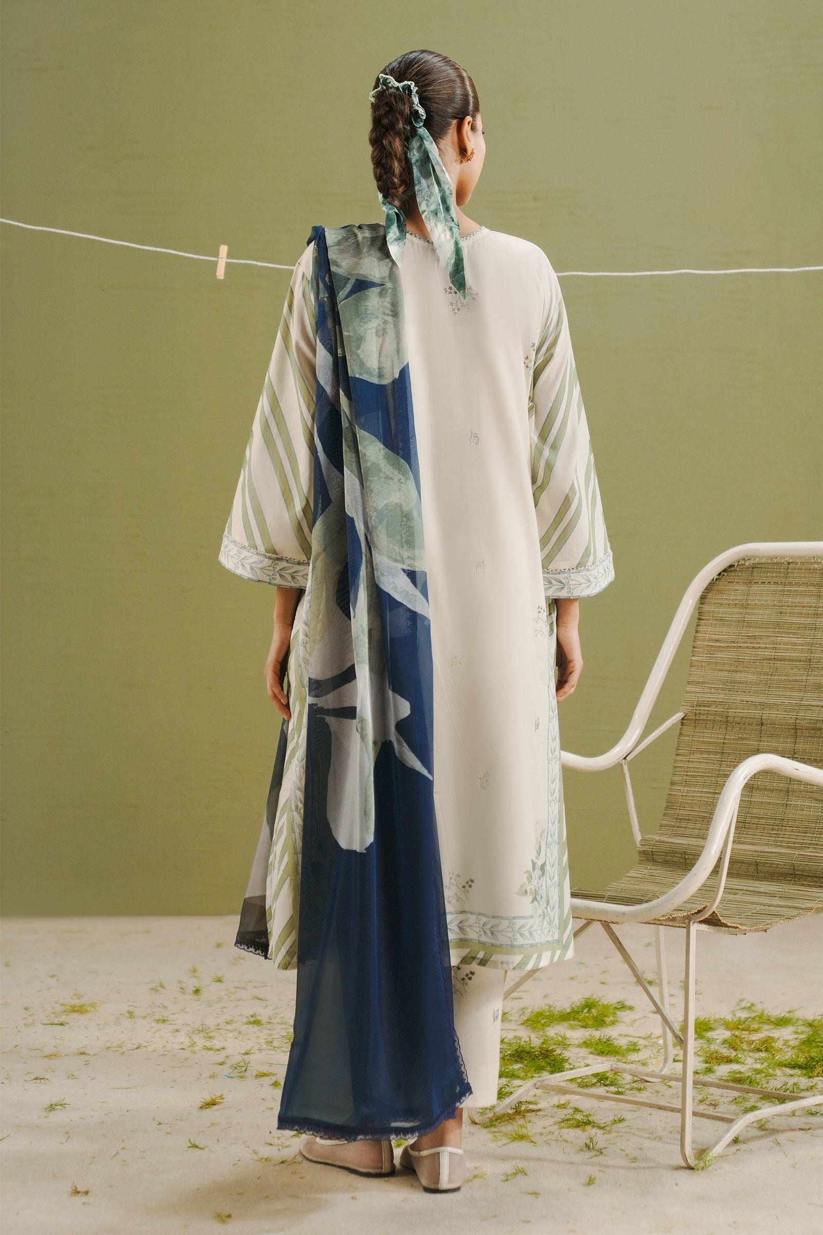 Fabric: An off-white dupatta is printed with delicate floral motifs. The shirt combines olive green stripes with floral detailing on an off-white base. The trouser feature a subtle floral print on off-white for a coordinated finish. Digital Printed Silk Dupatta 2.50 Mtrs Digital Printed Lawn Shirt 3.30 Mtrs Digital Printed Cambric Trouser 2 Mtrs |