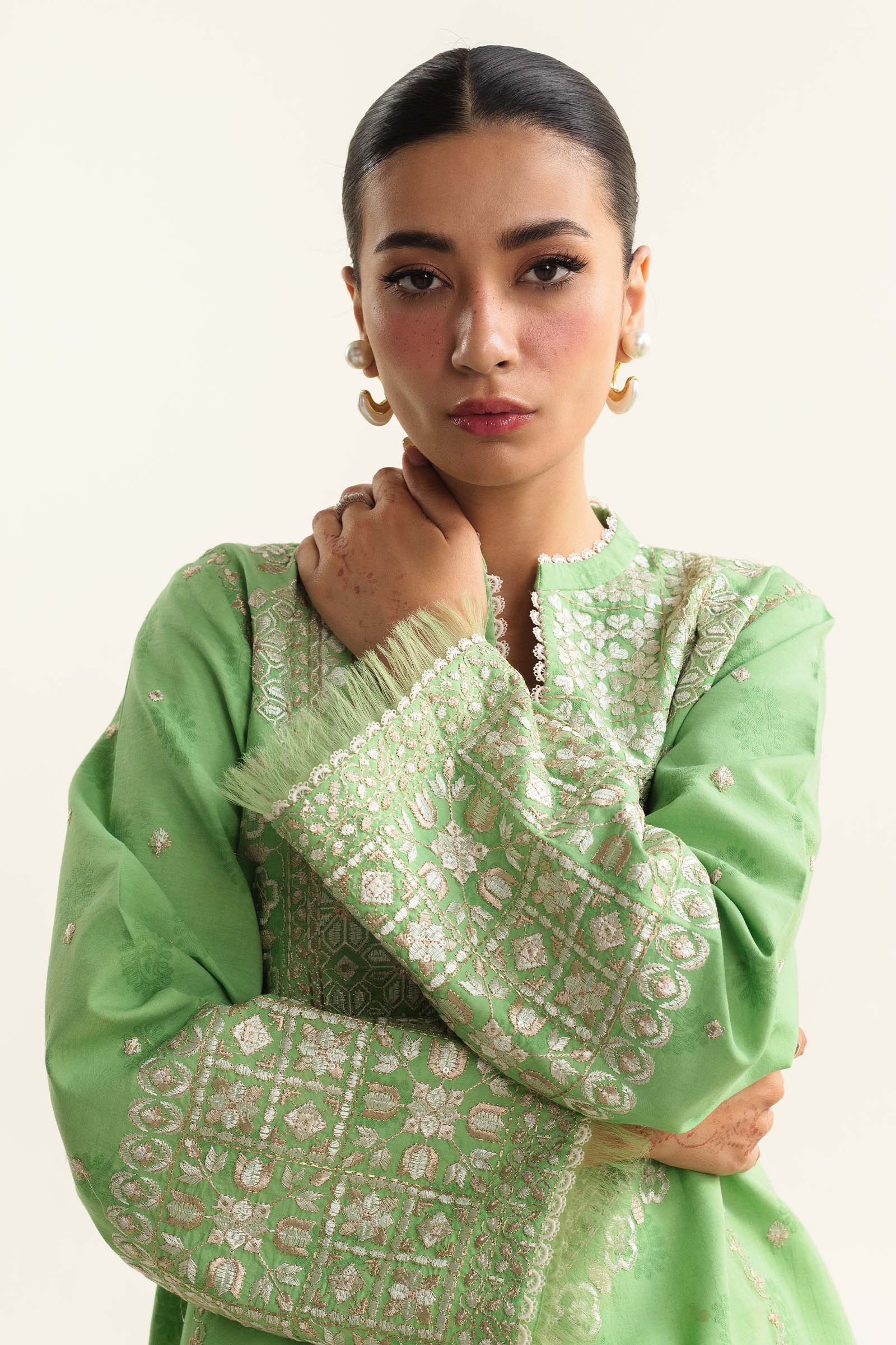 Fabric: Summer’s epitome of chic awaits in this stunning jacquard ensemble. Luxurious floral embroidery in vibrant green and white dances across the graceful shirt, perfectly paired with an embellished dupatta and cambric pants. It’s a masterpiece of timeless allure. Dyed Dupatta 2.65 Yards Embroidered Organza Dupatta Border 8.6 Yards Embroidered Organza Dupatta Border 2.6 Yards Embroidered Dyed Self jacquard Front 0.7 Yards Embroidered Dyed Self jacquard Back 0.7 Yards Embroidered Dyed Self jacquard Panel 0.7 Yards Embroidered Dyed Self jacquard Sleeves 1.6 Yards Embroidered Organza Border 2.5 Yards Embroidered Organza Border 1 Yards Embroidered Organza Motif 2 Pc Embroidered Organza Motif 4 Pc Embroidered Organza Trouser Motif 2 Pc Dyed Cambric Trouser 2.15 Yards |