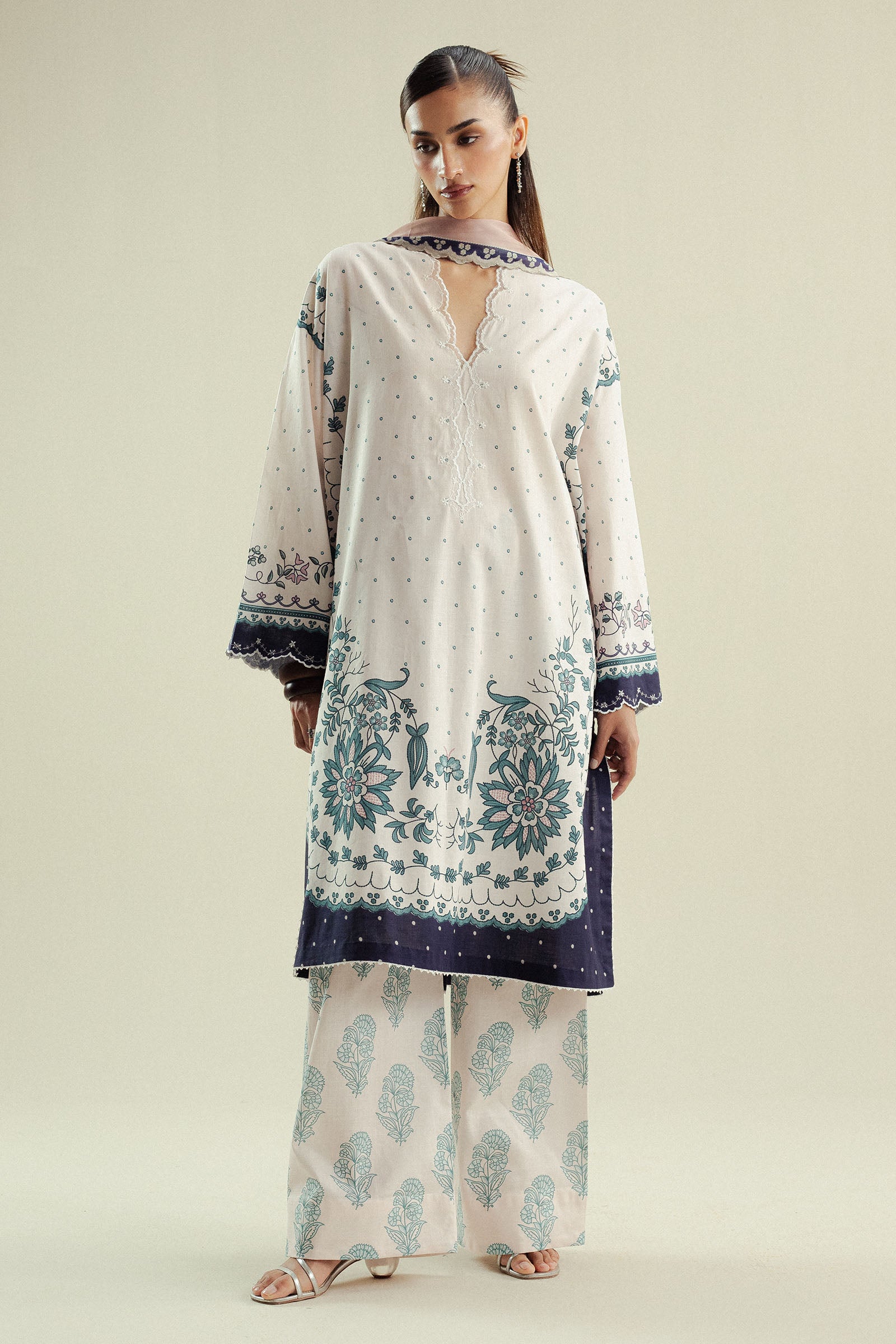 Summary: Embrace sophisticated charm with this Pakistani suit from the Zara Shahjahan Coco Prints Edit. The ensemble is centered around a pearl white kameez, beautifully crafted from breathable Slub Cotton, making it an ideal choice for the Spring/Summer season. This unstitched shirt is adorned with elegant blue embroidery and delicate printed motifs that create a serene, artistic look. As a versatile piece of ethnic wear, this Pakistani dress is perfect for formal daytime events, festive gatherings, or as a graceful Eid outfit. A perfect choice for those seeking understated elegance for their festive wardrobe.