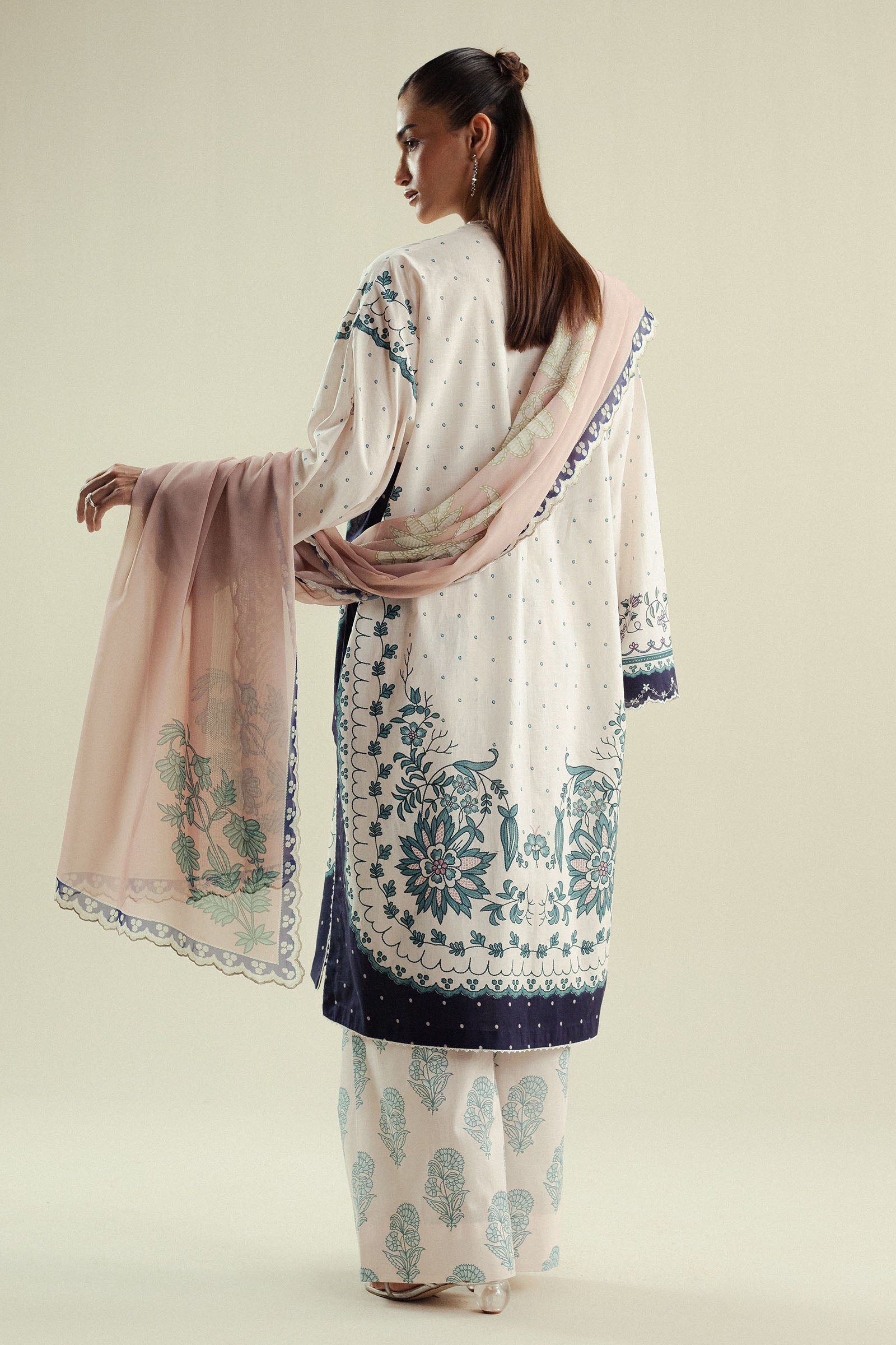 A pearl white shirt layered with shades of blue embroidery, paired with a printed trouser and a tea pink dupatta that softens the palette with graceful ease.