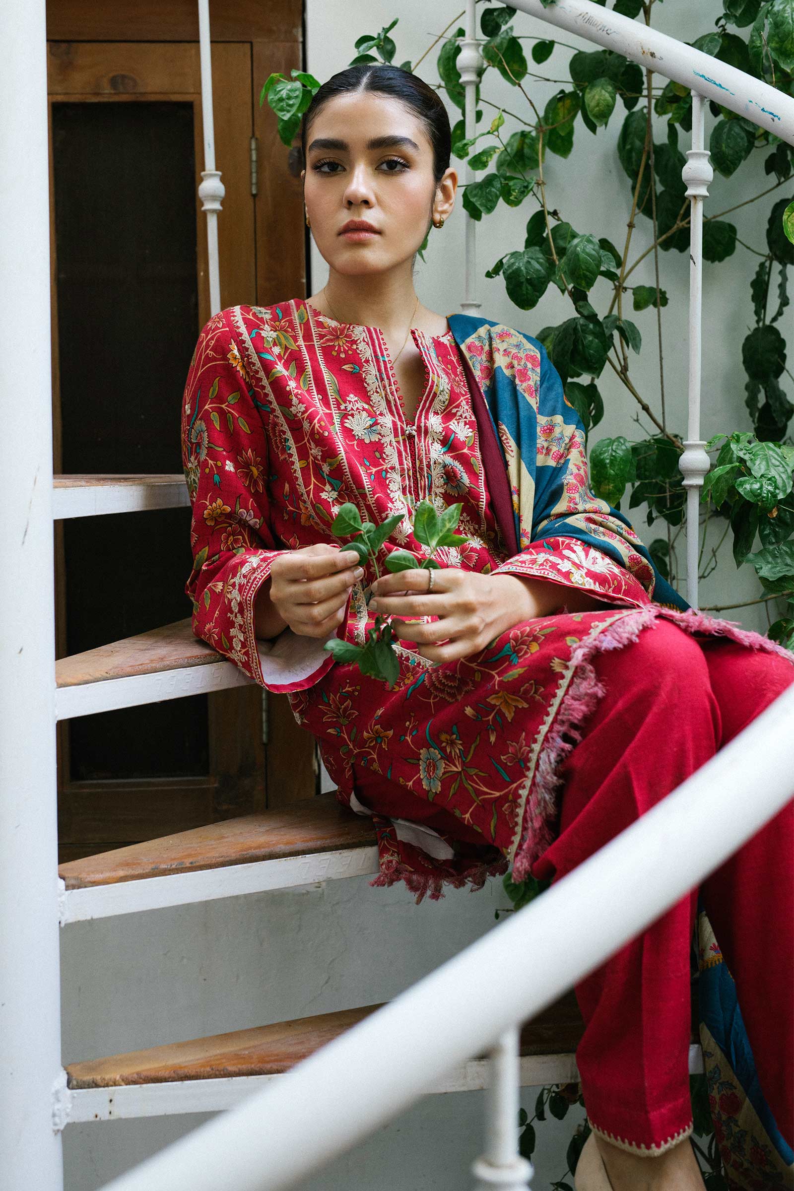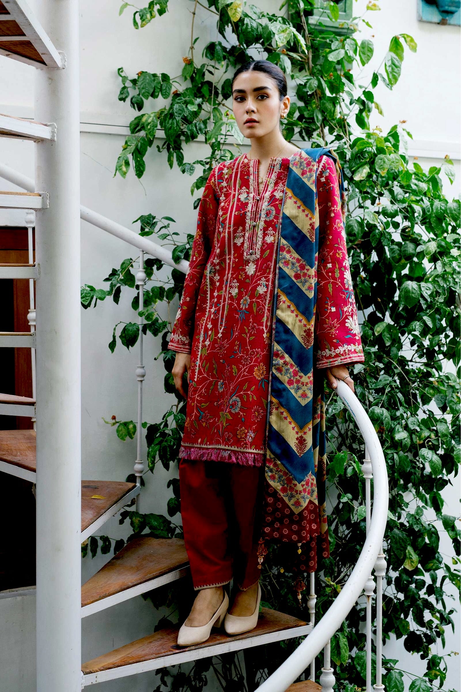 Fabric: Embroidered front on printed khaddar 1.32 Yards Printed khaddar back 1.32 Yards Embroidered sleeves on printed khaddar 1.4 Yards Embroidered ghera patti 1.6 Yards Embroidered pocket patches (2) Printed khaddar trouser 2.7 Yards Printed light linen dupatta 2.65 Yards |