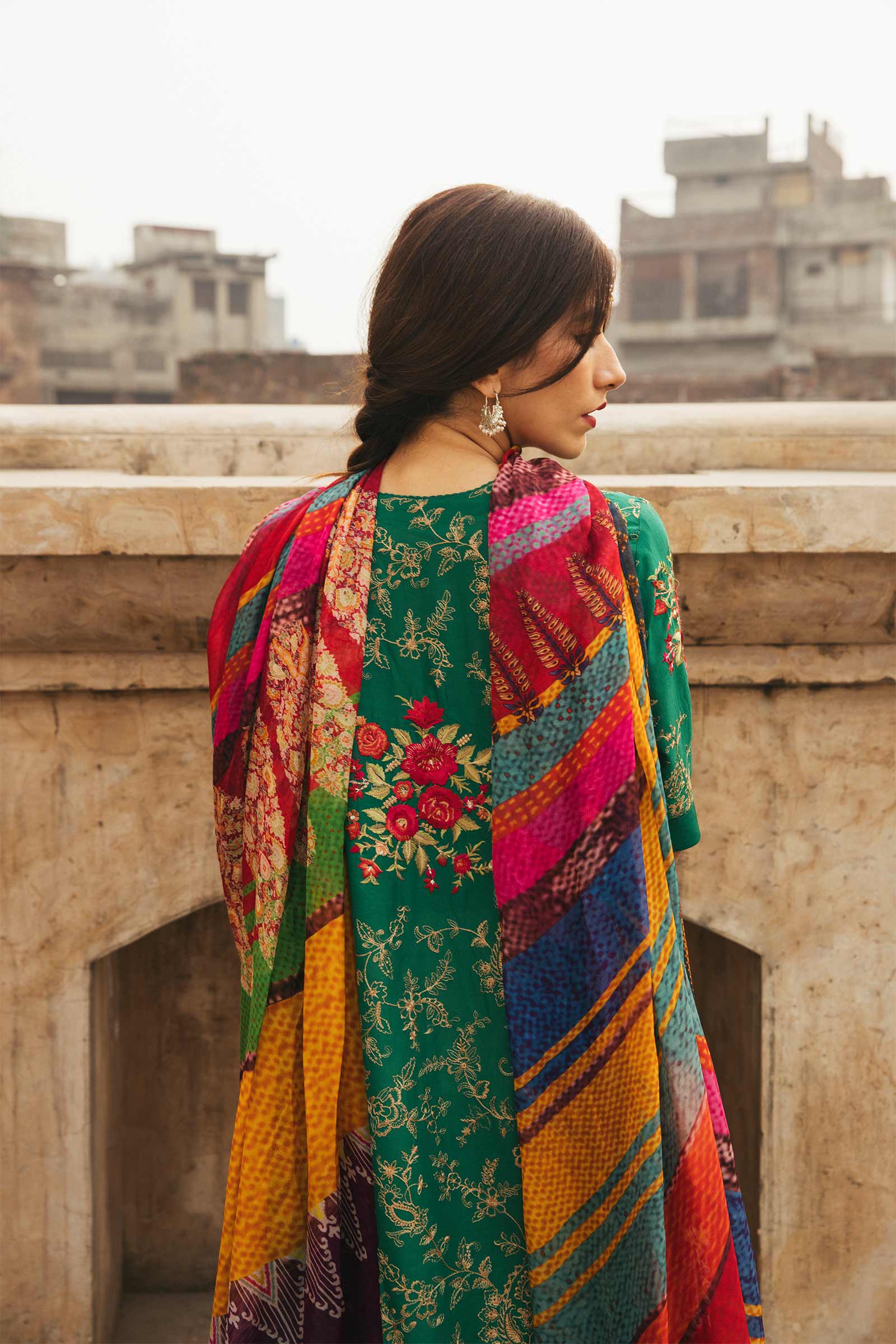 Fabric: Embroidered Front Center 0.35 Yard Embroidered Back Center 0.35 Yard Embroidered Back, Sleeves & Panel 2.1 Yards Embroidered Border 2.5 Yards Embroidered Sleeve Motifs (2) Embroidered Trouser Motifs (2) Printed Silk Dupatta 2.6 Yards Cambric Trouser 2.15 Yards |