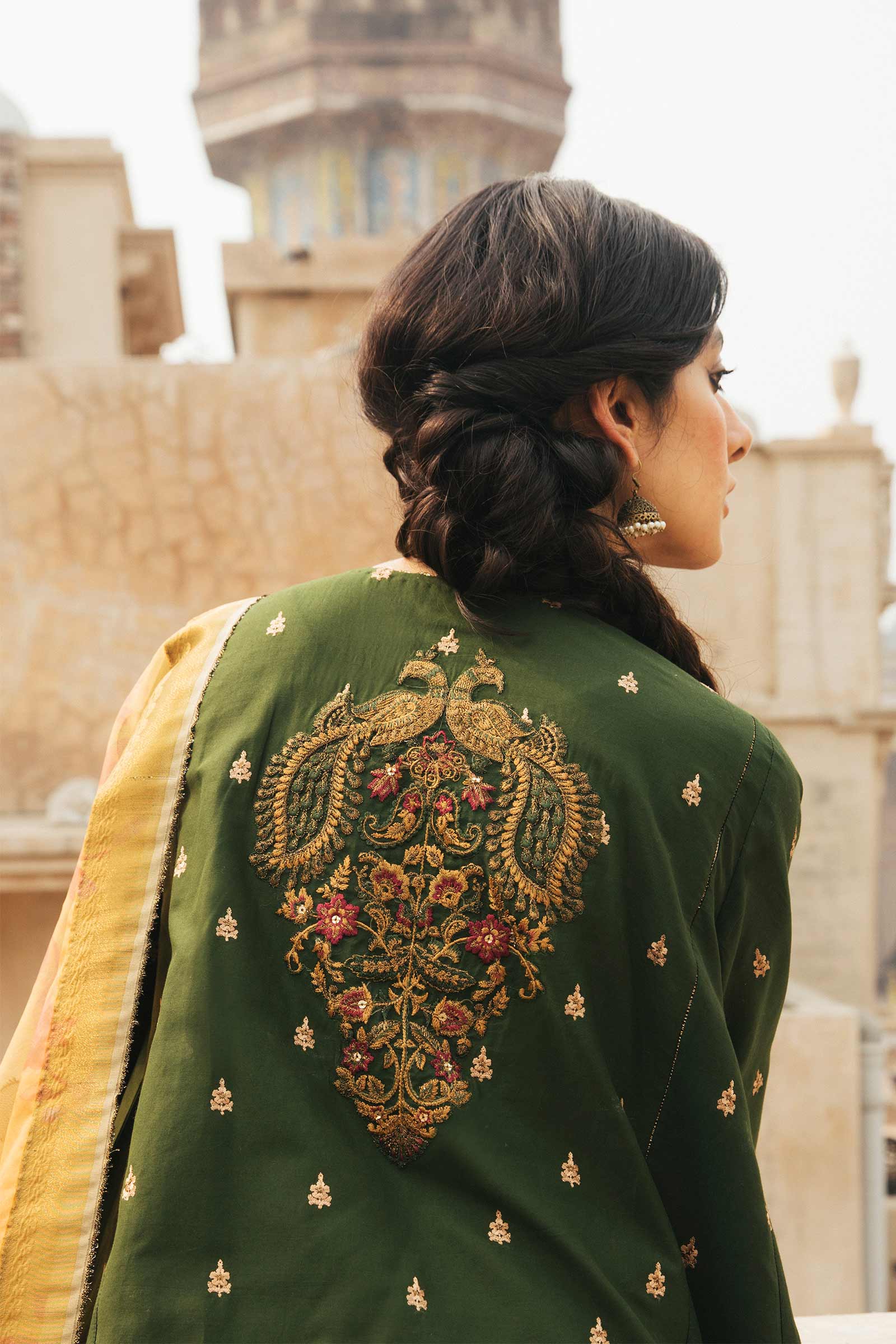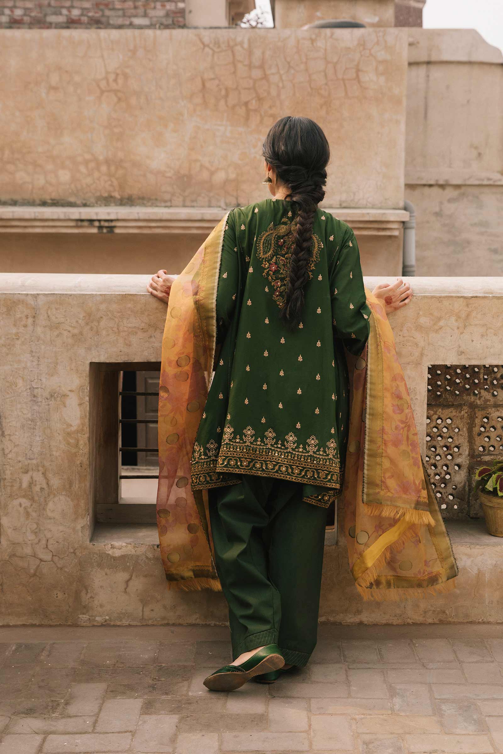 Fabric: Embroidered Front 0.7 Yard Embroidered Back and Panel 1.6 Yards Embroidered Sleeves 0.7 Yard Embroidered Motif (1) Embroidered Border 1.6 Yards Jacquard Organza Printed dupatta 2.6 Yards Cambric Trouser 2.15 Yards |