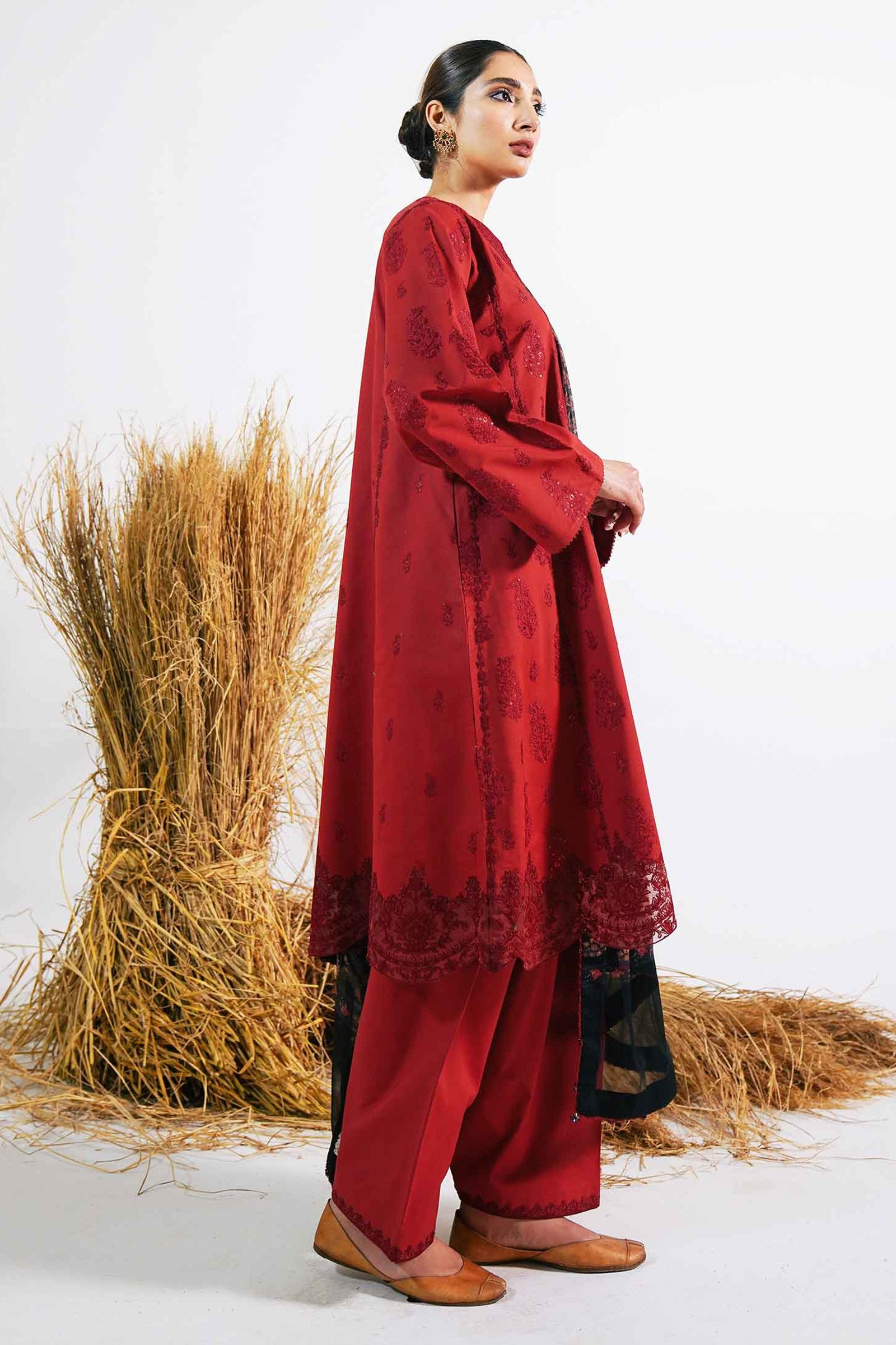 Fabric:Embroidered Front 1.38 Yards Embroidered Back 1.38 Yards Embroidered Sleeves 1.38 Yards Embroidered Neckline Embroidered Border Patch 1 Yard Embroidered Patti 1.4 Yards Embroidered Patti 4.3 Yards Printed Chiffon Dupatta 2.6 Yards Plain Cambric Trouser 2 Meters |