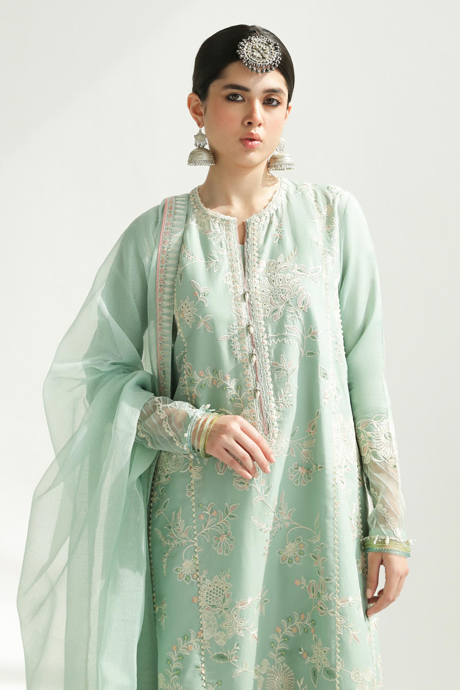 The Amira kurta wraps you in soothing tones of summer, creating the perfect backdrop for a summer breakfast with friends. It features an embroidered jaal on the shirt, a karandi net dupatta with beautiful corner motifs and printed pants.