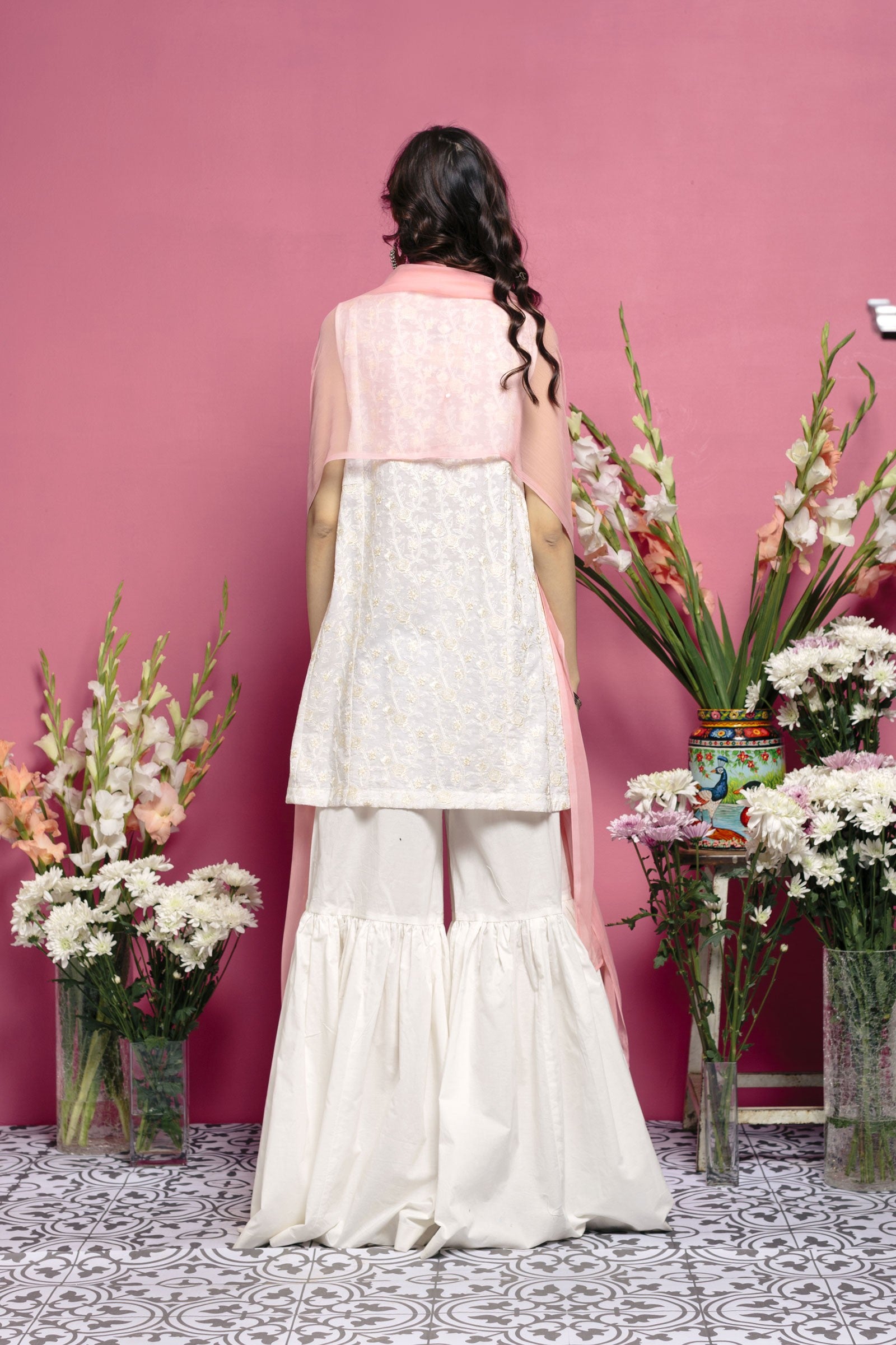 White on white: Sleeveless embroidered shirt with side panels and band collar finished with a subtle white lace. Paired with a white gharara and pink chiffon dubatta.