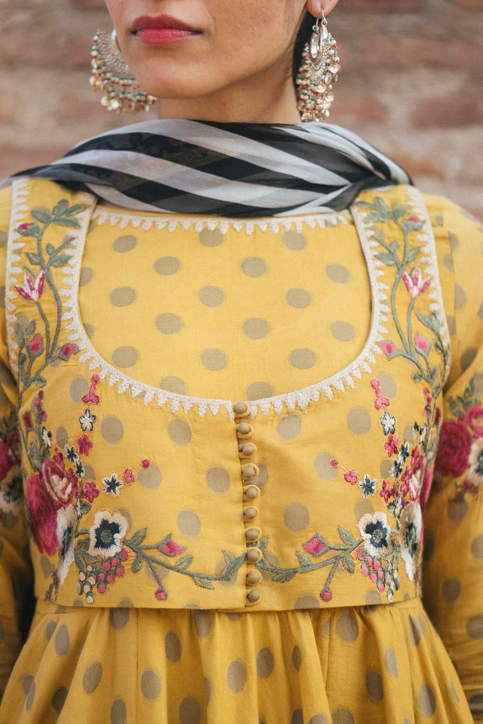 Fabric: Polka dot jacquard shirt Embroidered sleeves Embroidered motifs and pattis Printed chiffon dupatta Dyed cambric trouser with embroidered patti |