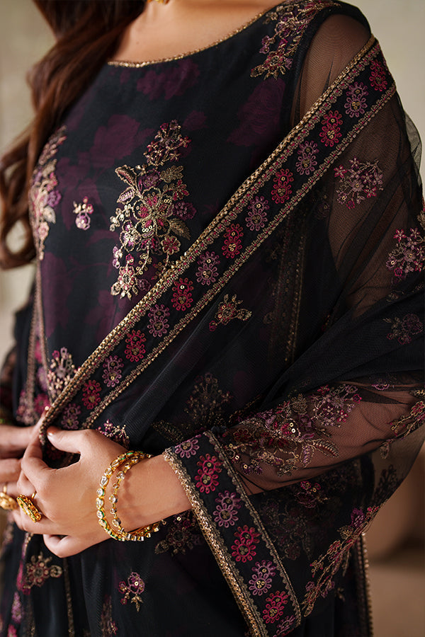 Summary: Step into sophistication with the Zarif Zaneera 'ASHAAL' luxury formal suit. This exquisite Pakistani dress features a timeless black kameez crafted from delicate, airy net, ideal for Spring/Summer events. The shirt is lavishly adorned with intricate sequins embroidery across the front, back, and sleeves, creating a captivating sparkle. The ensemble includes a matching embroidered net dupatta and a printed raw silk inner, adding depth and a touch of color. As a premier example of formal wear, this black ethnic outfit is a perfect choice for weddings, receptions, and elegant evening parties.