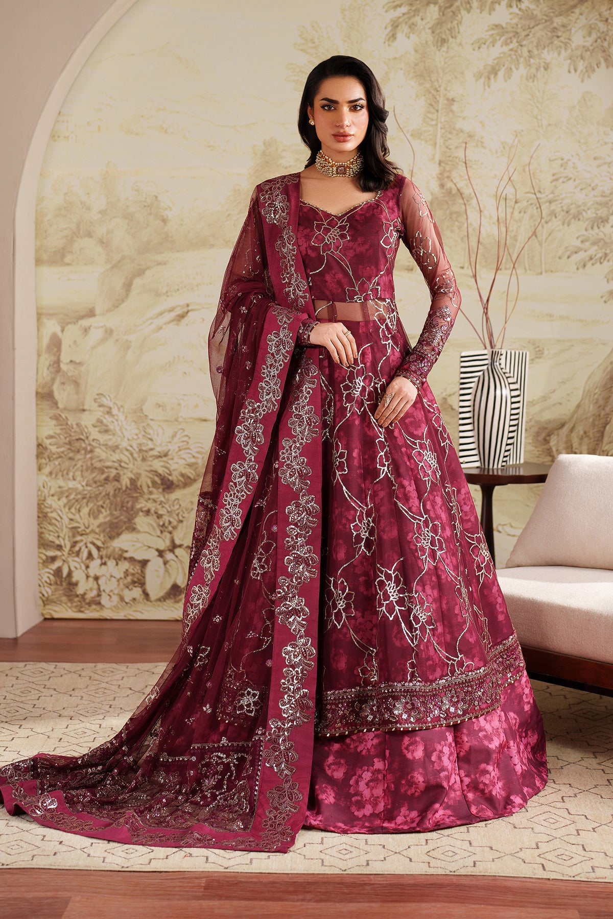 Summary: Embrace regal elegance with this Zarif Luxury Formal Pakistani suit. The ensemble features a stunning maroon kameez crafted from delicate, sequin-embroidered net, making it a perfect choice for Spring/Summer festivities. Intricate floral embroidery in a contrasting hue graces the entirety of the shirt, sleeves, and daman, exuding opulence. The design is layered over a vibrant printed raw silk inner, adding a unique visual texture. This exquisite ethnic wear is the epitome of formal clothing, ideal for wedding events or Eid celebrations. A standout piece of Pakistani festive wear, it promises a look of sophisticated grace.