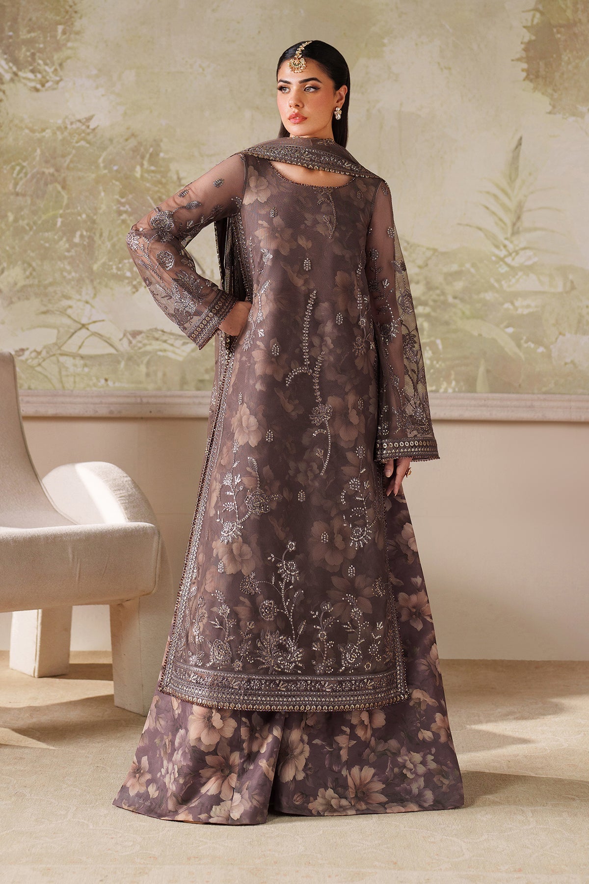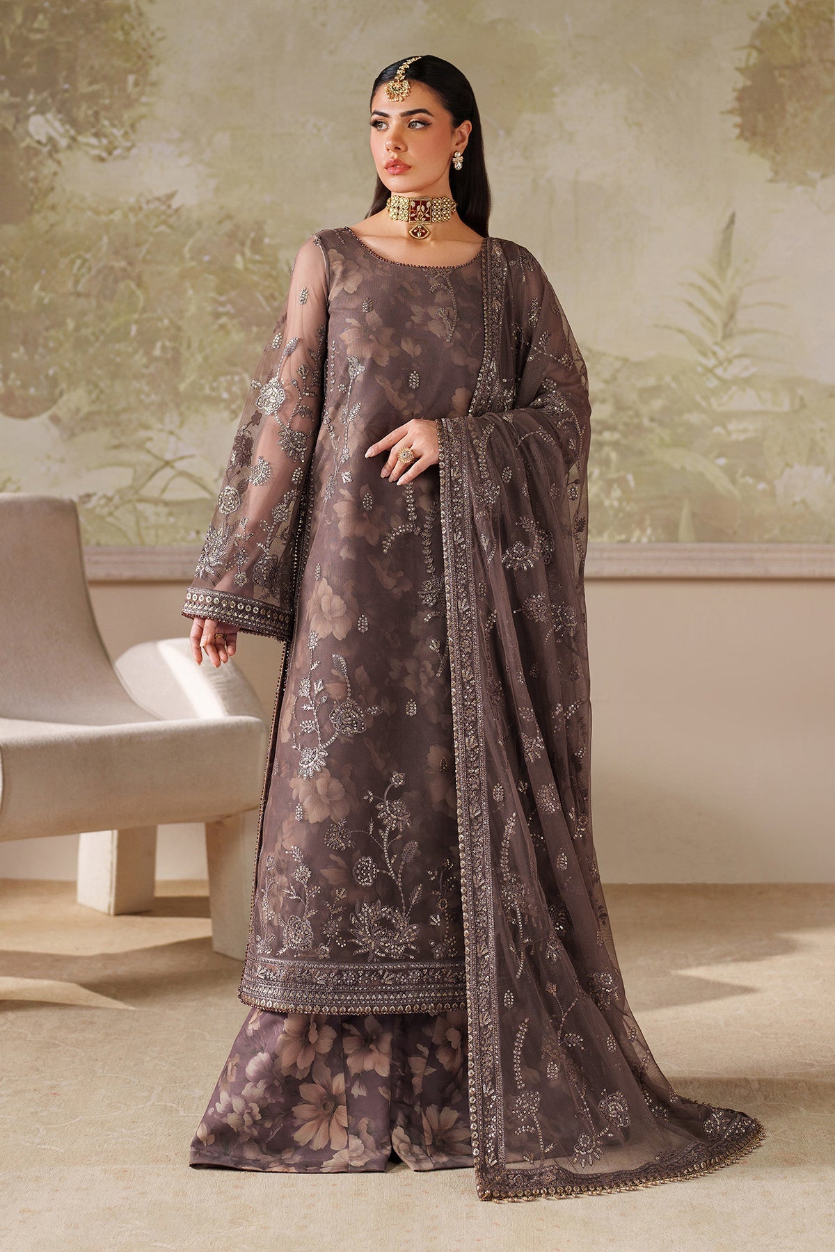 Summary: Embrace timeless elegance with the Zarif Zaneera 'MAHVEER' luxury formal Pakistani suit. This exquisite ensemble features a stunning brown kameez crafted from delicate, sequins-embroidered net, making it a breathable yet glamorous choice for Spring/Summer festivities. The outfit is layered over a beautiful printed raw silk inner, adding depth to the design. Intricate embroidery adorns the daman, sleeves, and side slits, showcasing superior craftsmanship. As a sophisticated piece of ethnic wear, this brown formal dress is perfect for weddings, receptions, and other grand celebrations. Shop this stunning Pakistani dress online, an ideal choice for a wedding guest seeking a unique and graceful look.