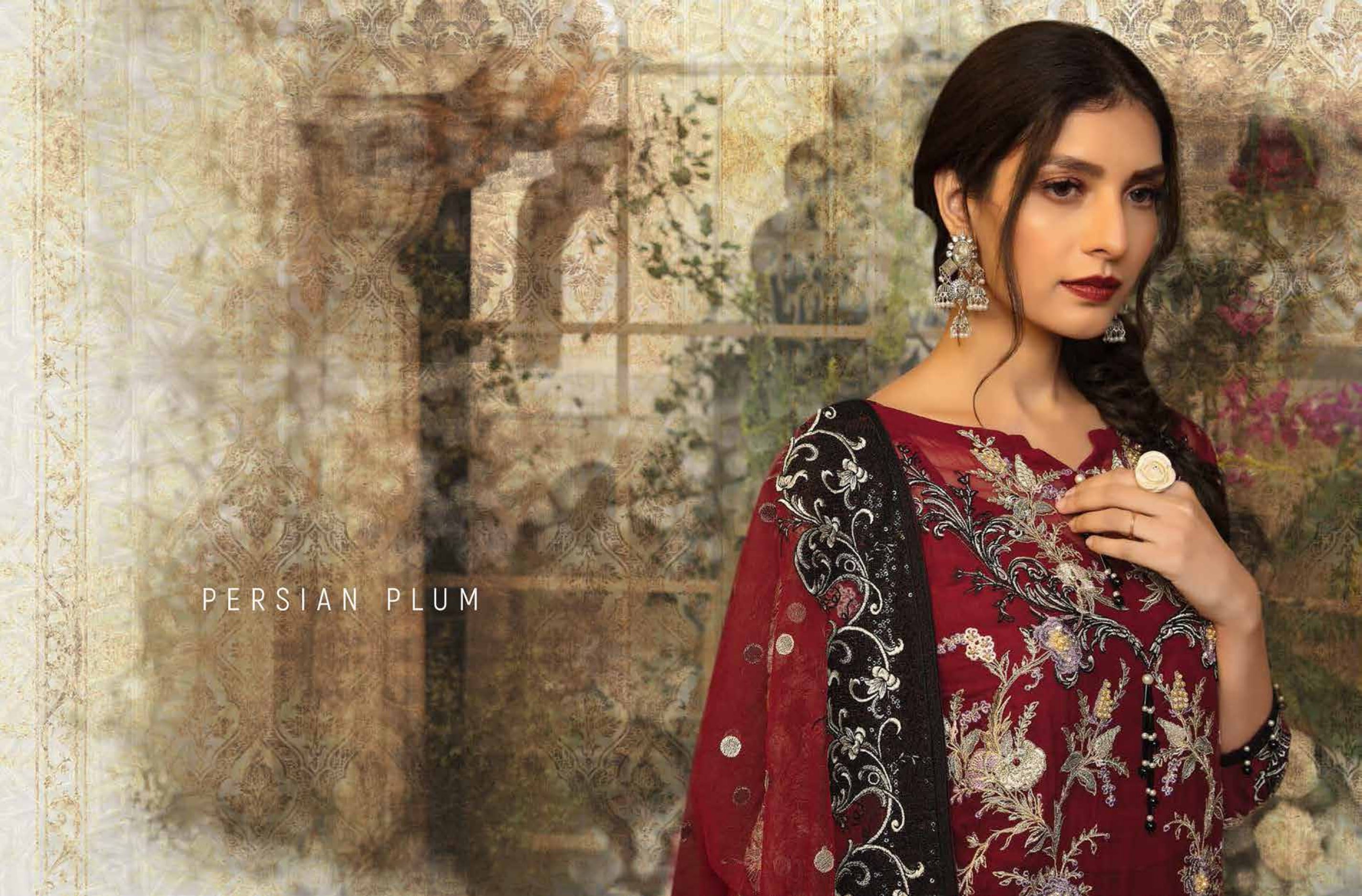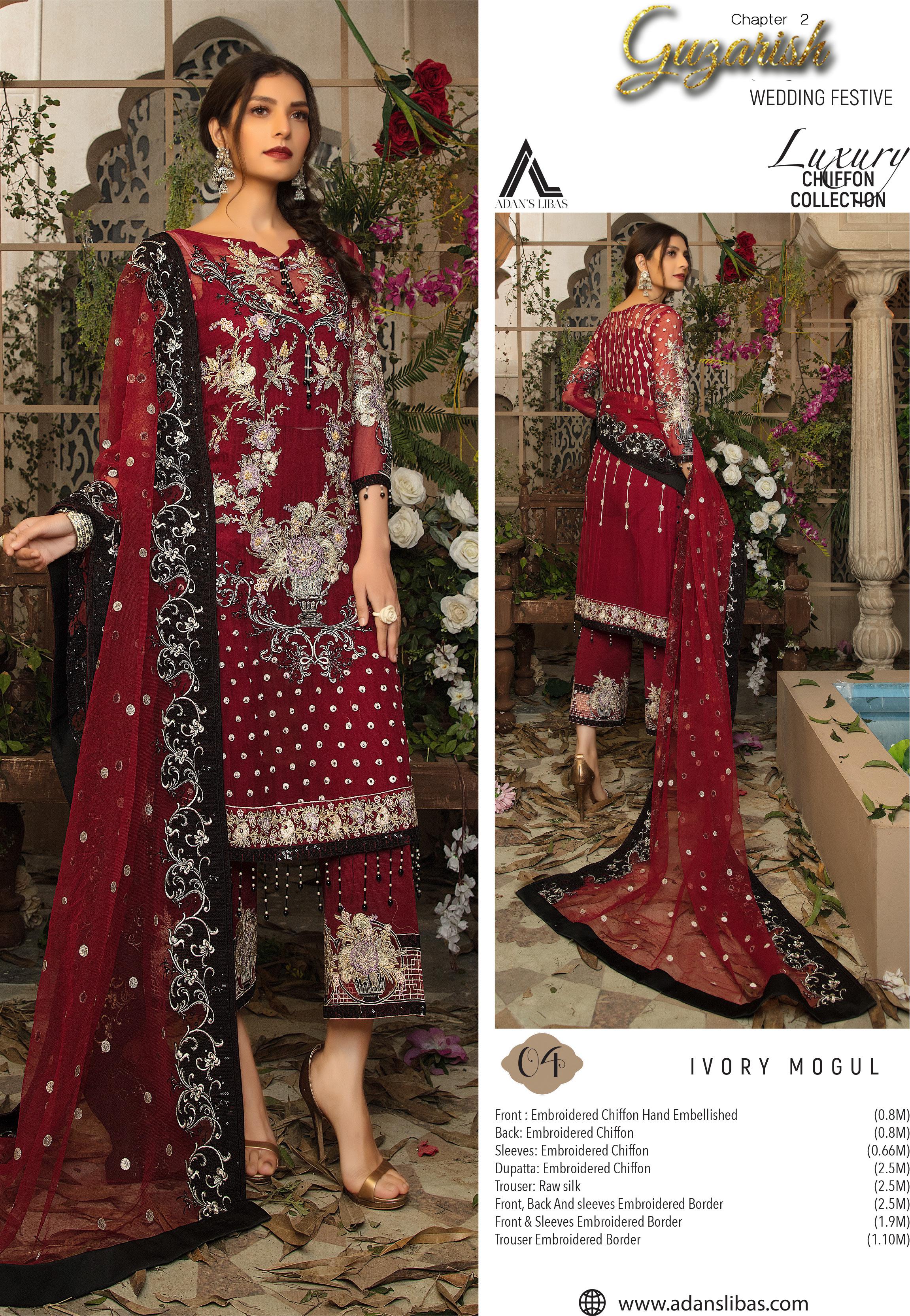Fabric: Front : Embroidered Chiffon Hand Embellished (0.8M) Back: Embroidered Chiffon (0.8M) Sleeves: Embroidered Chiffon (0.66M) Dupatta: Embroidered Chiffon (2.5M) Trouser: Raw silk (2.5M) Front, Back And sleeves Embroidered Border (2.5M) Front & Sleeves Embroidered Border (1.9M) Trouser Embroidered Border (1.10M) |