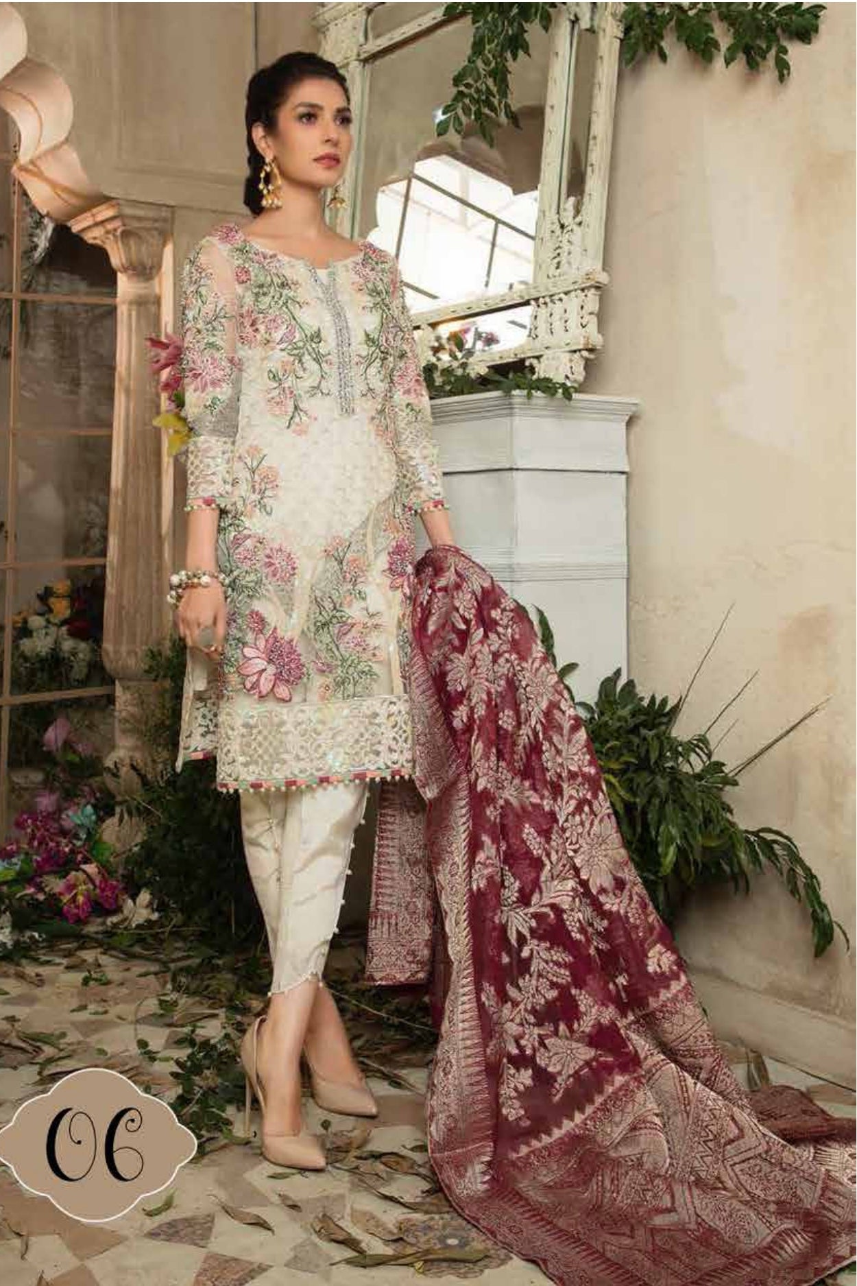 Fabric: Front: Embroidered Net Hand Embellished (0.8M) Back: Embroidered Net (0.8M) Sleeves: Embroidered Net (0.66M) Dupatta: Jacquard Organza Trouser: Raw silk (2.5M) Front Embroidered Hand Embellished Motifs (2Pcs) Front, Back And sleeves Embroidered Border (2.5M) Front Hand Embellished Neckline (1Pcs) |