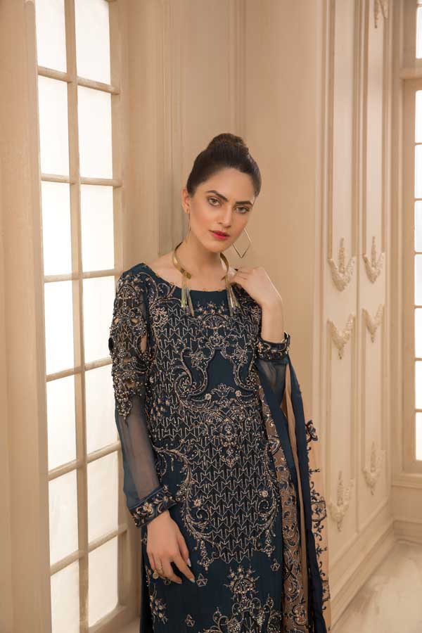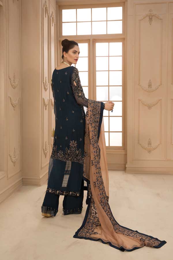 Fabric: Front : Embroidered Chiffon Hand Embellished (0.8 M) Back : Embroidered Chiffon (0.8M) Sleeves : Embroidered Chiffon Hand Embellished (0.66 M) Dupatta : Embroidered Chiffon (2.5 M) Trouser : Raw silk (2.5M) Front & back Embroidered Border Hand Embellished (1.5 M) |