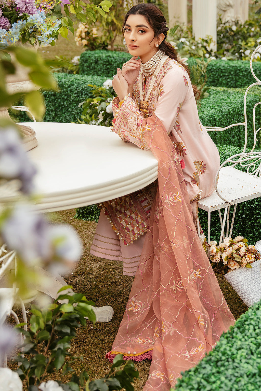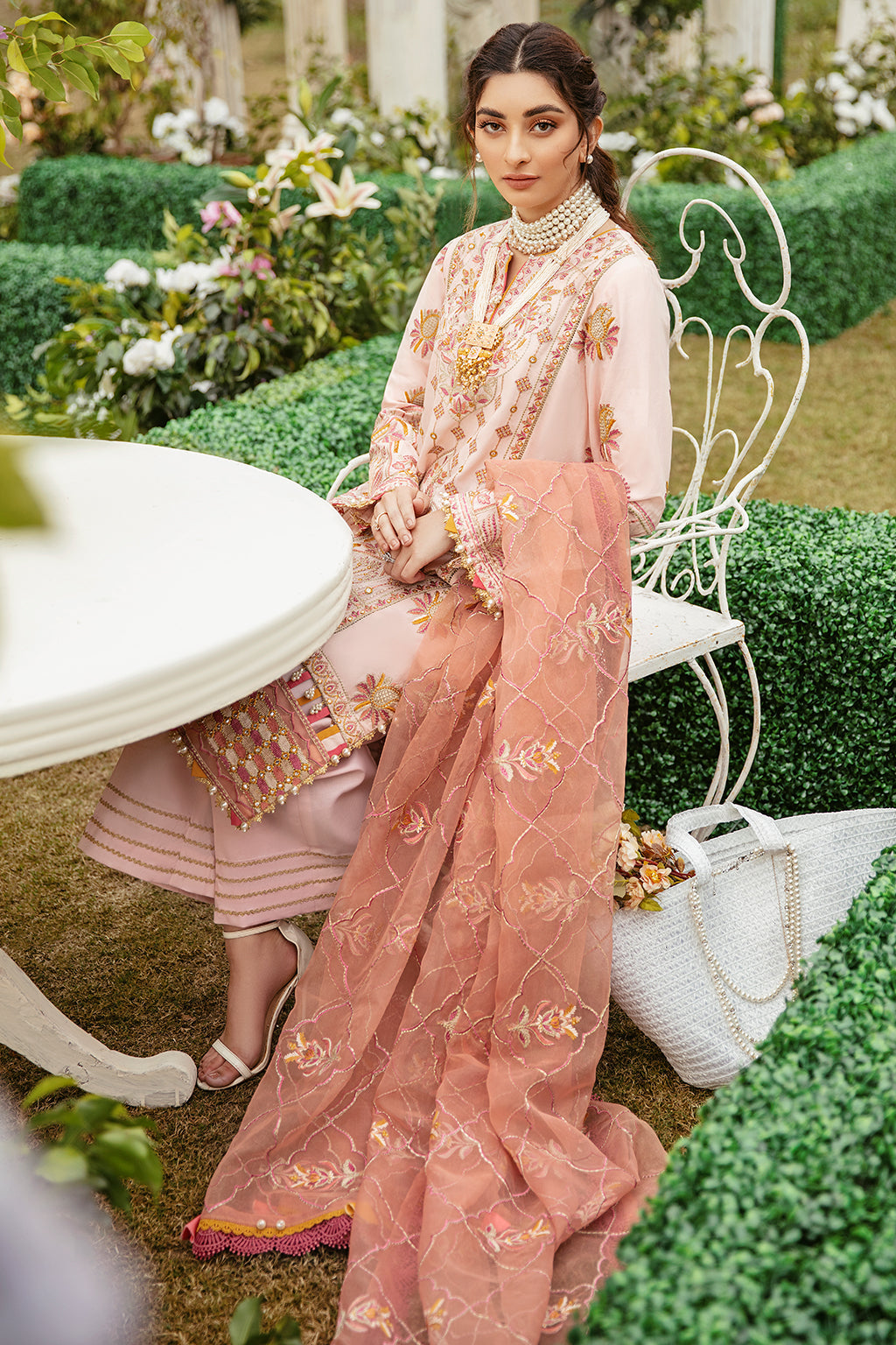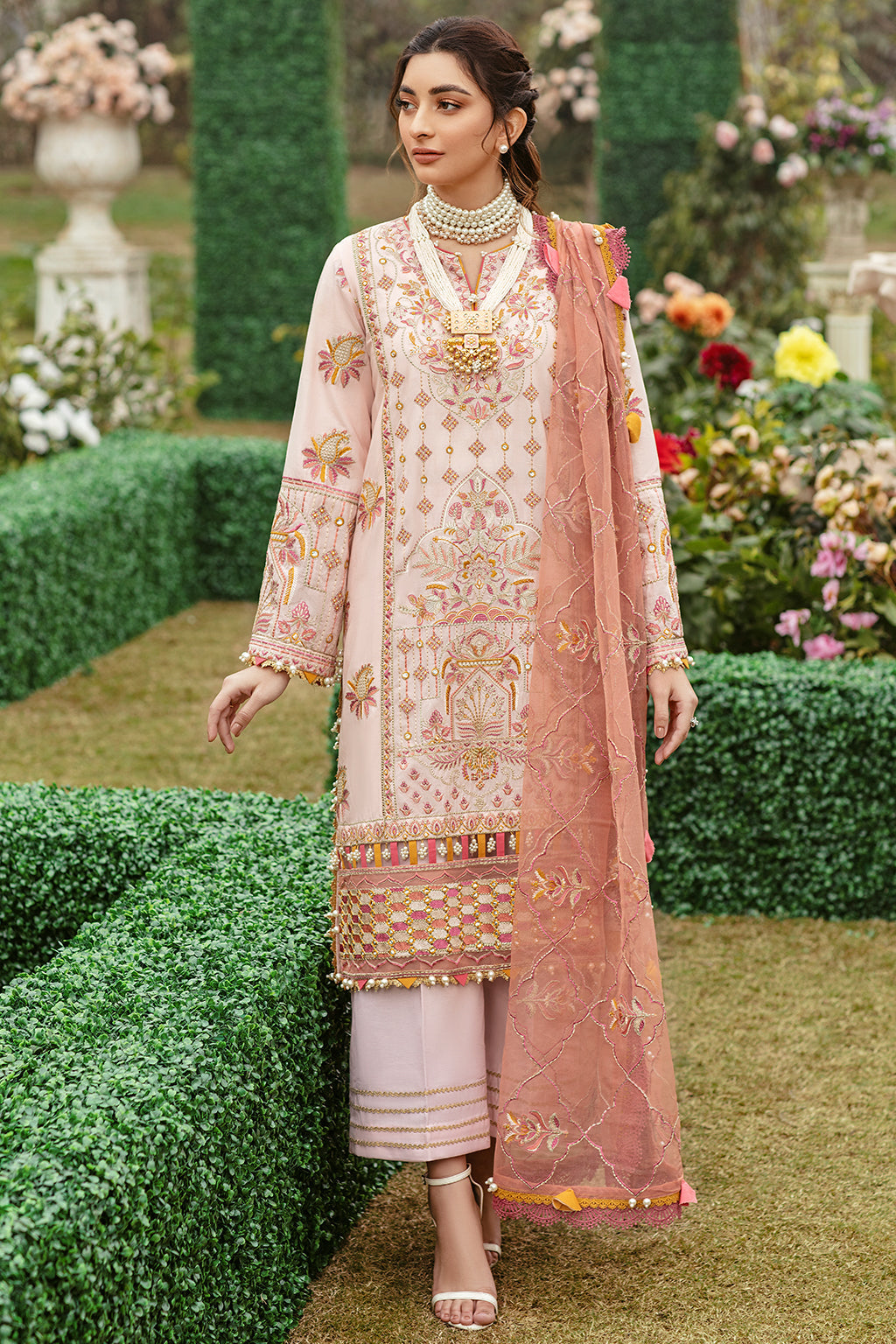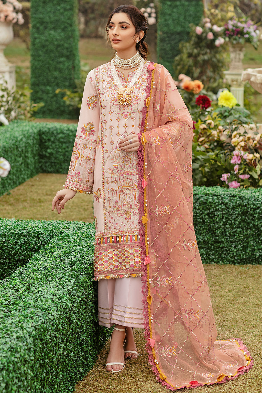 Fabric: Lawn Embroidered Front ( 13 Inches ) Lawn Embroidered Left + Right Kali ( 13 Inches ) Lawn Embroidered Back ( 1 Meter ) Lawn Embroidered Sleeves ( 0.66 Meter ) Organza Embroidered Front + Back Border ( 2 Meter ) Organza Embroidered Dupatta ( 3 Yards ) Cotton Plain Trouser ( 2.5 Yards ) |