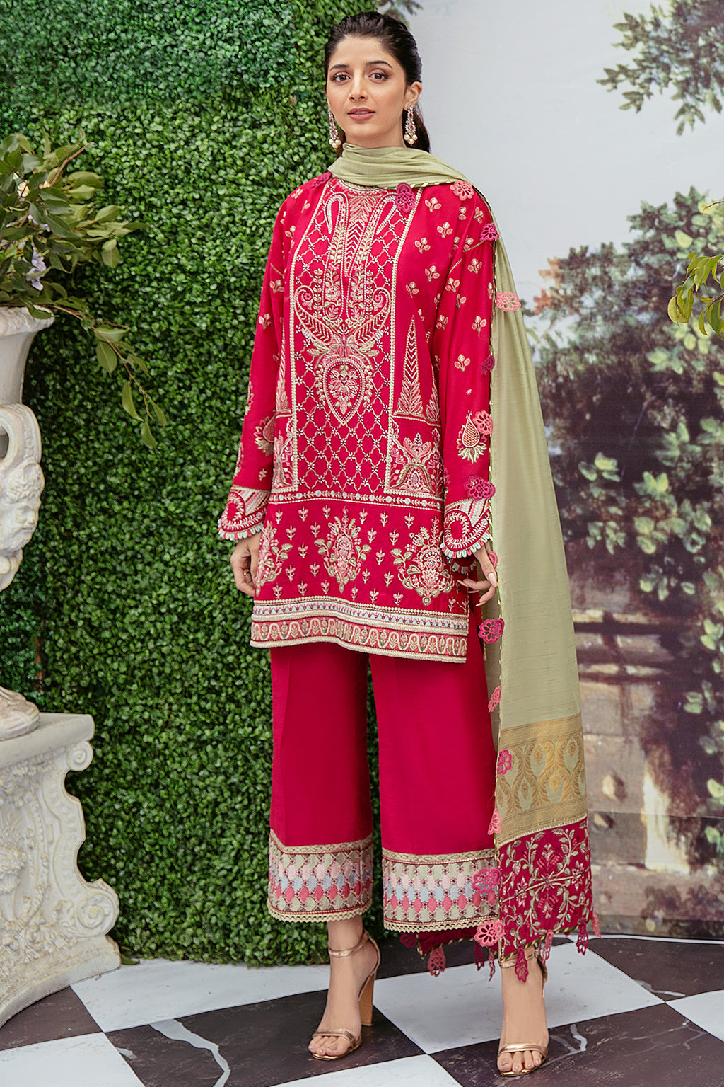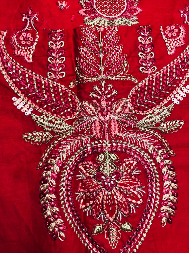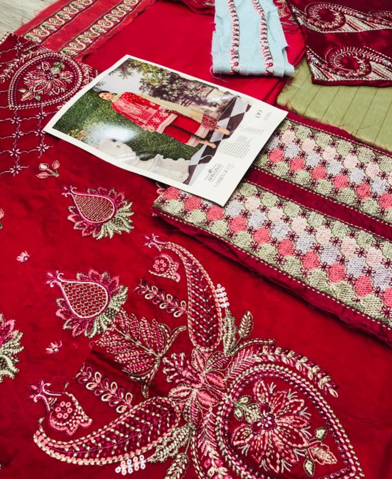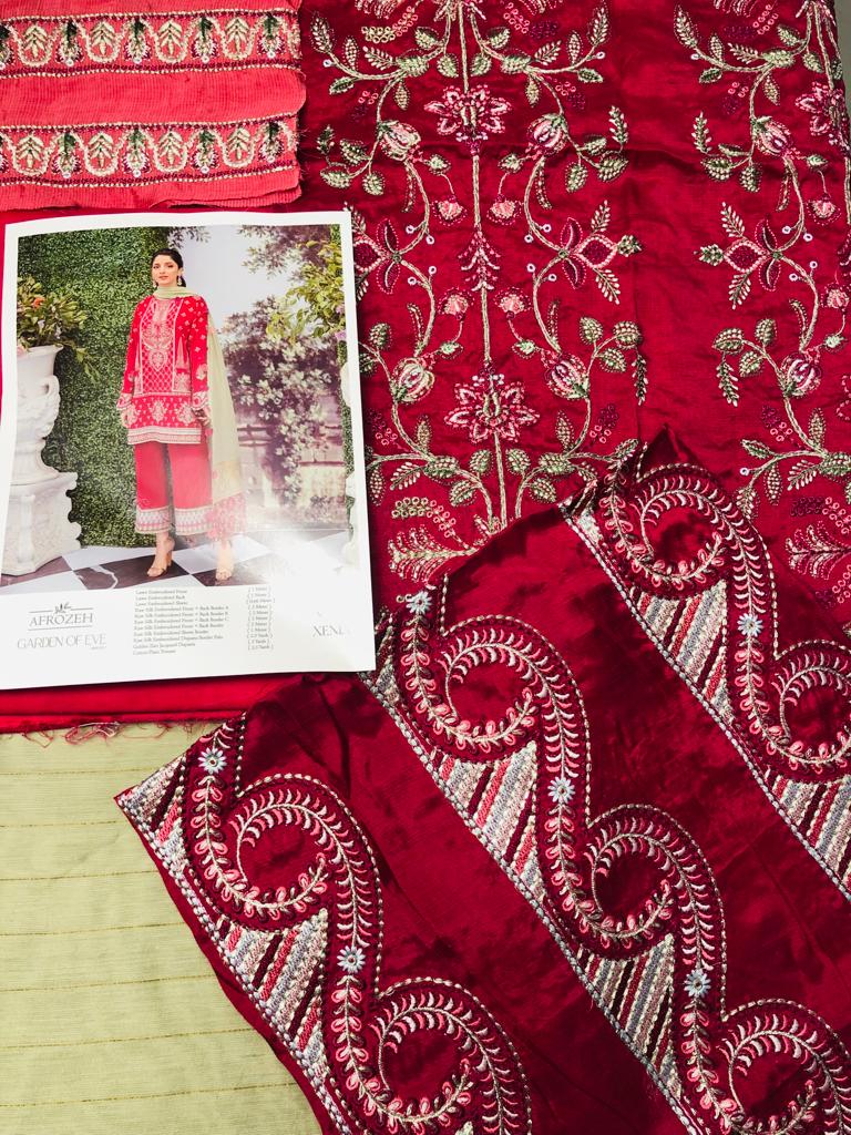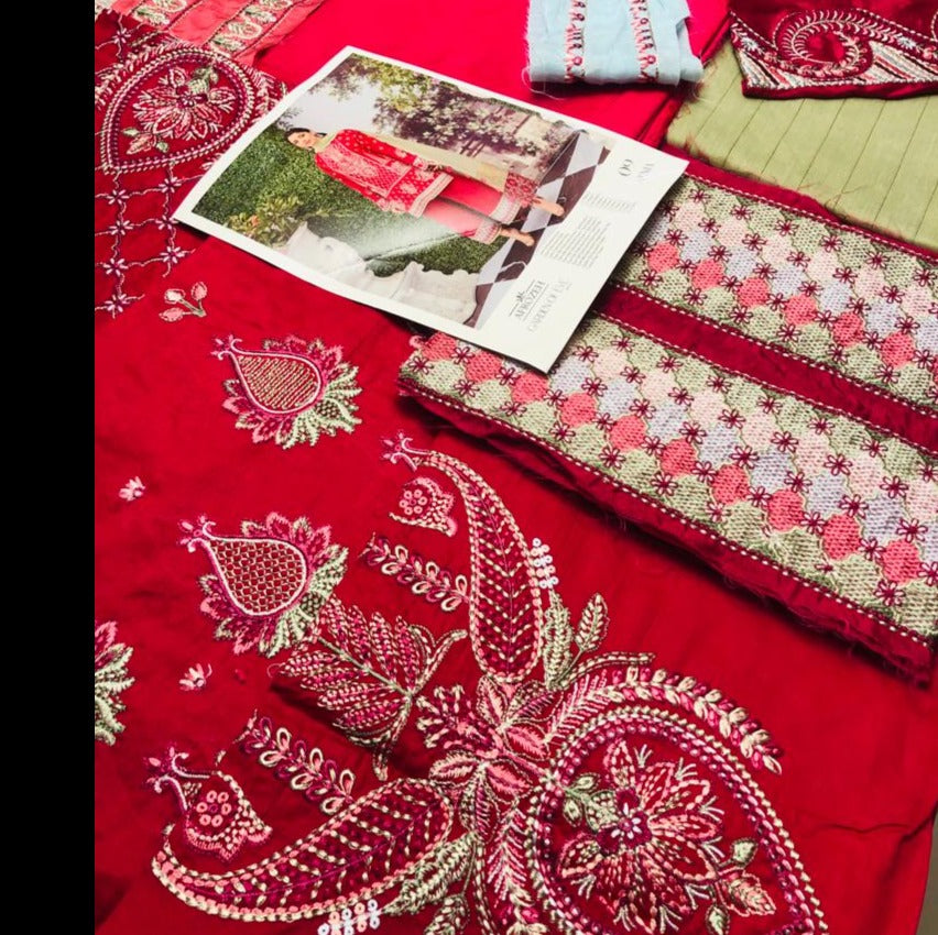Fabric: Lawn Embroidered Front ( 1 Meter ) Lawn Embroidered Back ( 1 Meter ) Lawn Embroidered Sleeves ( 0.66 Meter ) Raw Silk Embroidered Front + Back Border A ( 2 Meter ) Raw Silk Embroidered Front + Back Border B ( 2 Meter ) Raw Silk Embroidered Front + Back Border C ( 2 Meter ) Raw Silk Embroidered Front + Back Border ( 2 Meter ) Raw Silk Embroidered Sleeve Border ( 1 Meter ) Raw Silk Embroidered Dupatta Border Pallu ( 2.5 Yards ) GOLDEN ZARI JACQUARD DUPATA ( 3 Yards ) Cotton Plain Trouser ( 2.5 Yards ) |