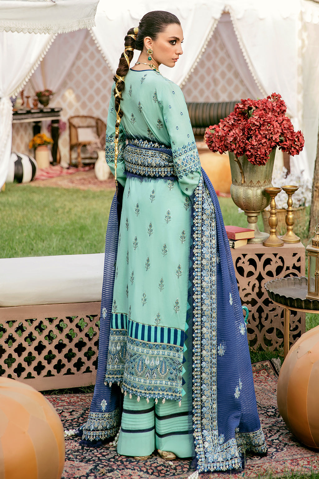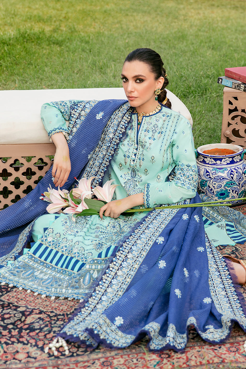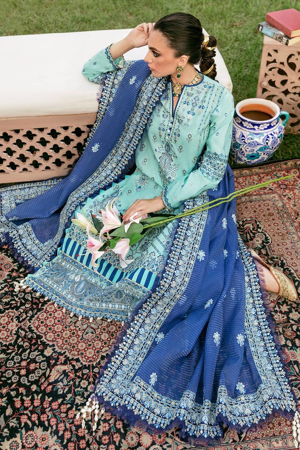 Fabric: Heriz draws inspirations from tribal elements which are rendered on a sky blue canvas. The shirt is composed in hues of gold and blues and the embroidery is further accentuated with sequins for the perfect amount of shimmer and shine in your Eid outfit. The jacquard dupatta is made in a contrasting, dark blue color with heavy four sided borders. A plain sky blue pant makes this design a keepsake for years to come! Lawn Embroidered Front (1 Meters) Lawn Embroidered Back (1 Meters) Lawn Embroidered Sleeve (0.66 Meters) Organza Embroidered Front + Back Border (2 Meters) Organza Embroidered Sleeve Border (1 Meters) Organza Embroidered Dupatta Border (8 Meters) Line Dupatta (3 Yards) Cotton Plain Trouser (2.5 Yards) |