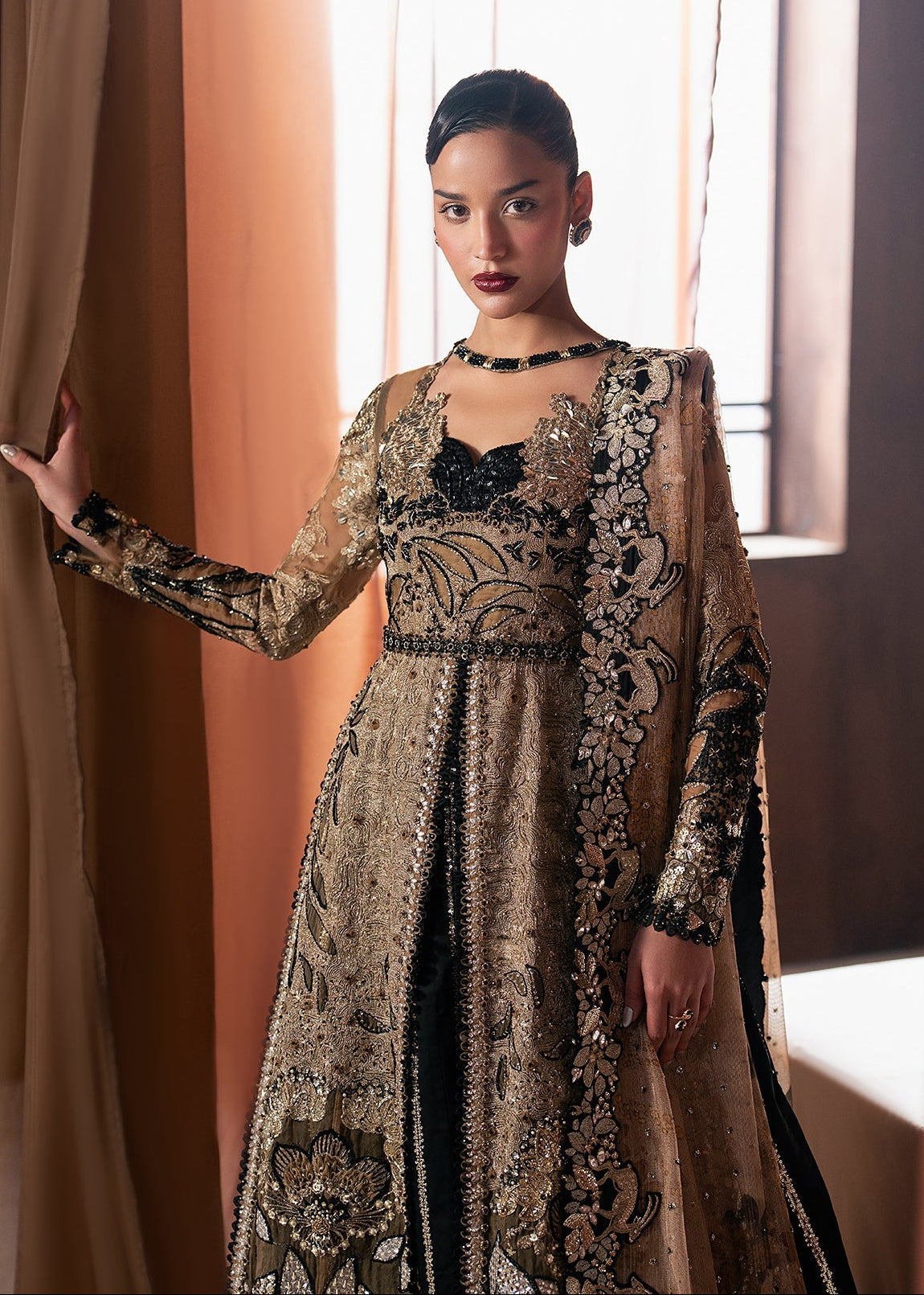Summary: Embrace quiet opulence with this Afrozeh luxury formal, a masterpiece of Pakistani design. This ensemble features a long, elegant shirt crafted from fine, sheer organza, ideal for Spring/Summer celebrations. The kameez is a canvas for meticulous hand-embroidery in contrasting black and antique gold, with resham and sequins forming intricate botanical motifs. The dramatic interplay of shadow and shimmer makes this black-themed Pakistani suit a perfect choice for grand evening functions and wedding receptions. This ethnic wear piece is designed for those seeking timeless allure and sophisticated formal clothing for their next big event.