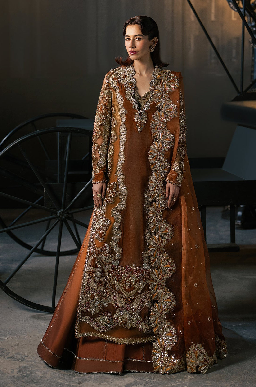 Summary: Exude regal charm with this stunning brown Pakistani suit from the Afrozeh Hayat collection. The kameez is crafted from rich, plush velvet, an ideal fabric for the Fall/Winter season's grand events. This Pakistani dress features a long, stately silhouette enhanced by intricate hand-embellished florals in gold and silver, creating a look of timeless majesty. As a quintessential piece of festive wear, its opulent design makes it a perfect choice for wedding functions. This ethnic wear masterpiece is designed for those seeking to make an unforgettable statement at any formal celebration.
