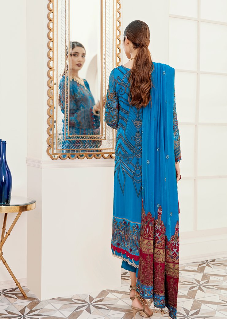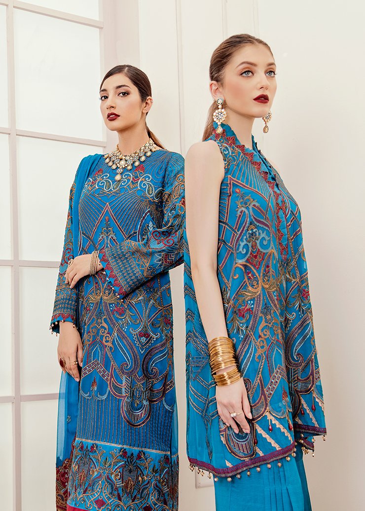 Fabric: Embroidered Shirt Front 1 meter chiffon Embroidered Shirt Back 1 meter chiffon Embroidered Sleeves Patch meter on tissue Embroidered Front and back Patch 2 meter on tissue 4 Embroidered Dupatta patch 2.5 Yard on embroidery Embroidered Dupatta 2.5 yard Chiffon Trouser 2.5 yard Silk |