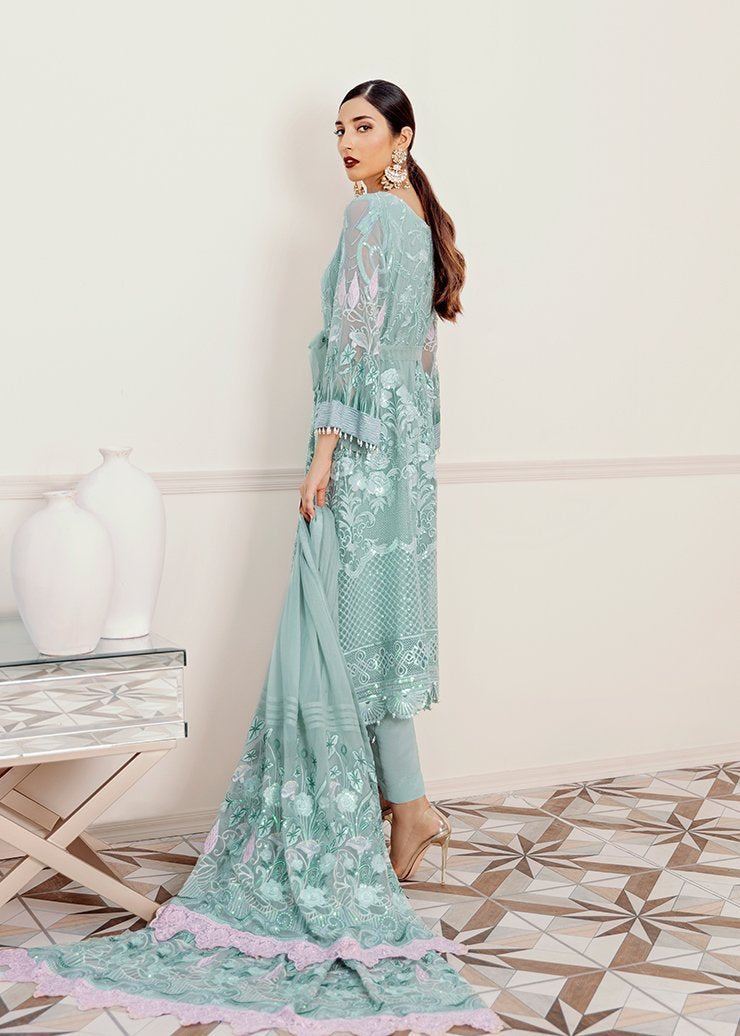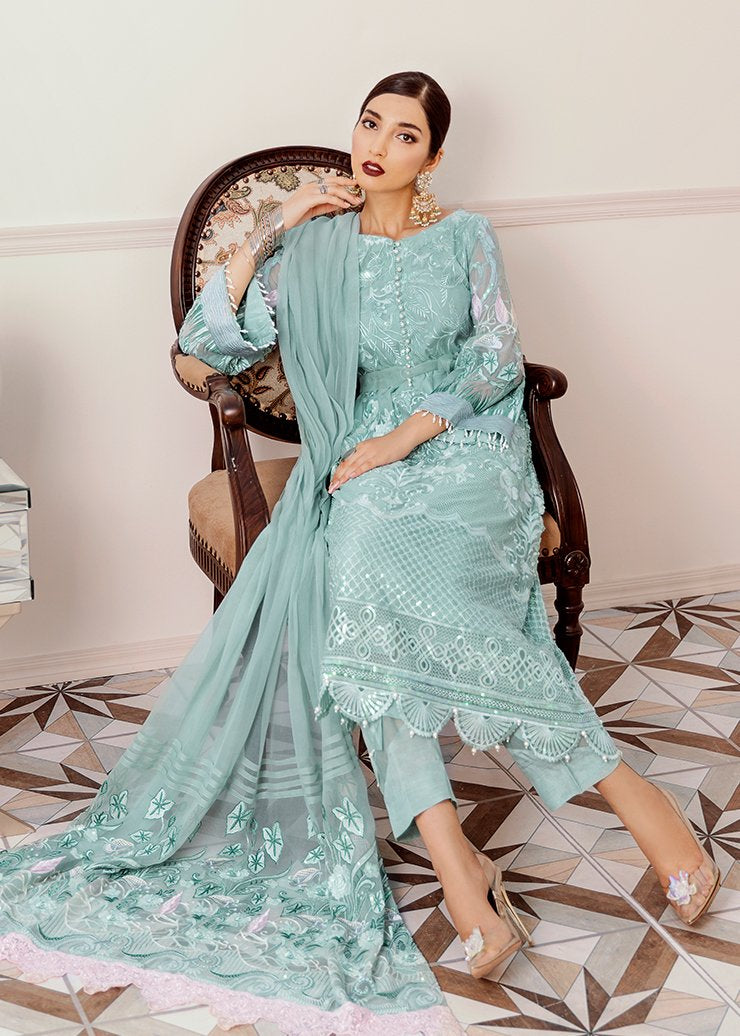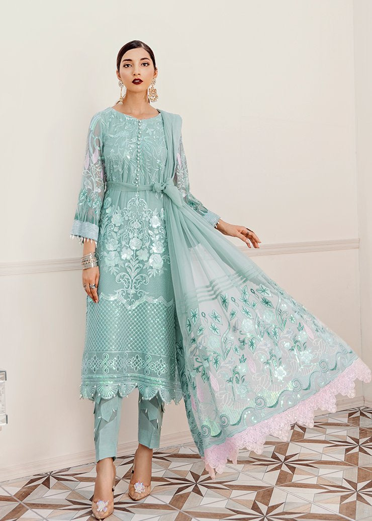 Fabric: Embroidered Shirt Front 1.25 meter on chiffon Embroidered Shirt Back 1.25 meter on chiffon Embroidered Sleeves 0.75 meter on chiffon Embroidered Front and back border 2.5-meter organza Embroidered Front and back border 2.5-meter organza Embroidered Dupatta 3 yard embroidery chiffon Embroidered Dupatta patch 2.5 yard embroidery organza Trouser 2.5-yard raw silk |