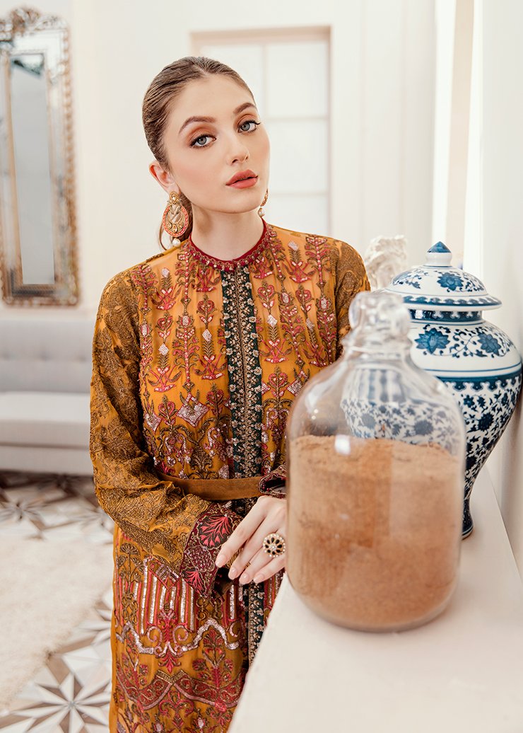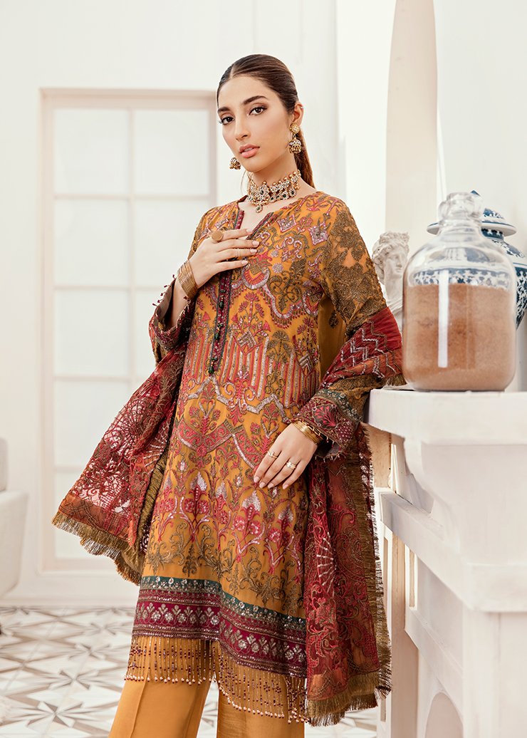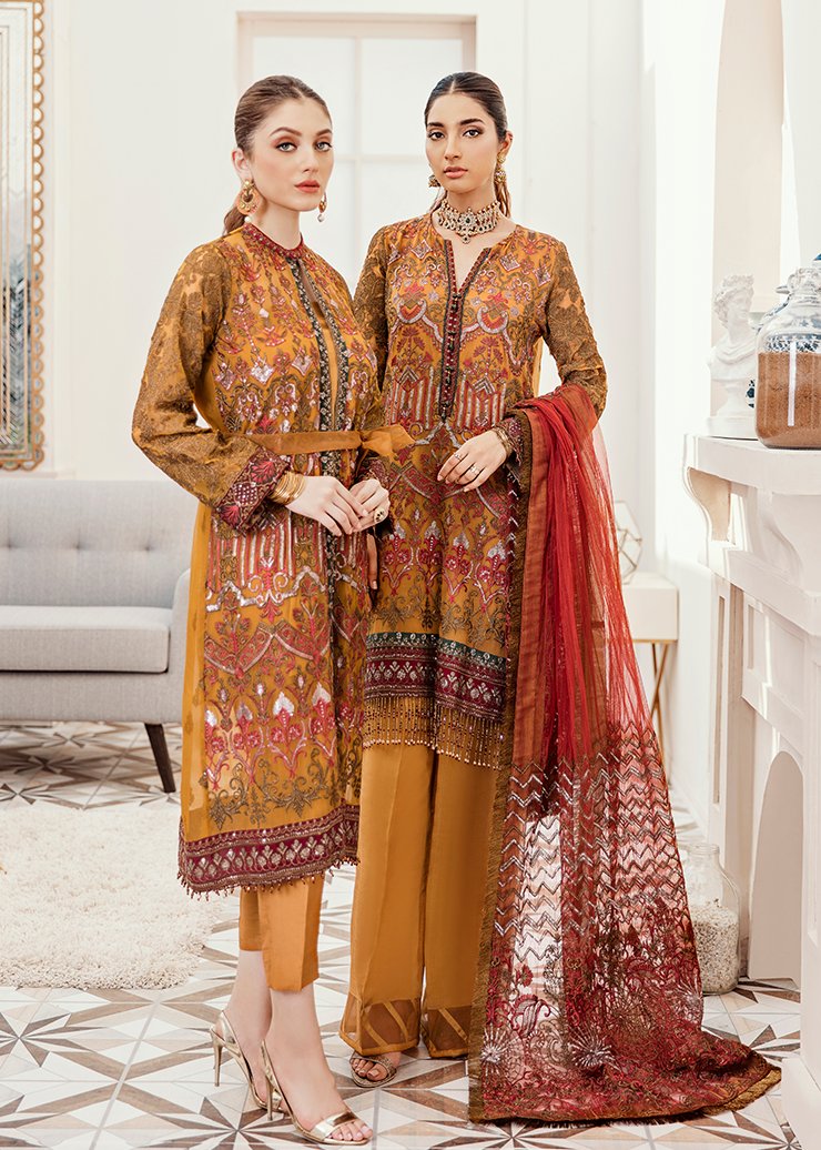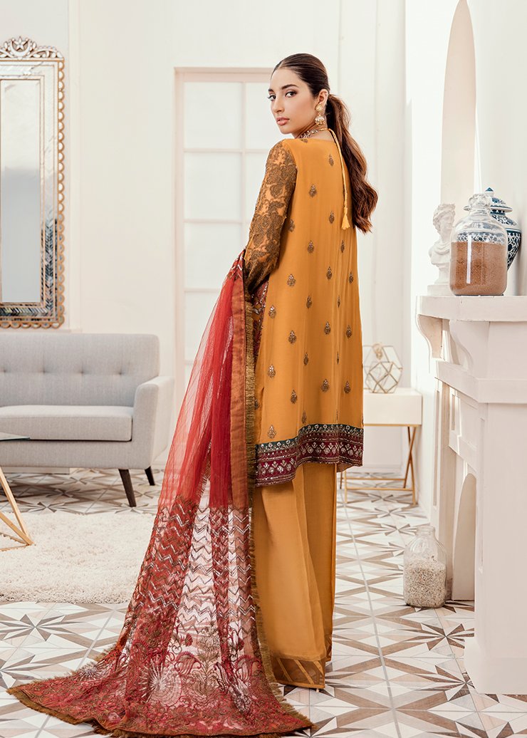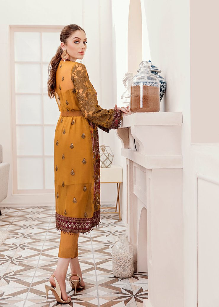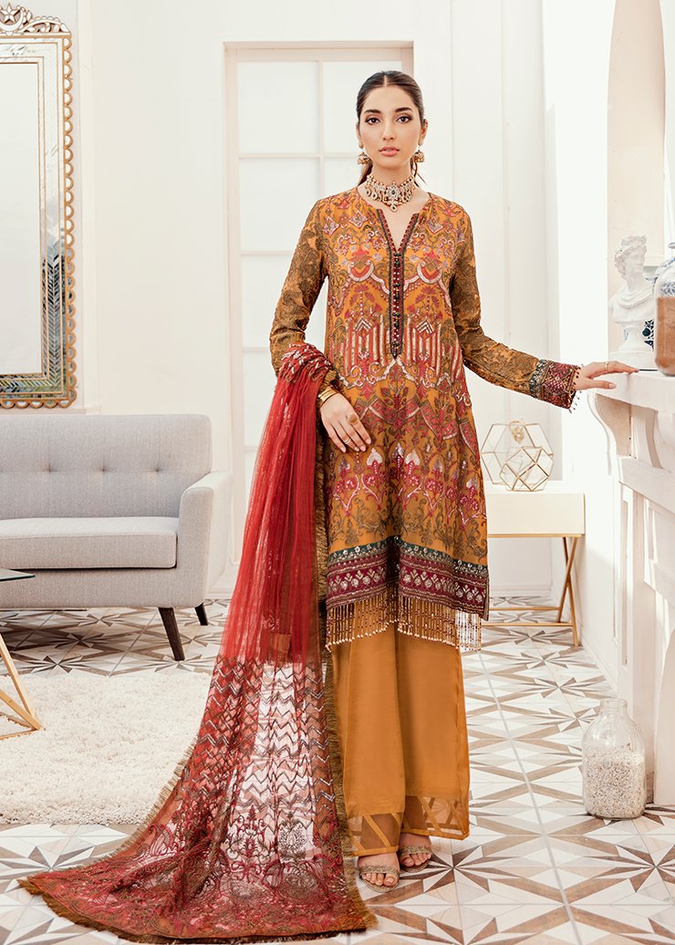 Fabric: Embroidered Shirt Front 1 meter on chiffon Embroidered Shirt Back 1 meter on chiffon Embroidered Sleeves 0.75 meter on chiffon 2 Embroidered Sleeves patch 1 meter on grip Embroidered Neck Patch 1.5 meter on grip Embroidered 2 Front and back Patch 2 meter on grip Embroidered Duppata 3 yard embroidery on net Trouser 2.5-yard raw silk |