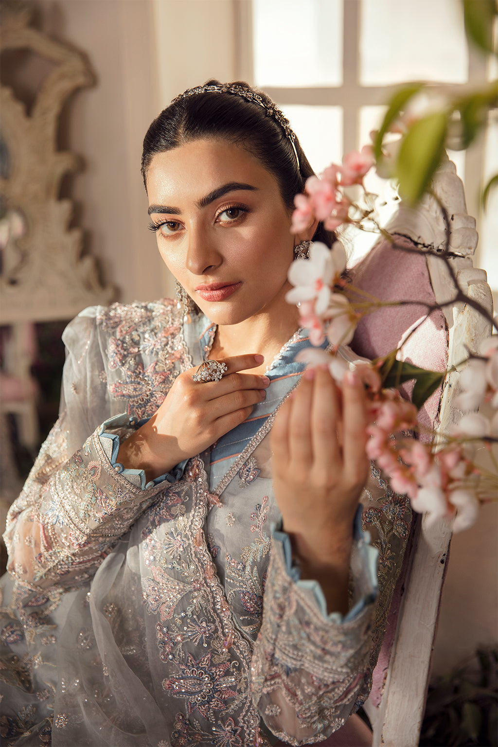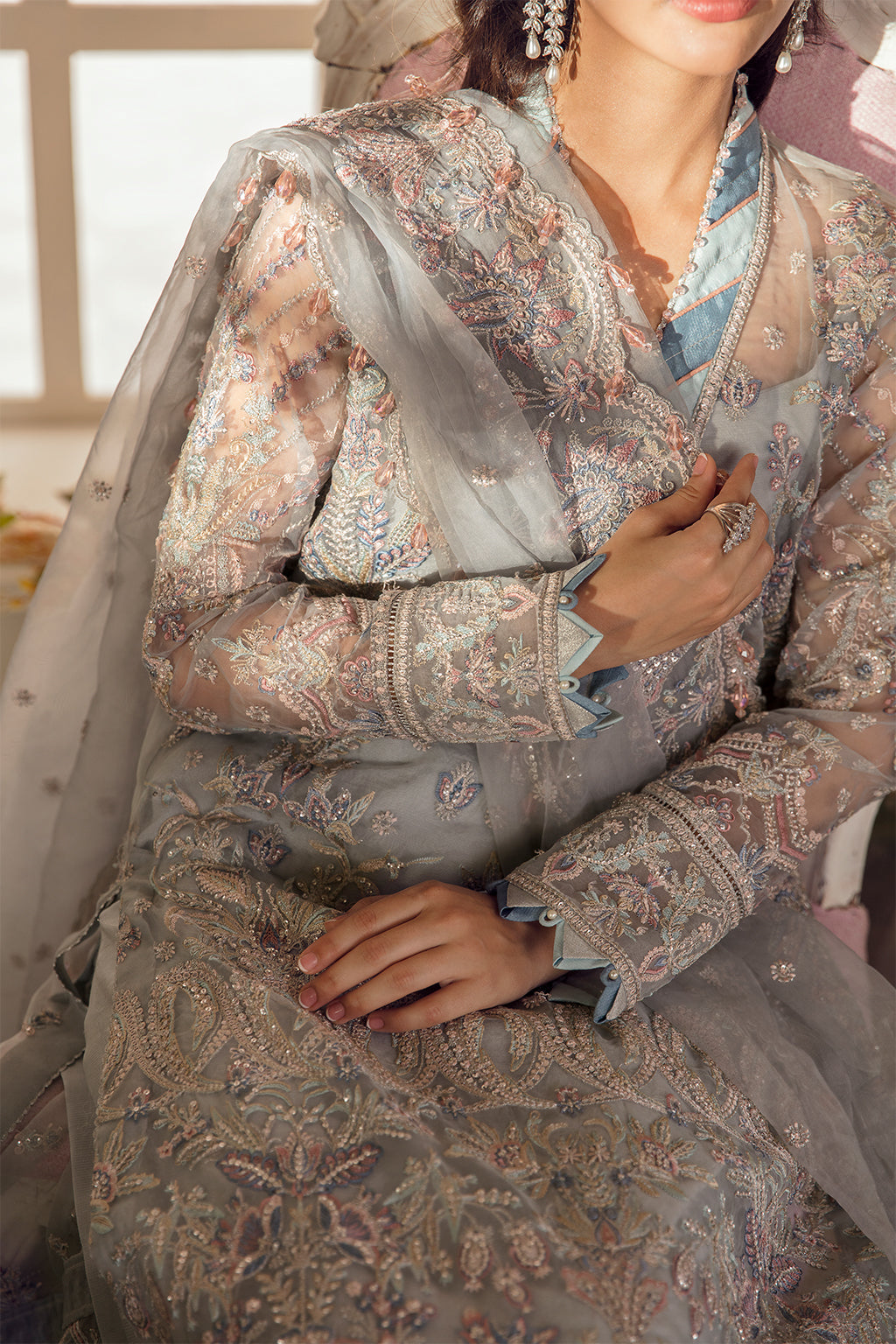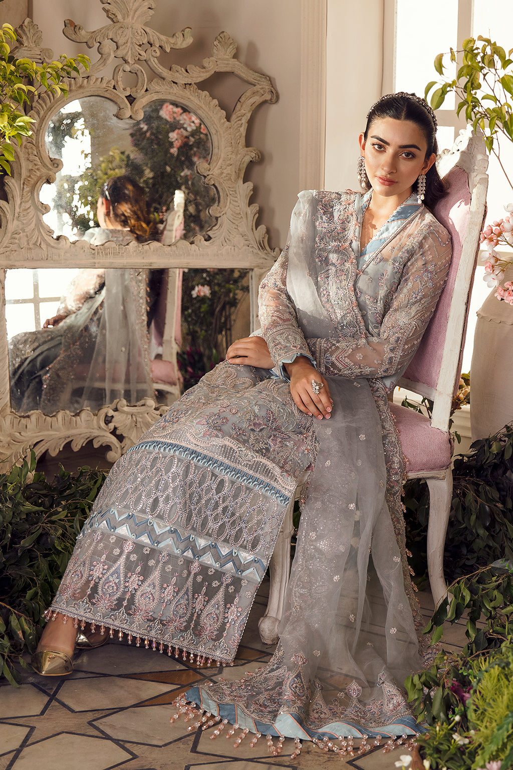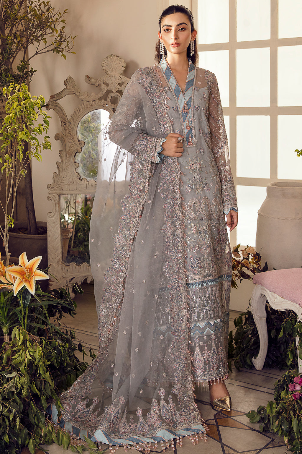 Fabric: Crafted on an organza canvas, “Lucia” is a pale periwinkle shirt which is adorned with soft florals and is exquisitely detailed with tilla and katori sequins. This modern composition of embroidery is accentuated with soft pastel hues and a signature chatta patti details adds glamour to the entire outfit. ORGANZA EMBROIDERED FRONT ( 1 Meters ) ORGANZA EMBROIDERED BACK ( 1 Meters ) ORGANZA EMBROIDERED SLEEVE ( 0.66 Meters ) ORGANZA EMBROIDERED FRONT+ BACK BORDER A ( 2 Meters ) ORGANZA EMBROIDERED FRONT+ BACK BORDER B ( 2 Meters ) ORGANZA NECK LINE BORDER ( 1.5 Yards ) ORGANZA EMBROIDERED SLEEVE BORDER A ( 1 Meters ) ORGANZA EMBROIDERED SLEEVE BORDER B ( 1 Meters ) ORGANZA EMBROIDERED DUPATTA ( 3 Yards ) ORGANZA EMBROIDERED DUPATTA PALU BORDER ( 2.5 Yards ) RAW SILK PLAIN TROUSER ( 2.5 Yards ) |