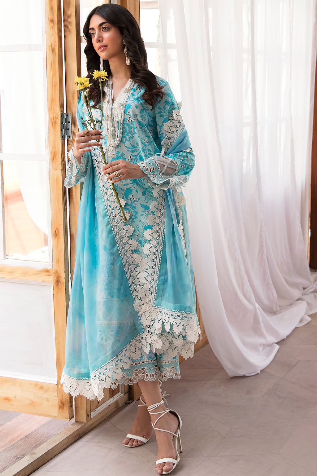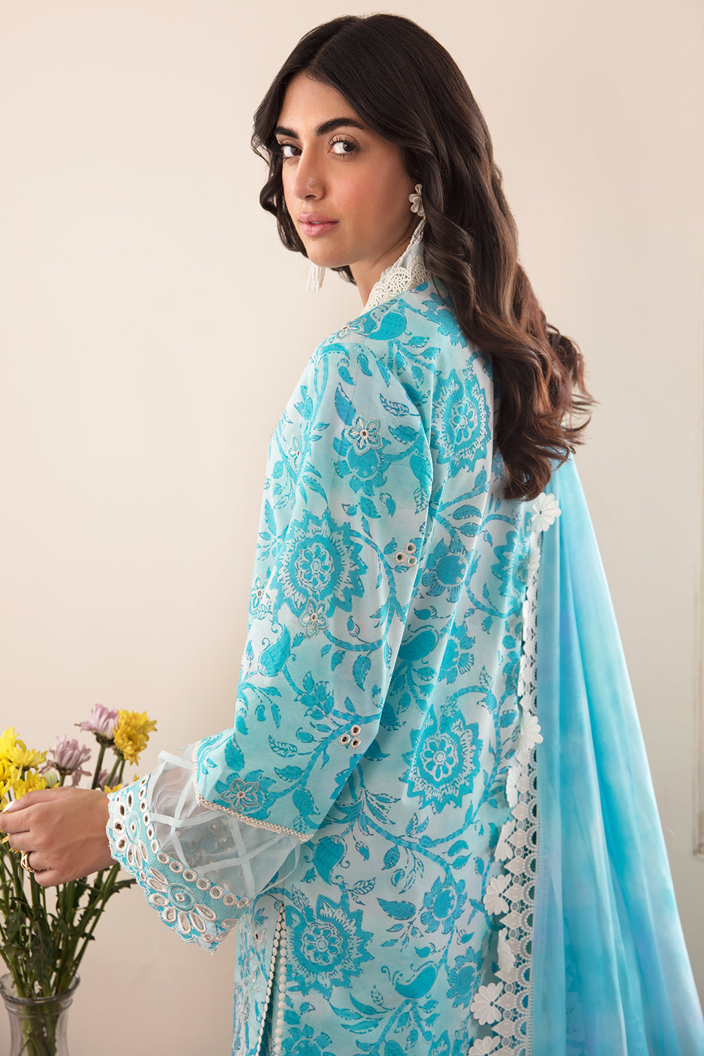Fabric: LAWN DIGITAL PRINTED EMBROIDERED FRONT (1 PC) LAWN DIGITAL PRINTED BACK (1.14 M) LAWN DIGITAL PRINTED EMBROIDERED SLEEVES (0.66 M) ORGANZA EMBROIDERED SLEEVES + TROUSER BORDER (1.97 M) SILK DIGITAL PRINTED DUPATTA (2.38 M) COTTON DIGITAL PRINTED TROUSER (2.28 M) |
