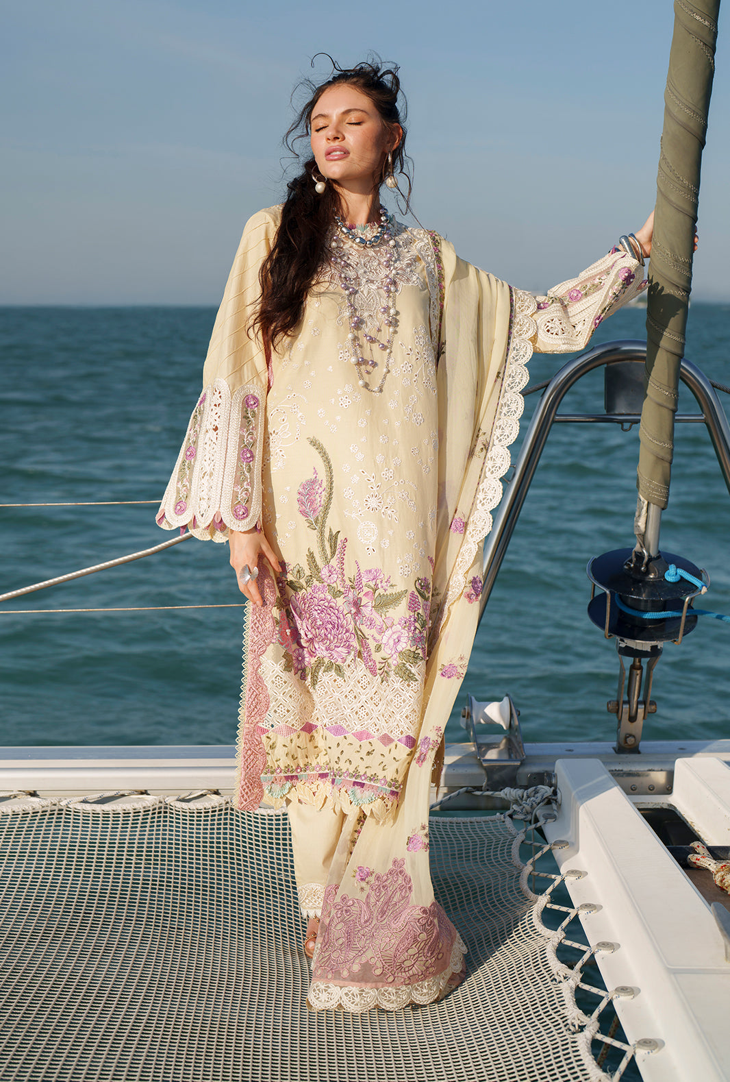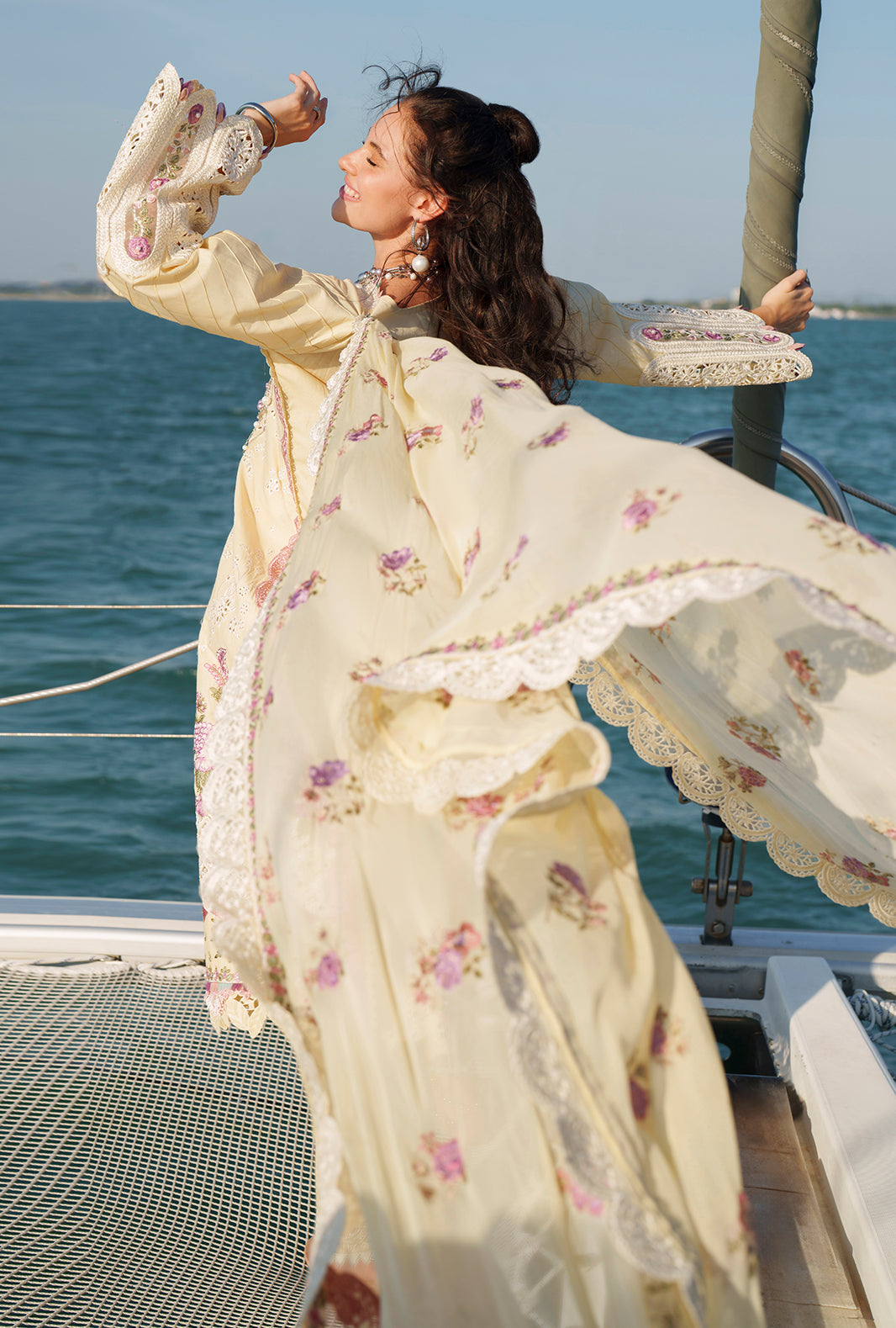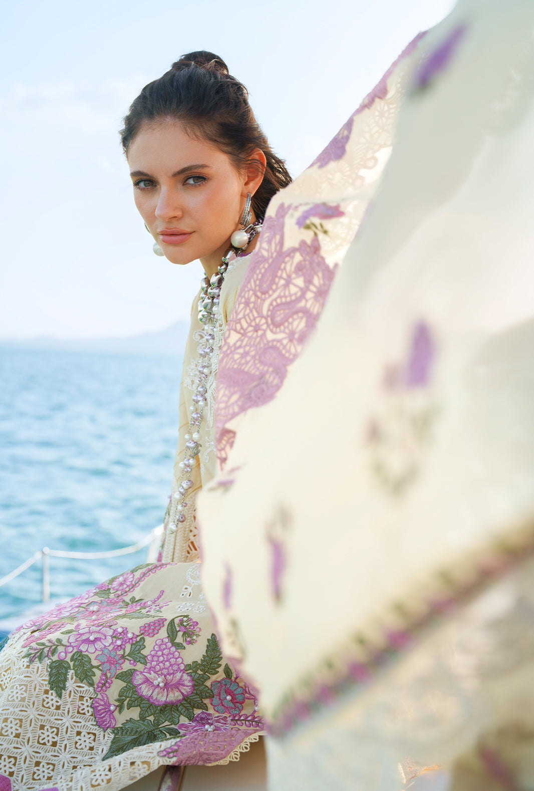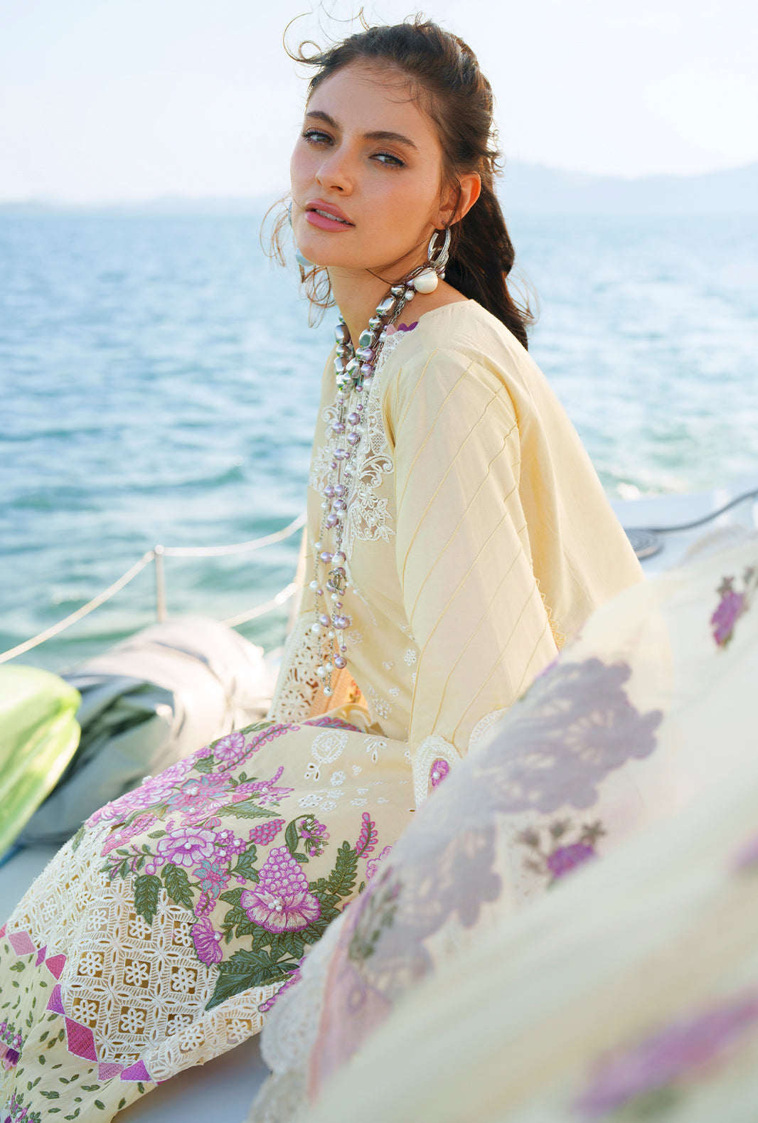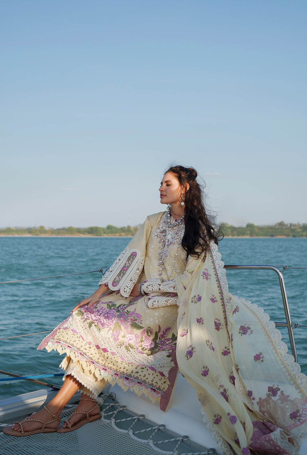 Summary: Radiate summer elegance with the 'Faria' ensemble from AJR Couture's Evara Luxury Lawn collection. This exquisite Pakistani suit features a pale yellow lawn kameez adorned with intricate chikankari embroidery and delicate organza detailing on the neckline and borders. The breathable lawn fabric makes it ideal for the hot season, while the contrasting purple floral motifs add a vibrant, festive touch. Paired with a sheer, embroidered chiffon dupatta and refined cambric trousers, this outfit balances comfort with luxury. Its soft yellow hue is perfectly suited for a Haldi ceremony, Eid celebration, or chic daytime event. Shop this premium unstitched dress material for a timeless ethnic look.