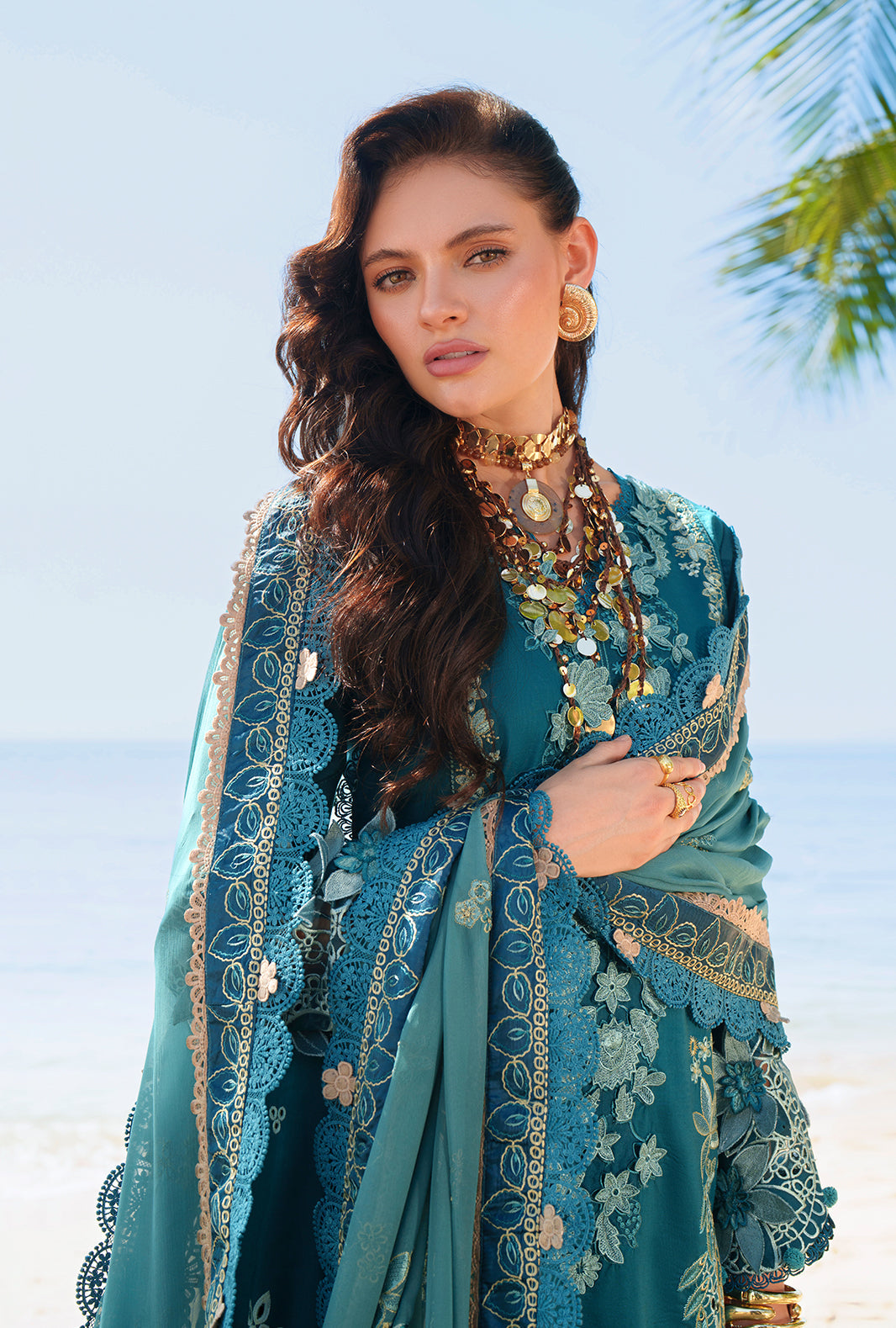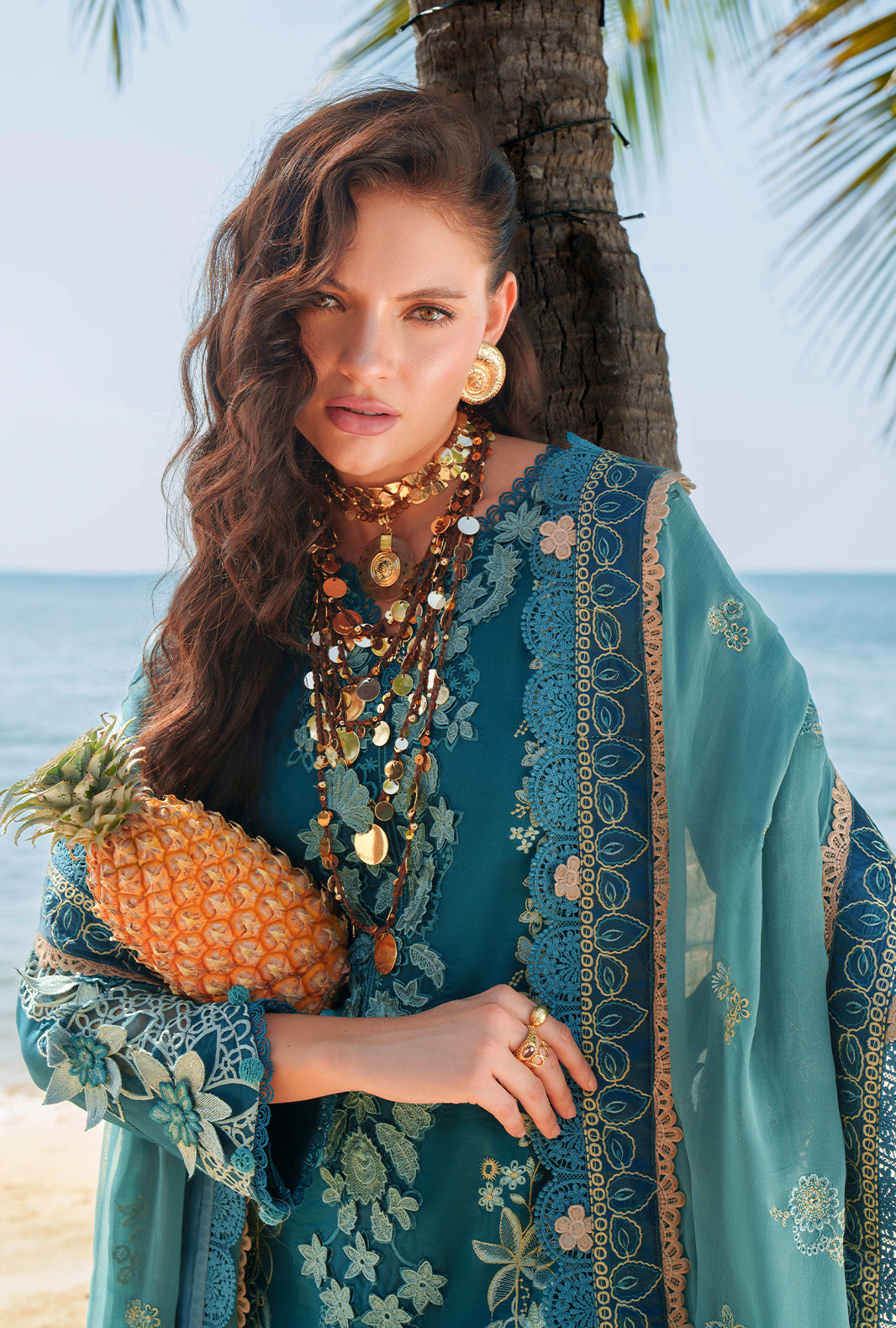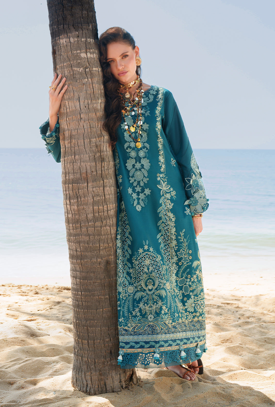 Summary: Radiate elegance in this Teal Pakistani Lawn Suit from the Evara Luxury collection, designed to captivate. The ensemble highlights a premium lawn kameez adorned with intricate Chikankari embroidery, 3D floral sleeve accents, and a delicate organza neckline that exudes sophistication. Perfectly paired with a lightweight, embroidered chiffon dupatta and solid cambric trousers, this 3-piece unstitched dress offers breathable comfort for the Spring/Summer season. The deep teal hue provides a refreshing yet regal look, making it an ideal choice for Eid celebrations, garden parties, or festive day events. Shop online to add this timeless ethnic wear masterpiece to your wardrobe.