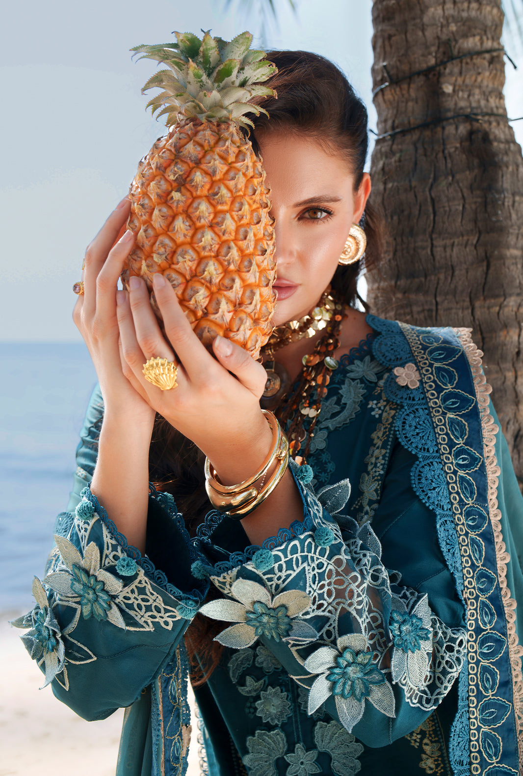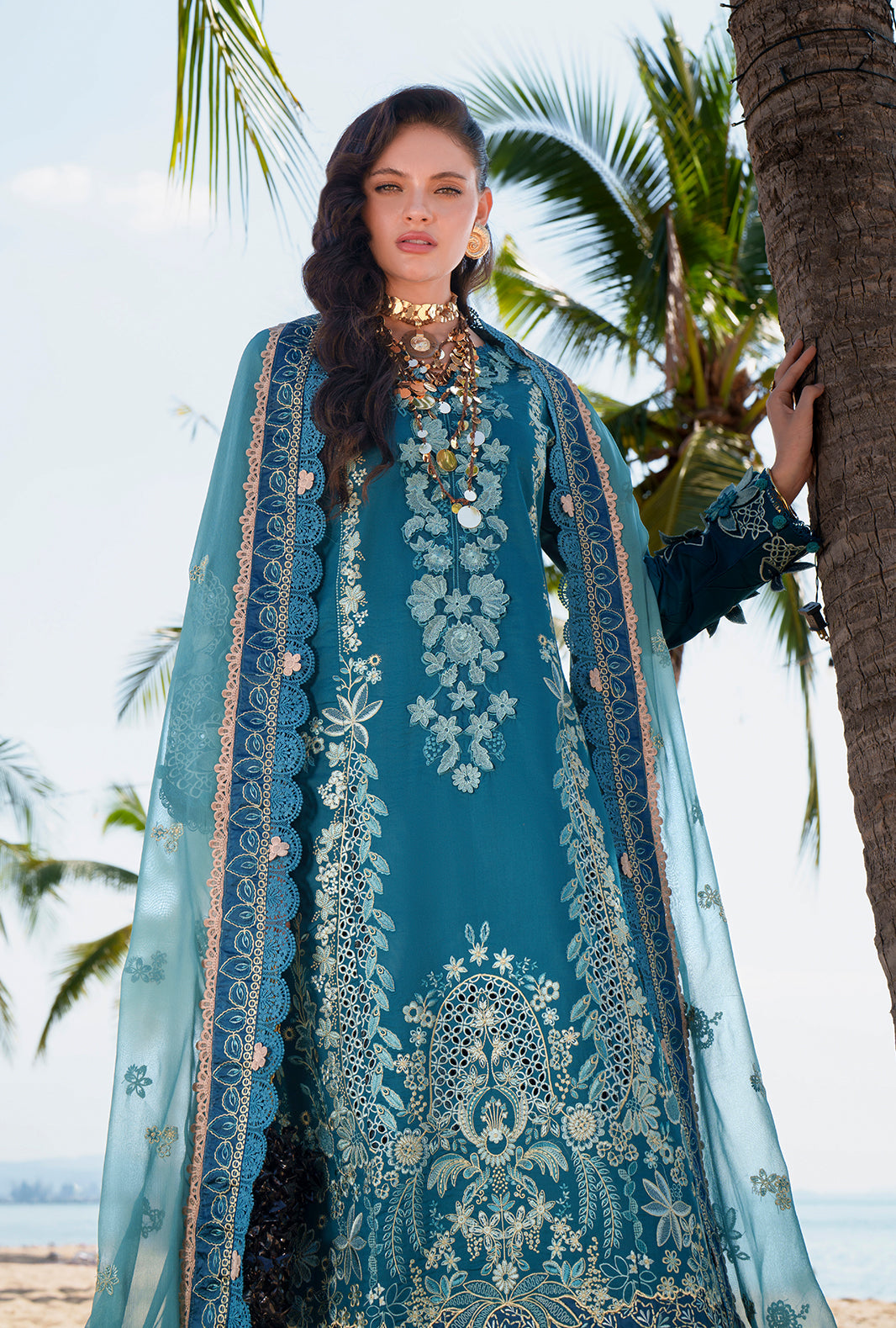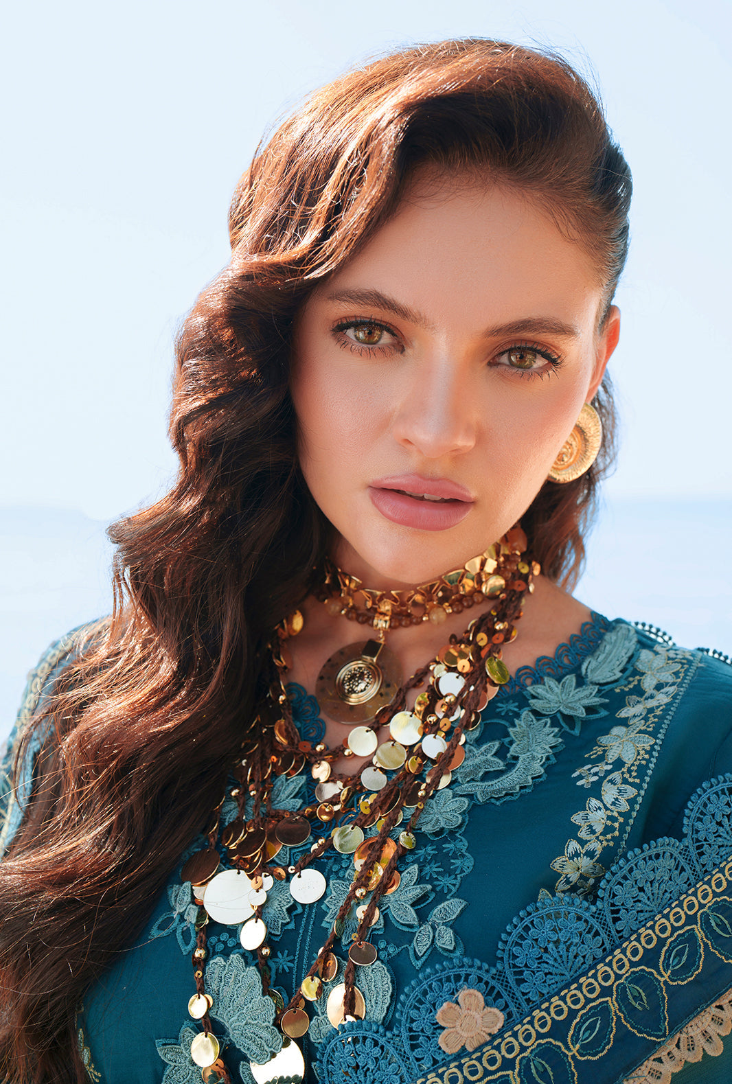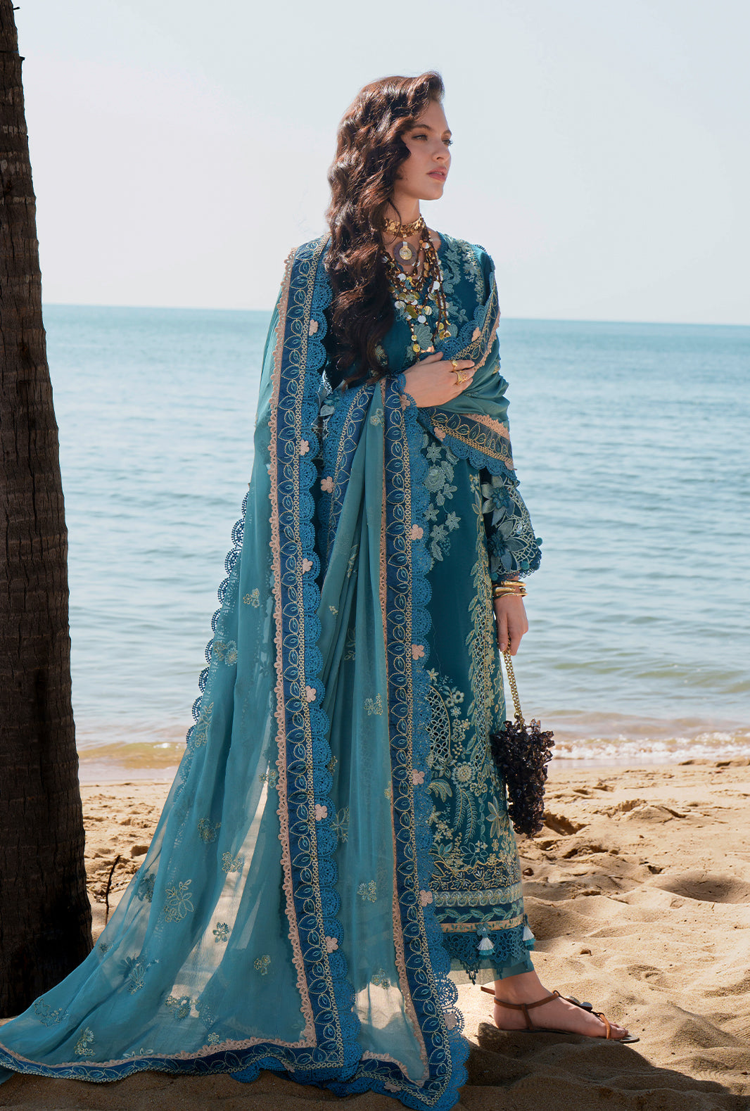 Summary: Radiate elegance in this Teal Pakistani Lawn Suit from the Evara Luxury collection, designed to captivate. The ensemble highlights a premium lawn kameez adorned with intricate Chikankari embroidery, 3D floral sleeve accents, and a delicate organza neckline that exudes sophistication. Perfectly paired with a lightweight, embroidered chiffon dupatta and solid cambric trousers, this 3-piece unstitched dress offers breathable comfort for the Spring/Summer season. The deep teal hue provides a refreshing yet regal look, making it an ideal choice for Eid celebrations, garden parties, or festive day events. Shop online to add this timeless ethnic wear masterpiece to your wardrobe.