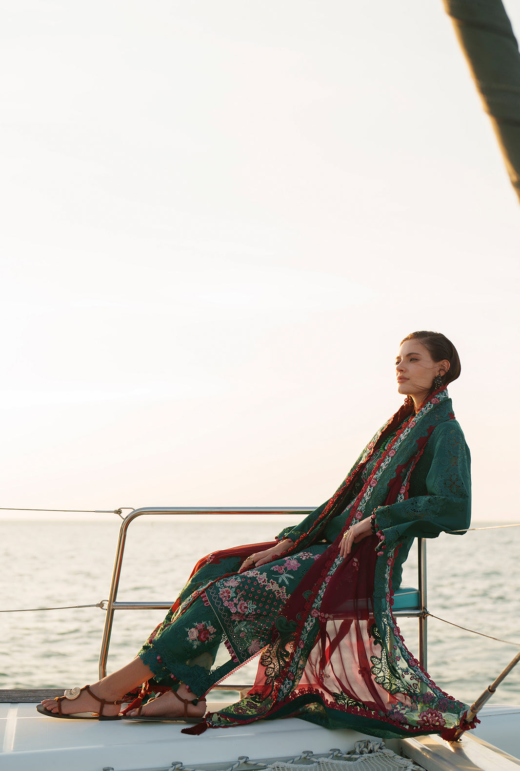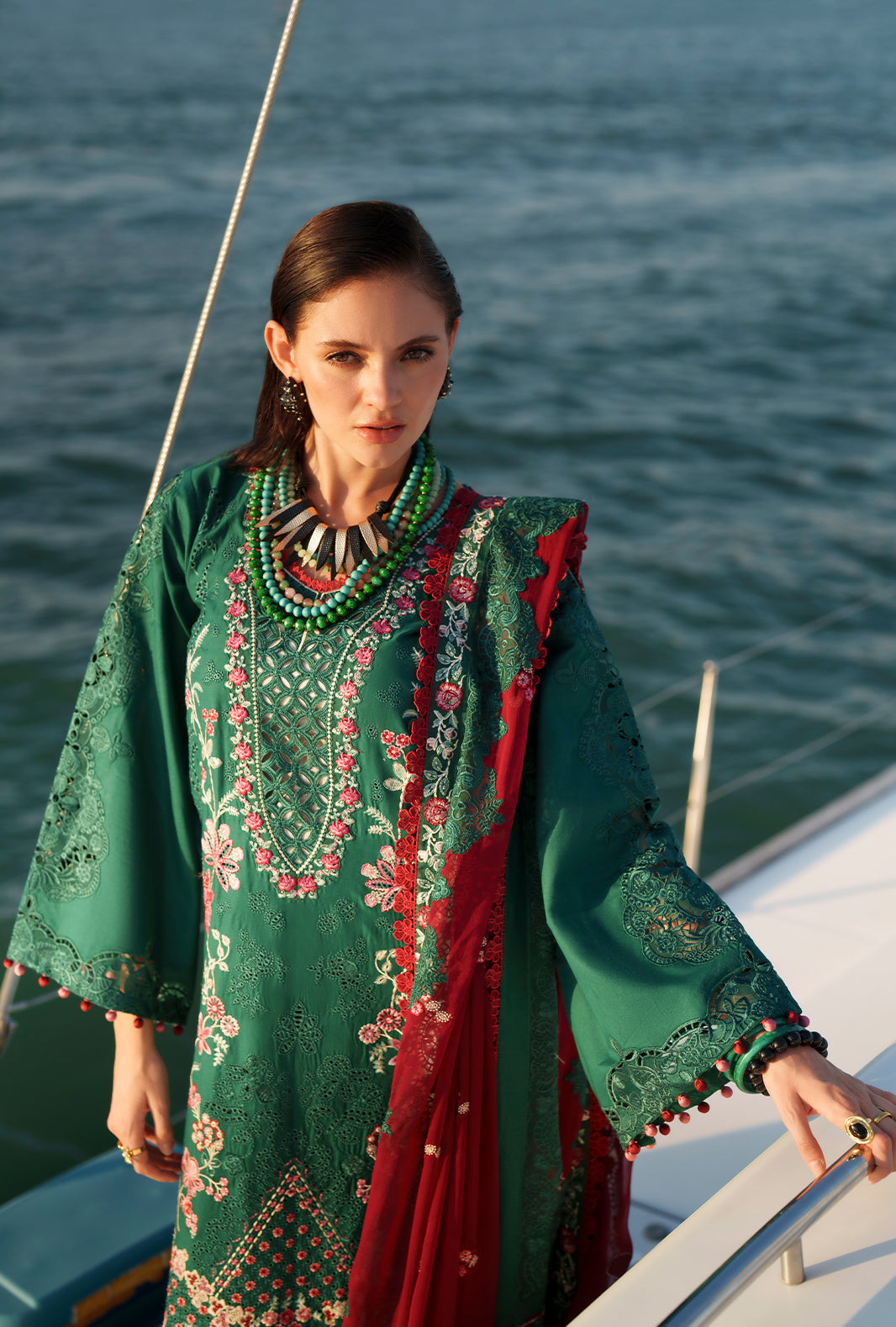 Summary: Step into summer elegance with the AJR Evara Luxury Lawn 'Yara' suit. This stunning Pakistani dress features a rich green chikankari embroidered lawn kameez, beautifully accented with intricate organza detailing on the neckline and borders. The ensemble is brought to life with vibrant pink floral motifs and paired with a contrasting maroon embroidered chiffon dupatta that exudes sophistication. Complete with dyed cambric trousers, this unstitched dress material is breathable yet luxurious. Ideal for Eid festivities, daytime weddings, or casual gatherings, this green lawn suit perfectly blends traditional craftsmanship with modern style. Shop this must-have summer party wear outfit online.