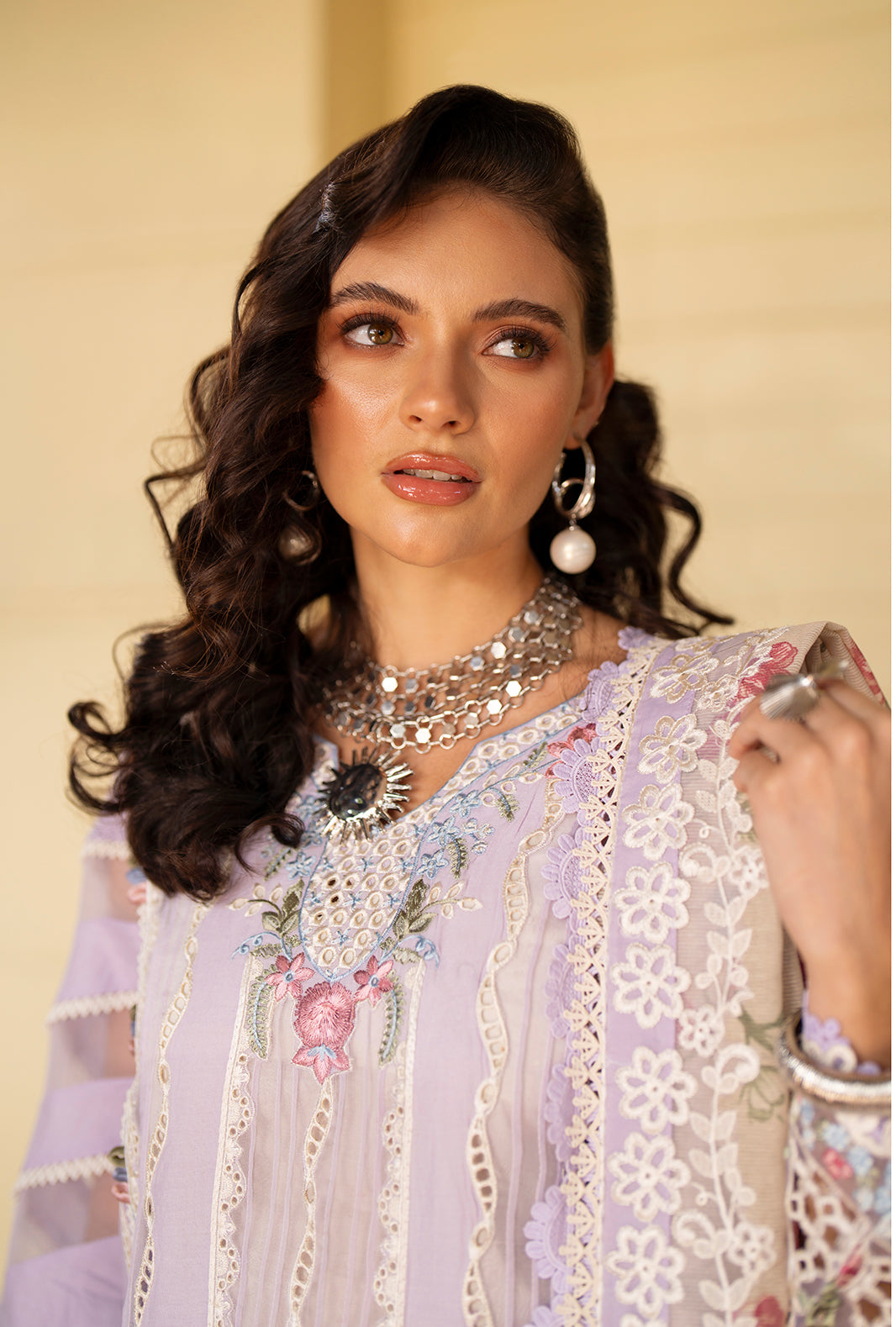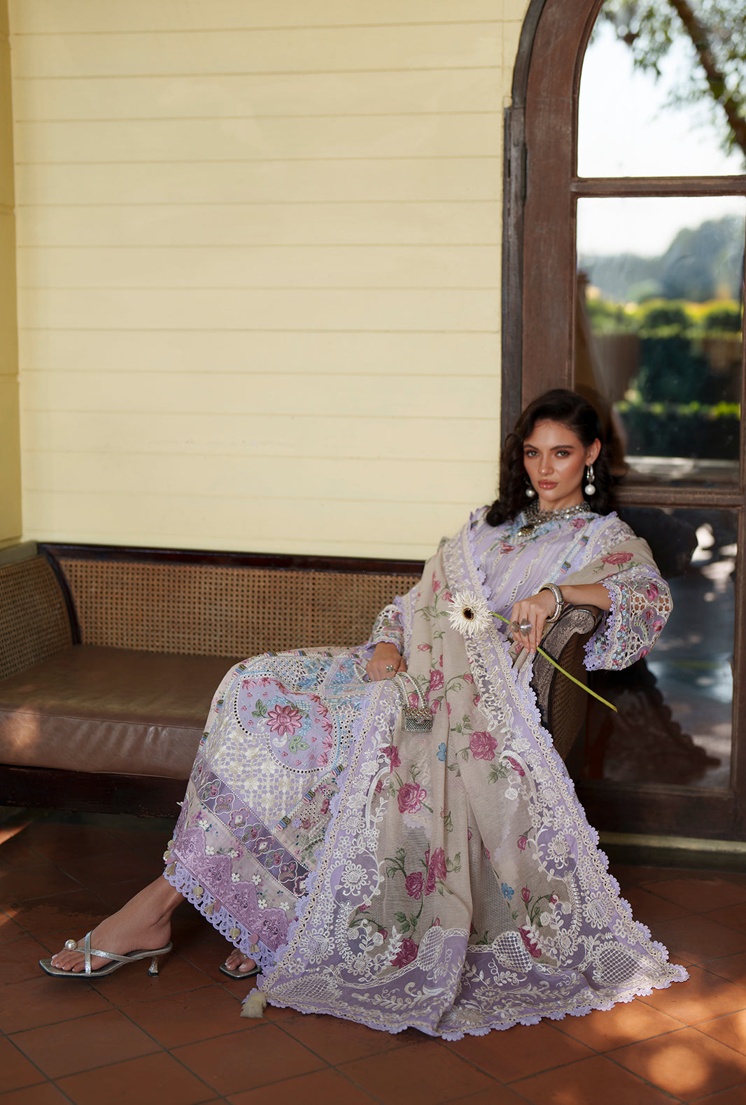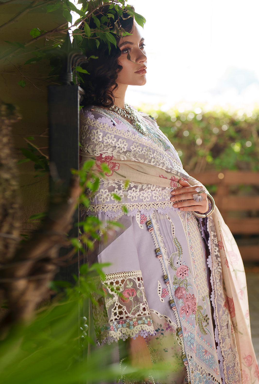Summary: Radiate elegance in the 'Zaya' ensemble from AJR Couture's Evara Luxury Lawn collection. This exquisite Pakistani suit features a breathtaking lavender lawn shirt adorned with intricate Chikankari embroidery and refined floral motifs. The look is elevated with delicate organza borders and panel detailing, showcasing master craftsmanship. Paired with a digital printed cotton karandi dupatta in soft floral hues and dyed cambric trousers, this unstitched dress material is the epitome of summer sophistication. The soothing lavender shade makes it a perfect choice for daytime festivities, Eid celebrations, or semi-formal garden parties. Shop this luxurious Pakistani lawn suit online to add a touch of grace to your ethnic wardrobe.