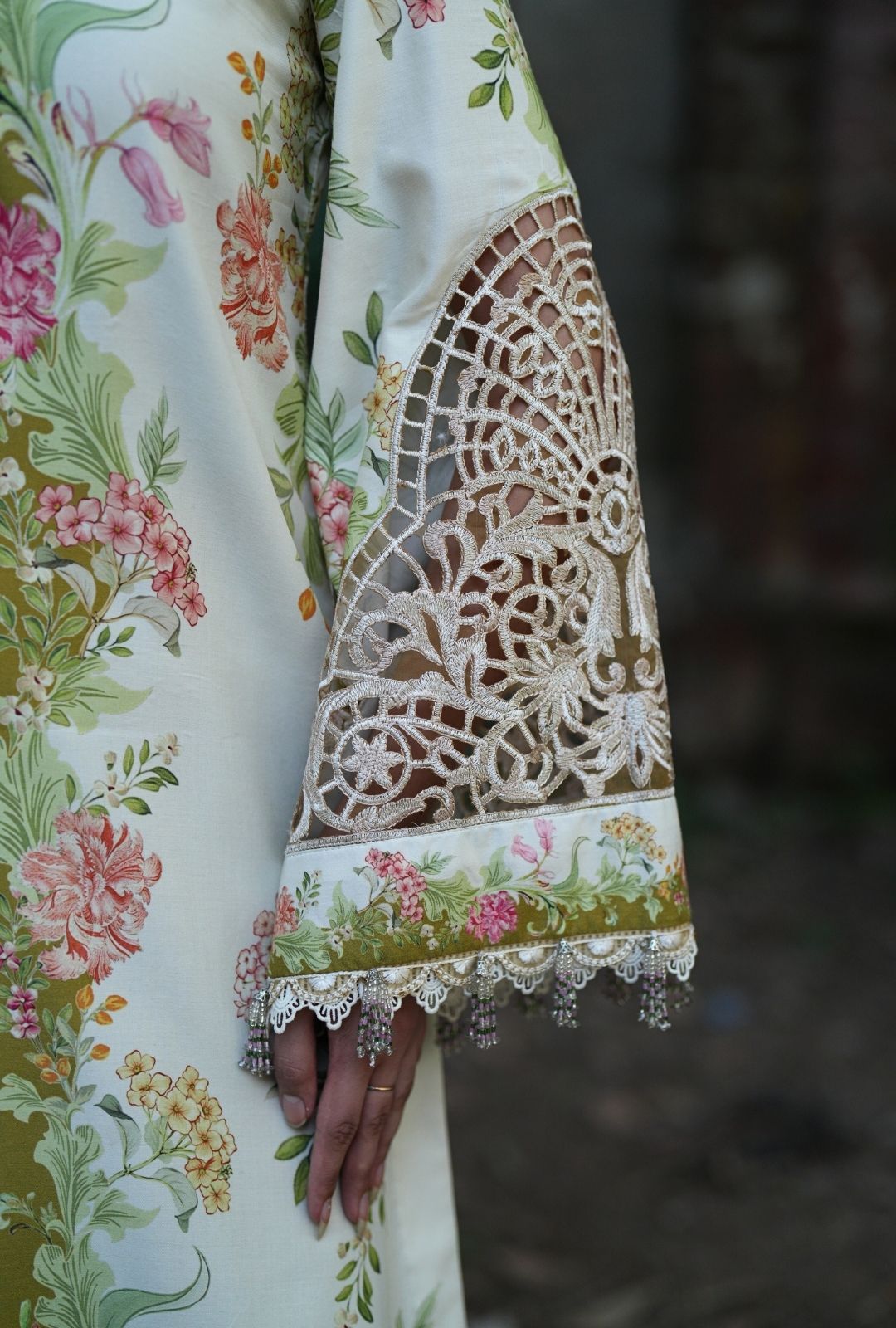 Fabric: A digitally printed shirt paired with a matching printed trouser, designed to capture effortless sophistication in every thread. The look is elevated with an embroidered organza neckline patti, delicate sleeves border, and an intricately embroidered daman border — a true celebration of detail and artistry. Wrapped in a woolen printed shawl, Gulrukh blooms with elegance, warmth, and timeless allure. Digital printed linen shirt Digital printed linen trouser Woolen printed shawl Embroidered organza neckline patti 1 Embroidered organza neckline patti 2 Embroidered organza daman border Embroidered organza sleeves motives |