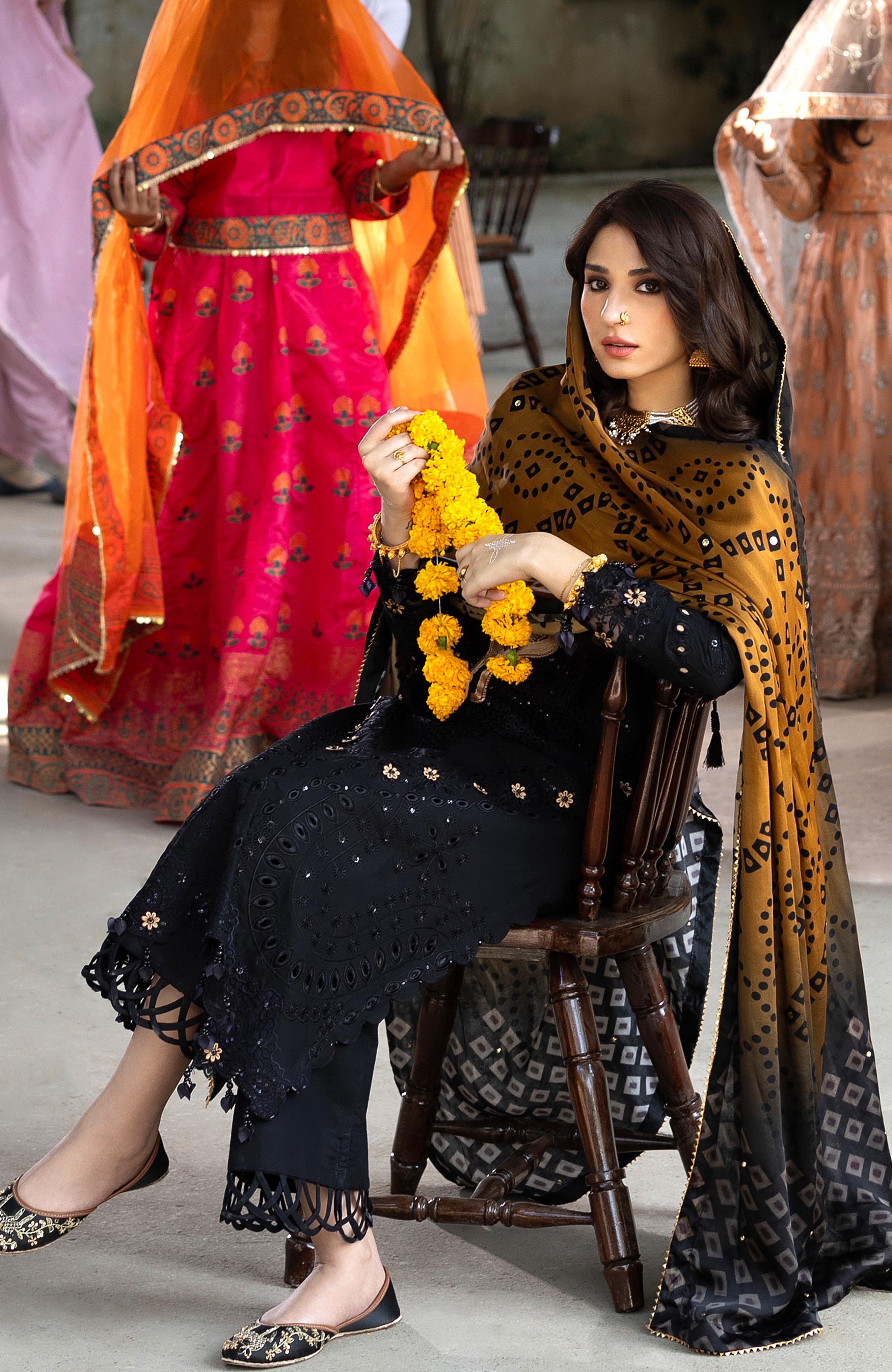 Summary: Embrace timeless elegance with this black Pakistani suit from the Al Zohaib Bandhani Lawn collection. Crafted from premium lawn fabric, this summer outfit is a masterpiece of design. The kameez features exquisite Chikankari embroidery across the front and sleeves, delicately highlighted with 3MM sequin work for a subtle shimmer. Intricate appliquéd details on the body and 3D floral motifs add depth and a luxurious feel. The sophisticated black hue makes this ethnic wear a perfect choice for evening functions and festive gatherings, offering both comfort and style. Ideal for Eid or as a wedding guest dress.