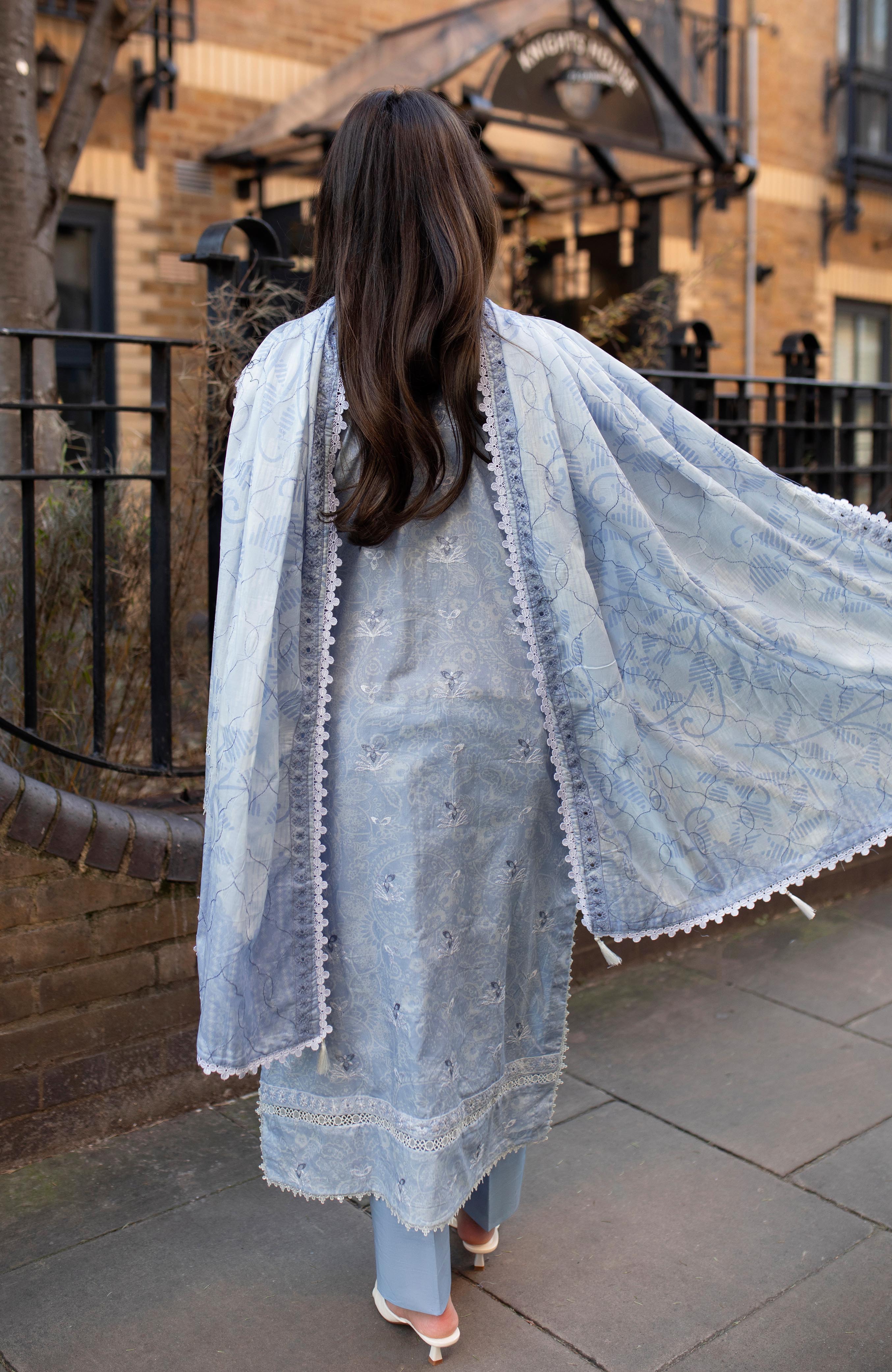Fabric: Digital Printed Embroidered Front Digital Printed Embroidered Back Digital Printed Embroidered Sleeves Digital Printed Full Embroidered Scalloped Lawn Dupatta Dyed Trouser |